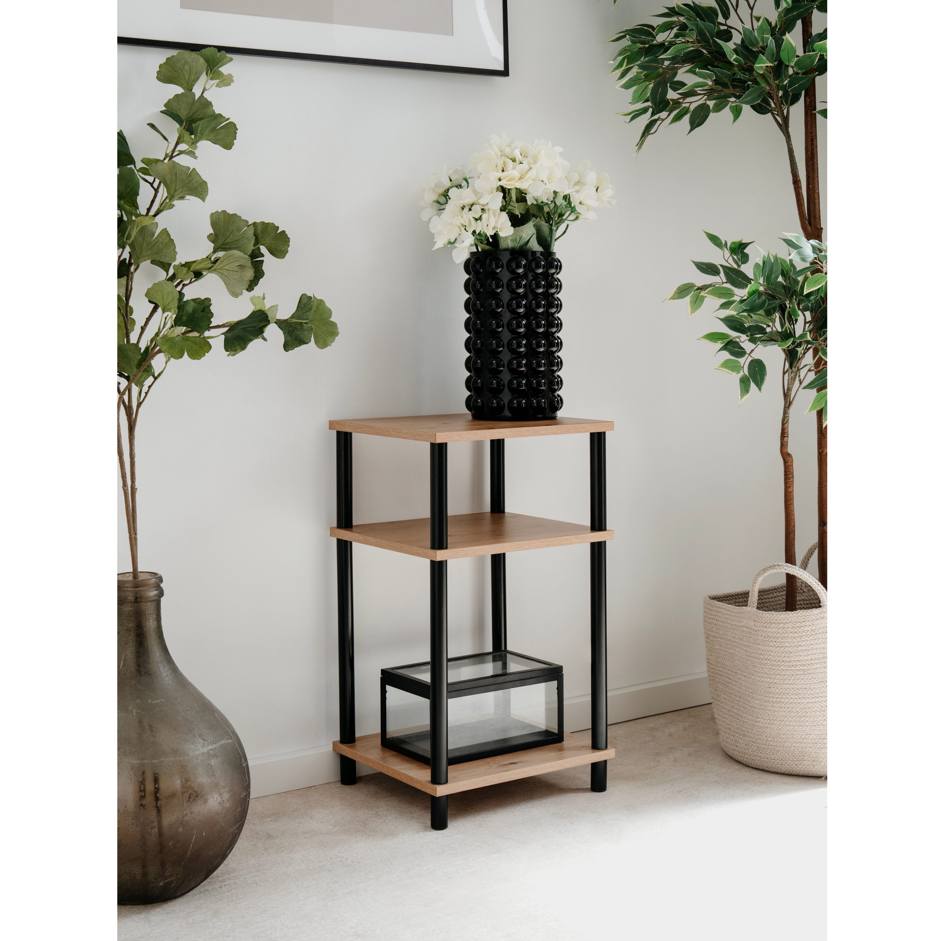 Vyhotovenie s 3 odkladacími plochami ponúka dostatok úložného priestoru bez zbytočnej mohutnosti. Vrchná doska poslúži na dekorácie, lampu alebo každodenné drobnosti, zatiaľ čo police prehľadne usporiadajú knihy, boxy či ďalšie doplnky. Otvorená konštrukcia zachováva vzdušný vzhľad a umožňuje jednoduchý prístup ku všetkým uloženým predmetom.