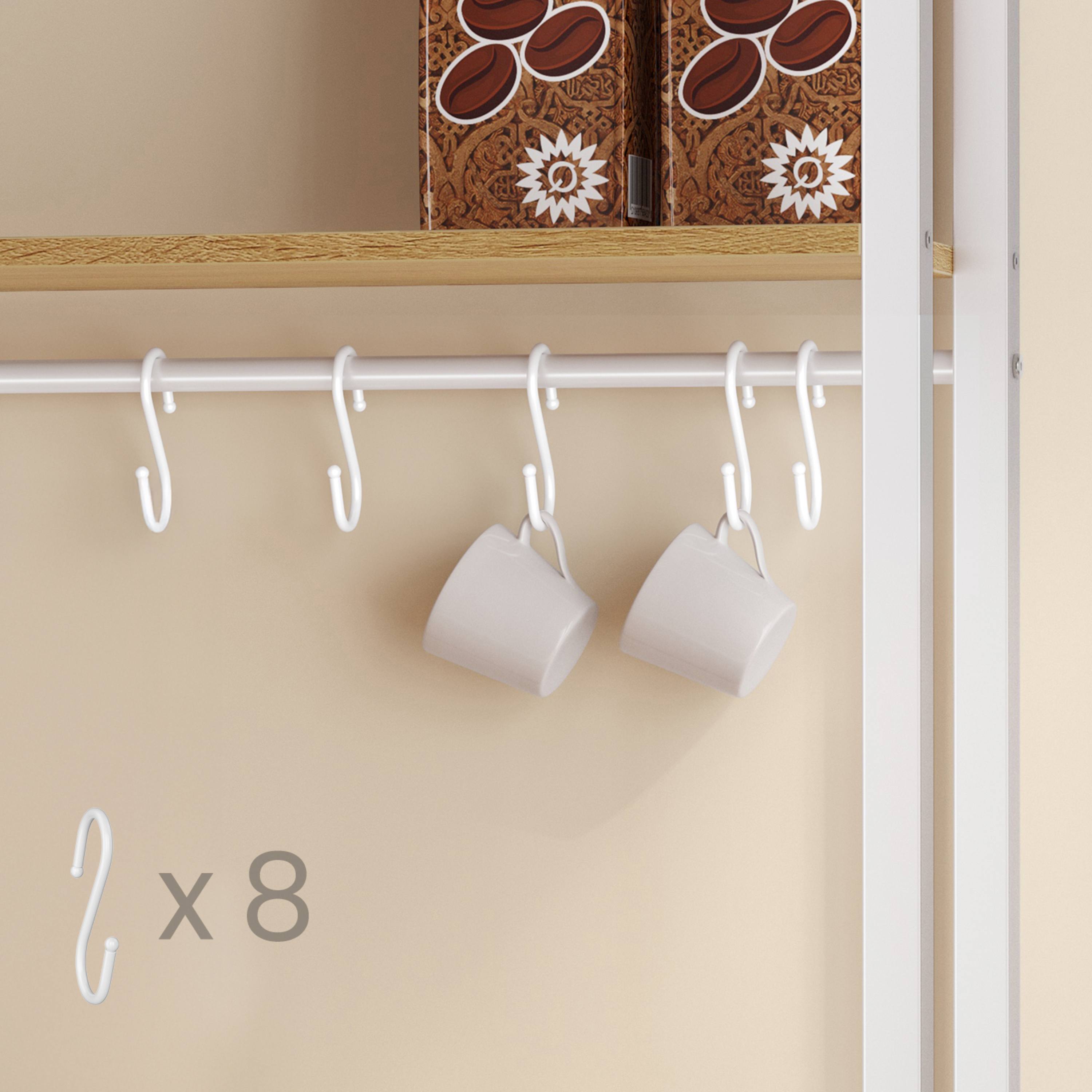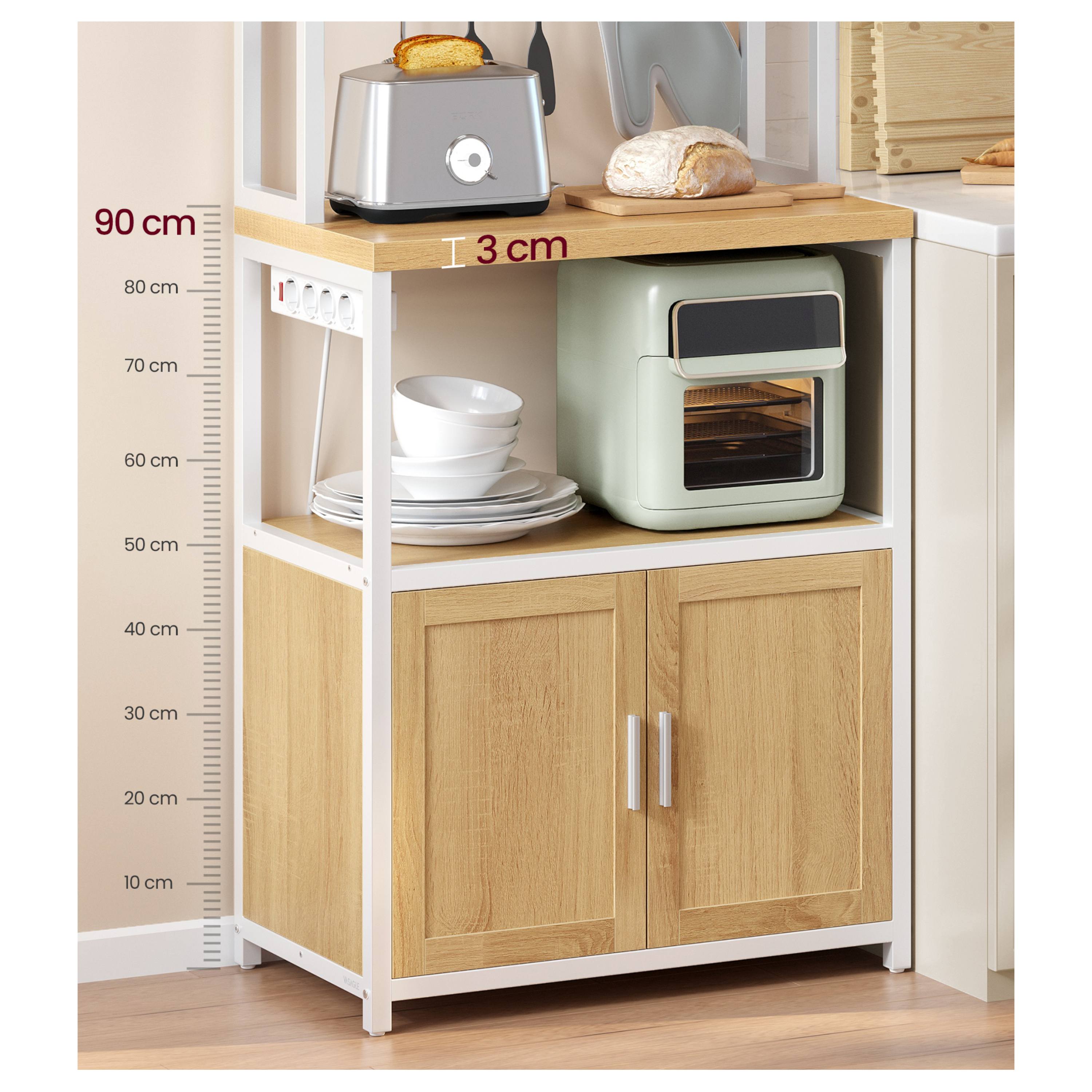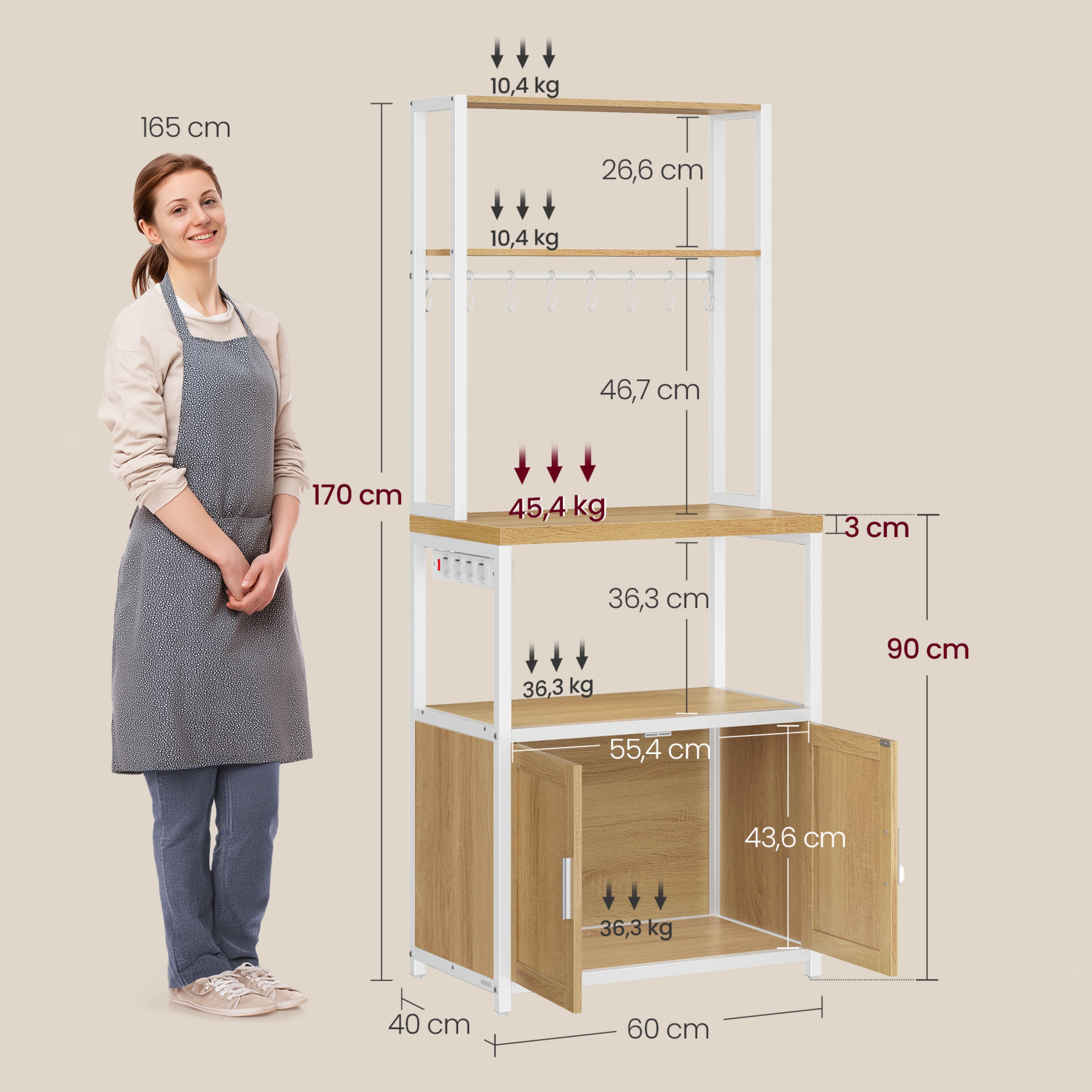 Disponuje 2 menšími policami ideálnymi na koreniny, riad či dózy s potravinami. Má pracovnú plochu, ktorú možno využiť na umiestnenie kávovaru, toastovača a iných spotrebičov. Ďalej je k dispozícii skrinka s veľkým úložným priestorom za 2 otočnými dvierkami. Nad skrinkou sa nachádza ideálne miesto na mikrovlnku či mini rúru. Regál je vybavený 6 elektrickými zásuvkami s vypínačom, ktoré uľahčujú pripojenie spotrebičov. Súčasťou balenia je 8 závesných S háčikov na utierky, chňapky alebo kuchynské náčinie.