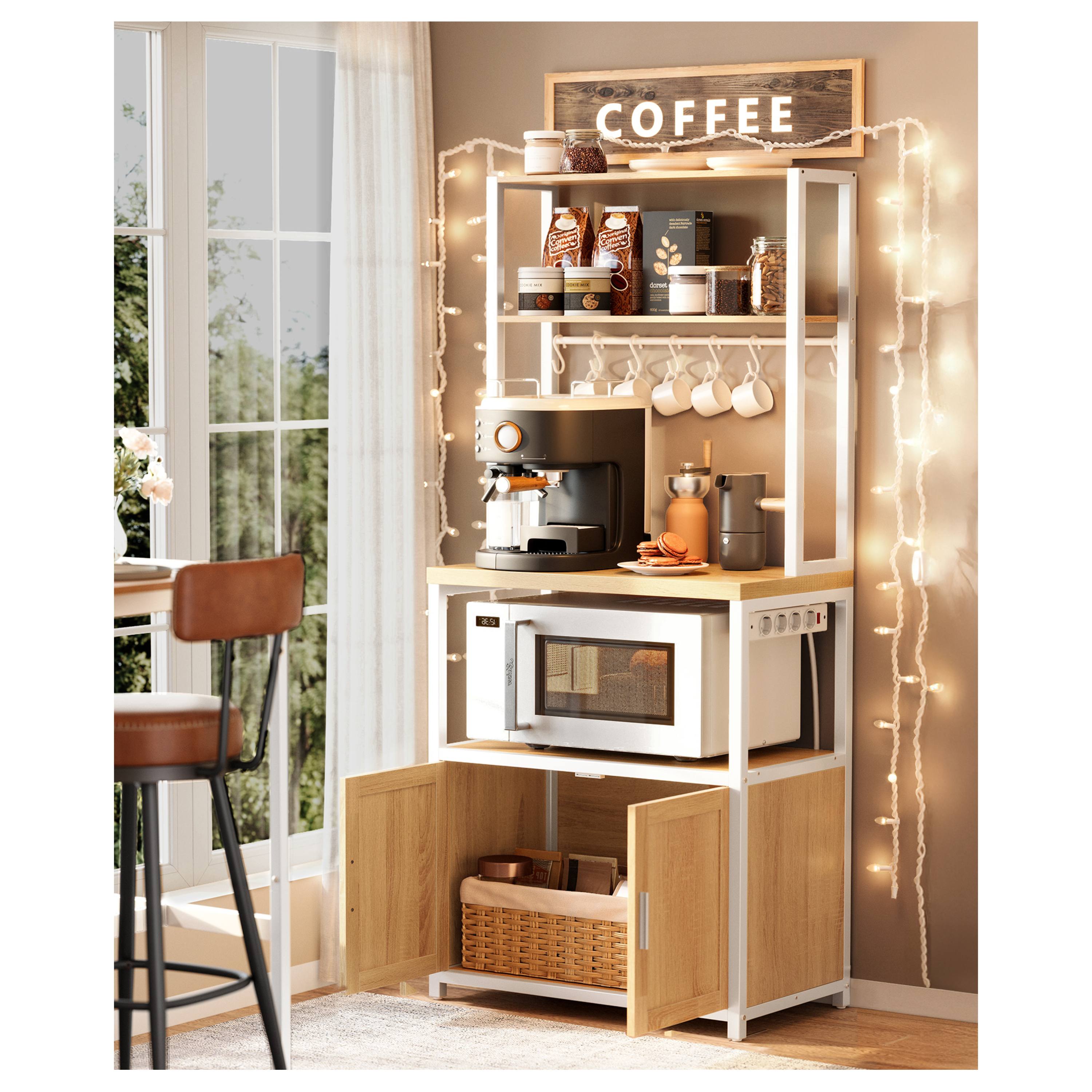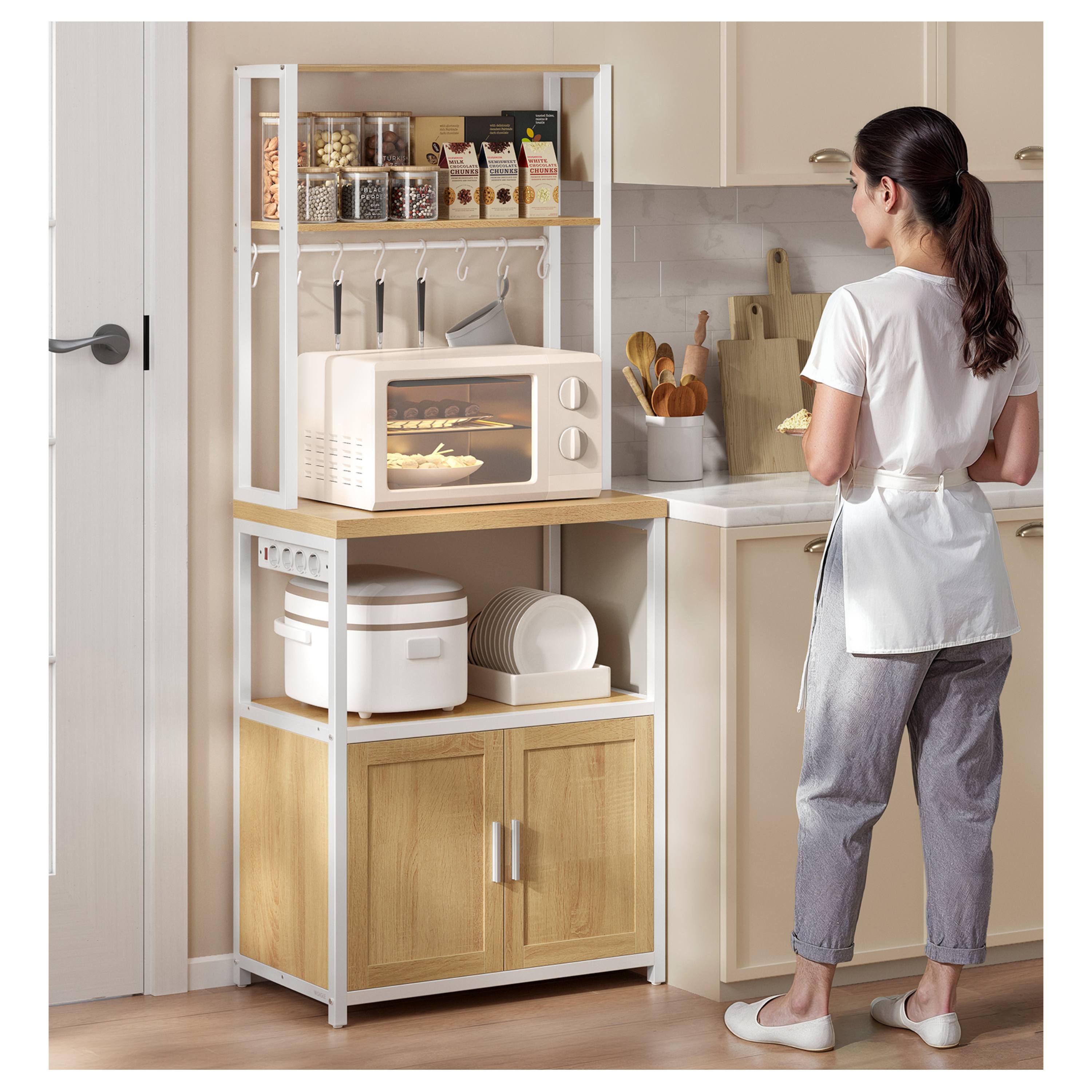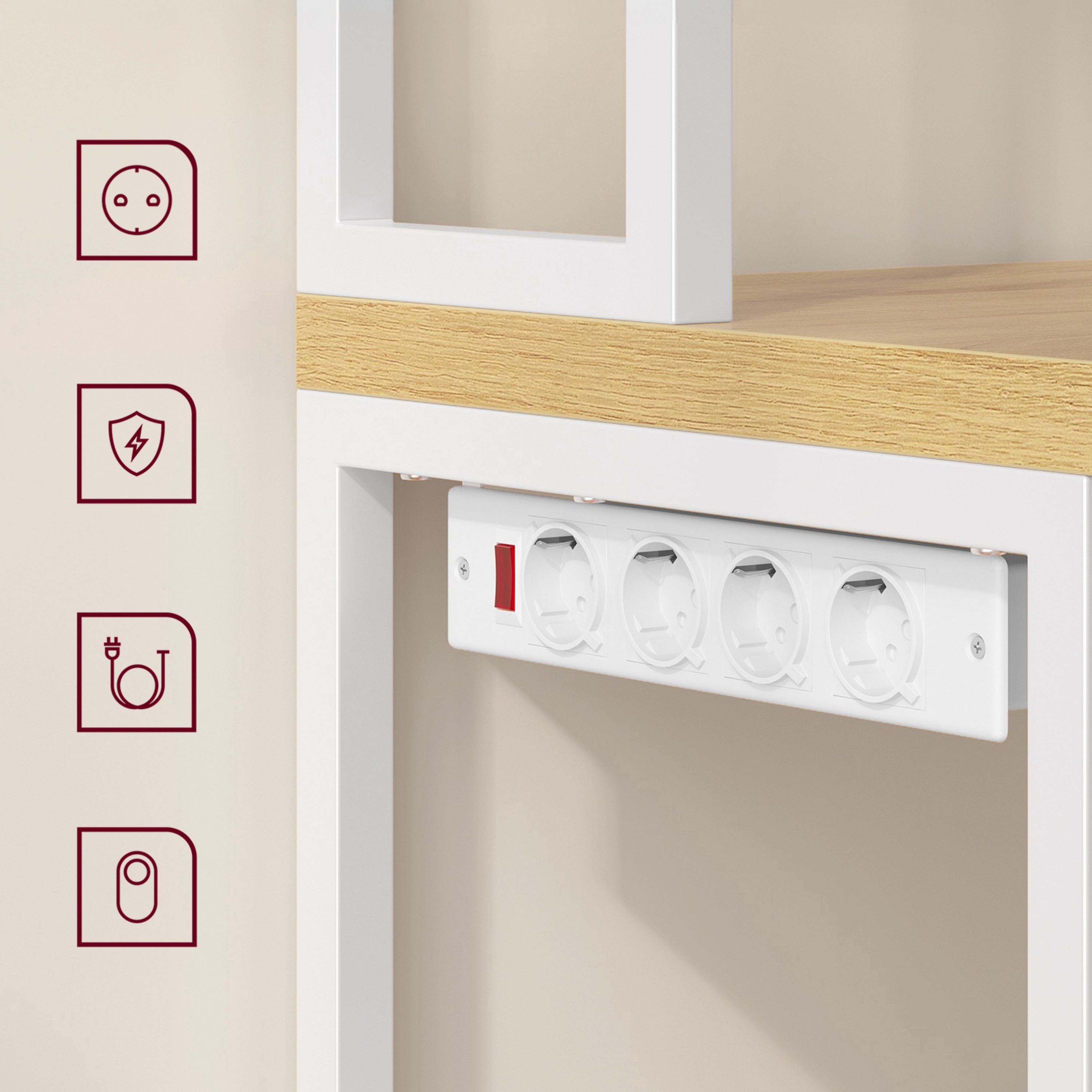 Disponuje 2 menšími policami ideálnymi na koreniny, riad či dózy s potravinami. Má pracovnú plochu, ktorú možno využiť na umiestnenie kávovaru, toastovača a iných spotrebičov. Ďalej je k dispozícii skrinka s veľkým úložným priestorom za 2 otočnými dvierkami. Nad skrinkou sa nachádza ideálne miesto na mikrovlnku či mini rúru. Regál je vybavený 6 elektrickými zásuvkami s vypínačom, ktoré uľahčujú pripojenie spotrebičov. Súčasťou balenia je 8 závesných S háčikov na utierky, chňapky alebo kuchynské náčinie.