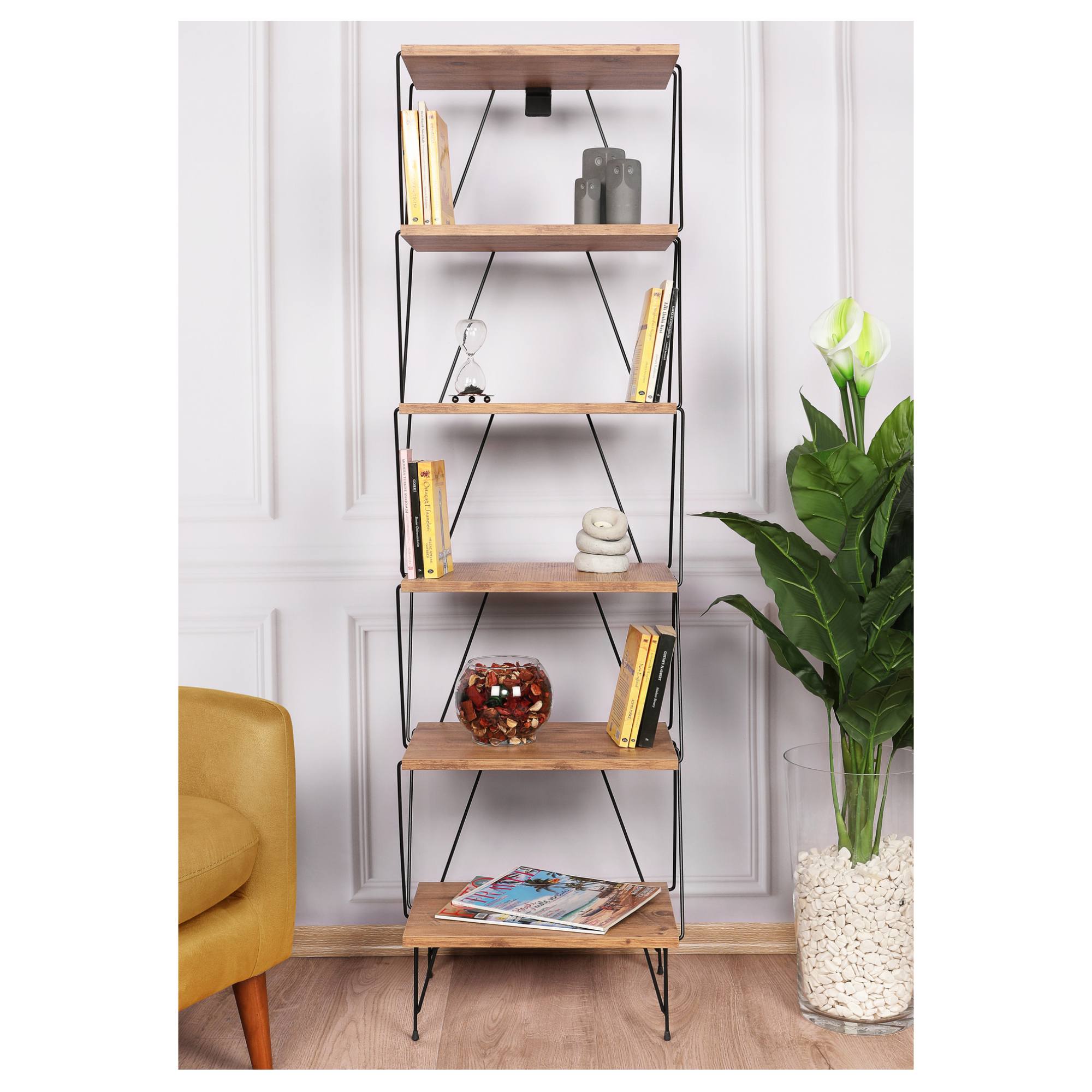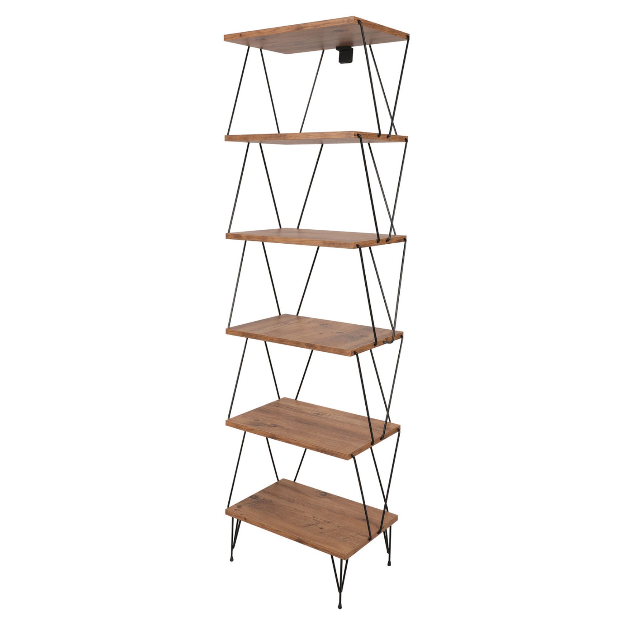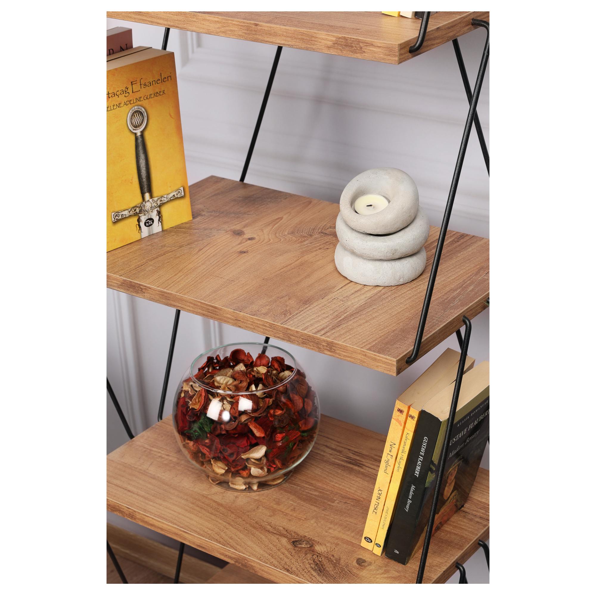 Má kovovú konštrukciu v čiernej farbe, ktorá pôsobí veľmi vzdušne. Odľahčí váš priestor a nezmenší opticky miestnosť. Disponuje 5 policami na vaše knihy, časopisy, dekorácie a rastliny. Industriálny dizajn dotvára dekor borovice, ktorý verne imituje prírodnú kresbu dreva. Je vyrobený z laminovanej drevotrieskovej dosky, ktorá zaisťuje jeho ľahkú údržbu. Je možné ho pripevniť k stene pre väčšiu stabilitu a bezpečnosť.