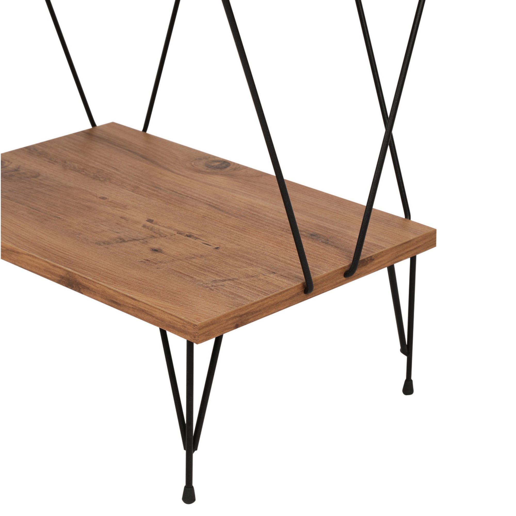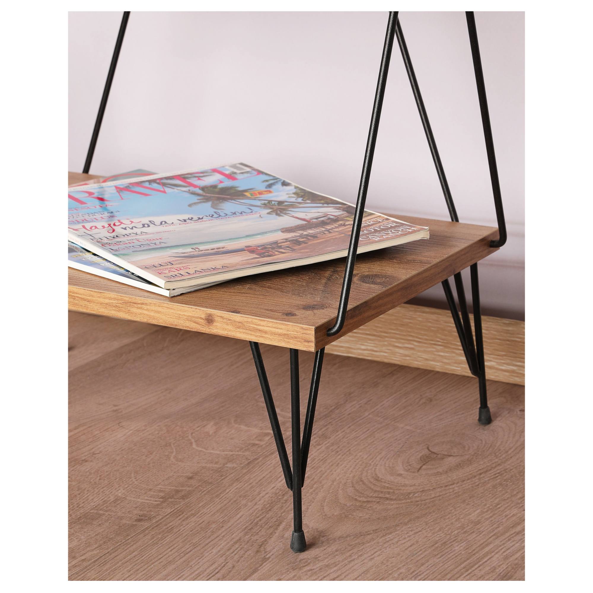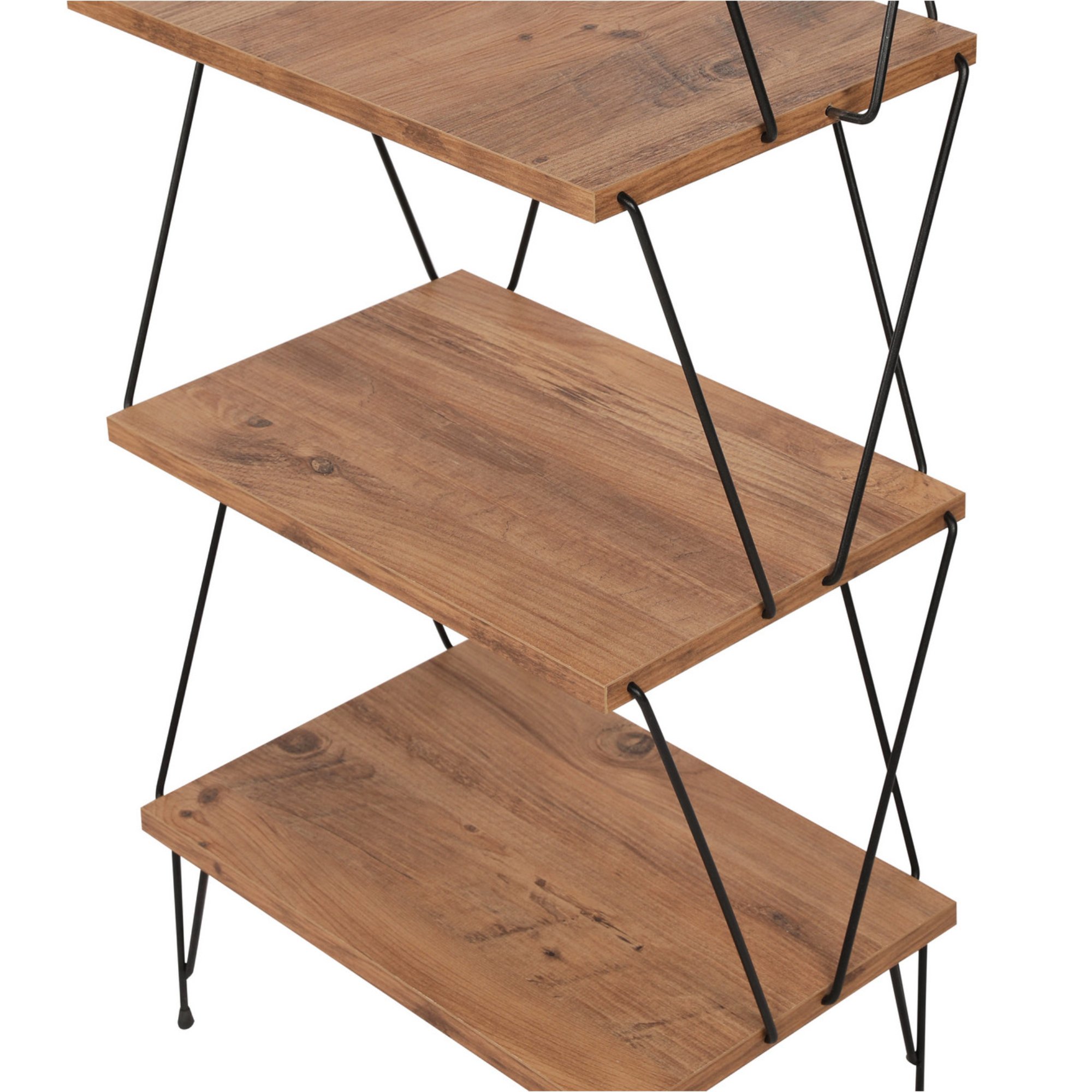 Má kovovú konštrukciu v čiernej farbe, ktorá pôsobí veľmi vzdušne. Odľahčí váš priestor a nezmenší opticky miestnosť. Disponuje 5 policami na vaše knihy, časopisy, dekorácie a rastliny. Industriálny dizajn dotvára dekor borovice, ktorý verne imituje prírodnú kresbu dreva. Je vyrobený z laminovanej drevotrieskovej dosky, ktorá zaisťuje jeho ľahkú údržbu. Je možné ho pripevniť k stene pre väčšiu stabilitu a bezpečnosť.