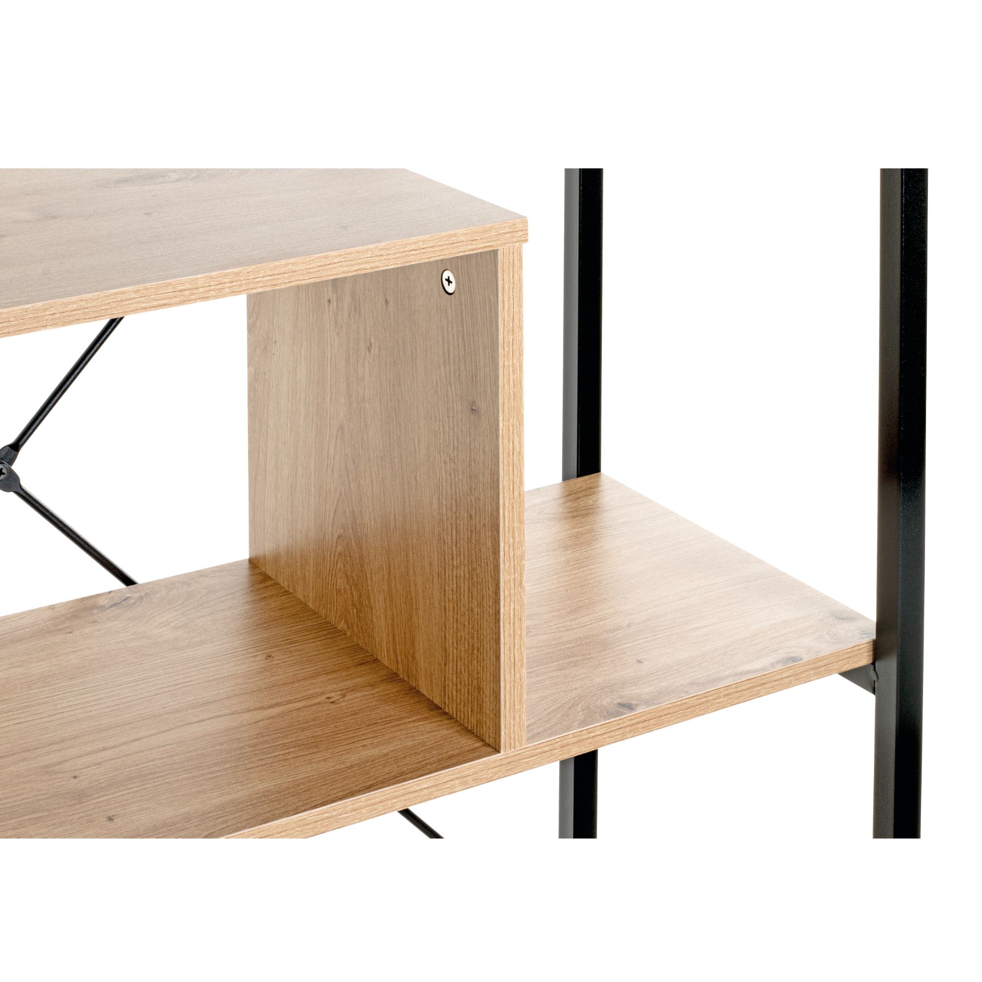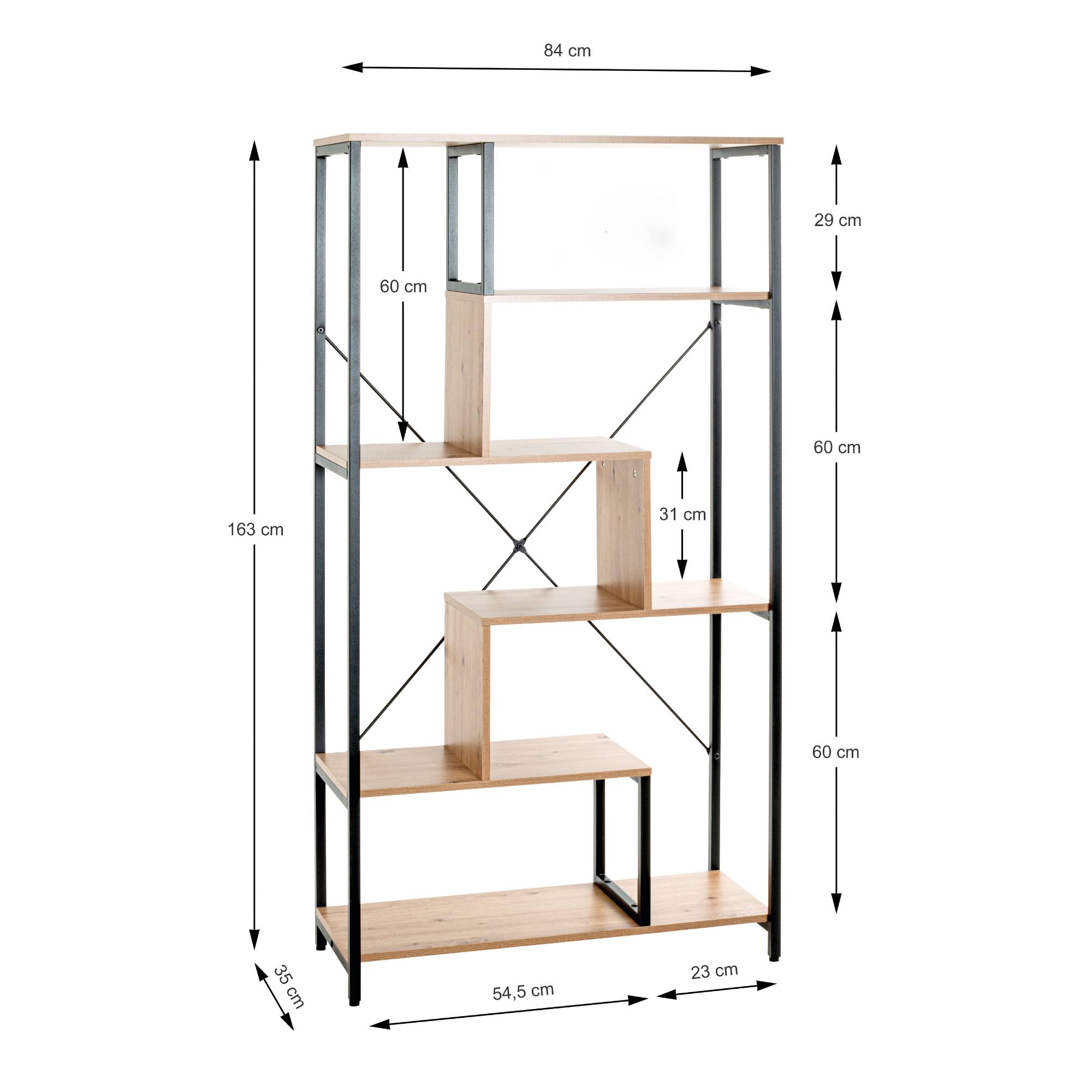 Pevnú kovovú konštrukciu dopĺňajú police z drevovláknitého materiálu MDF. Pretože regál ponúka dostatok odkladacieho priestoru, uložíte doň nielen obľúbené knihy a šanóny s dokumentmi, ale môžete ho ozdobiť aj štýlovými dekoráciami.
