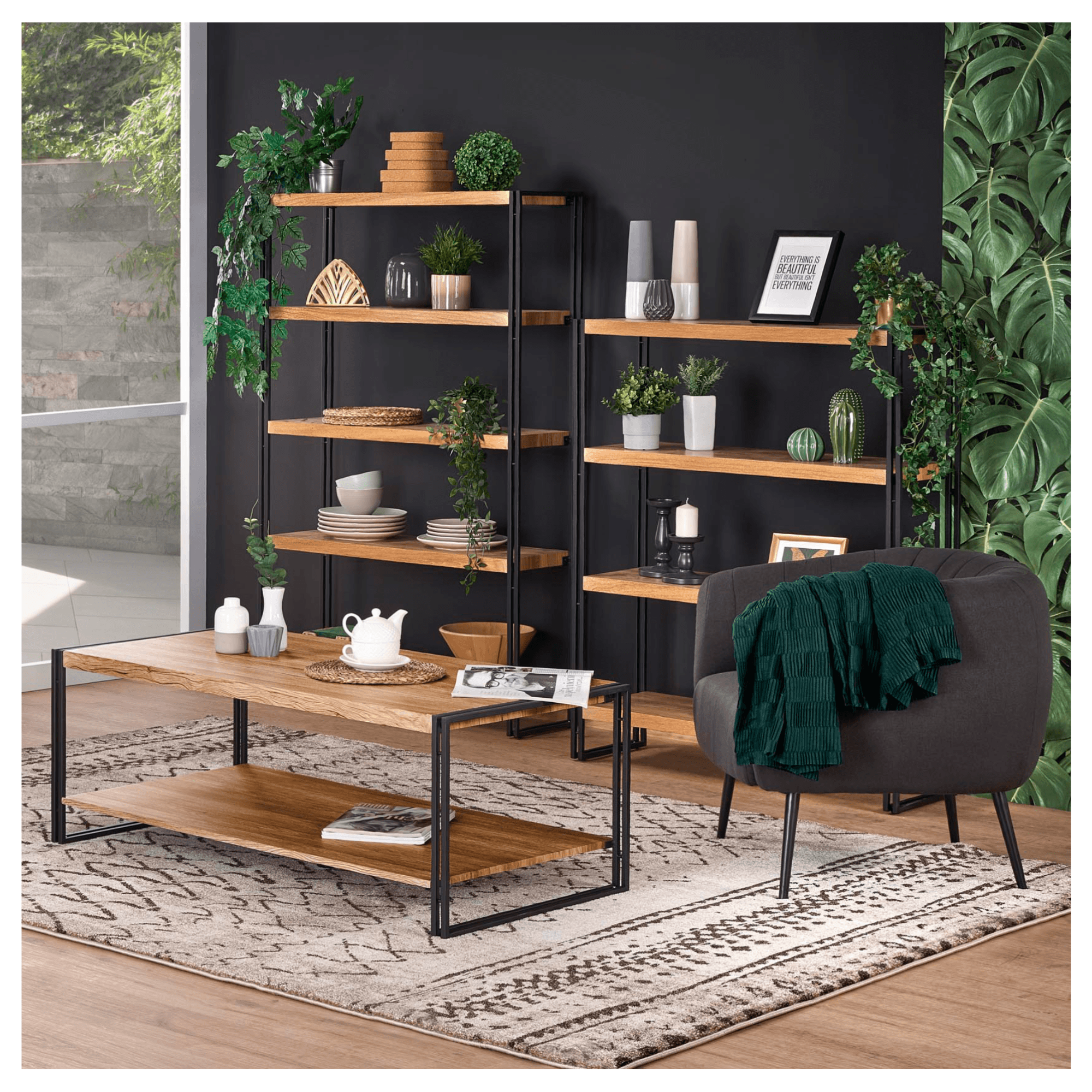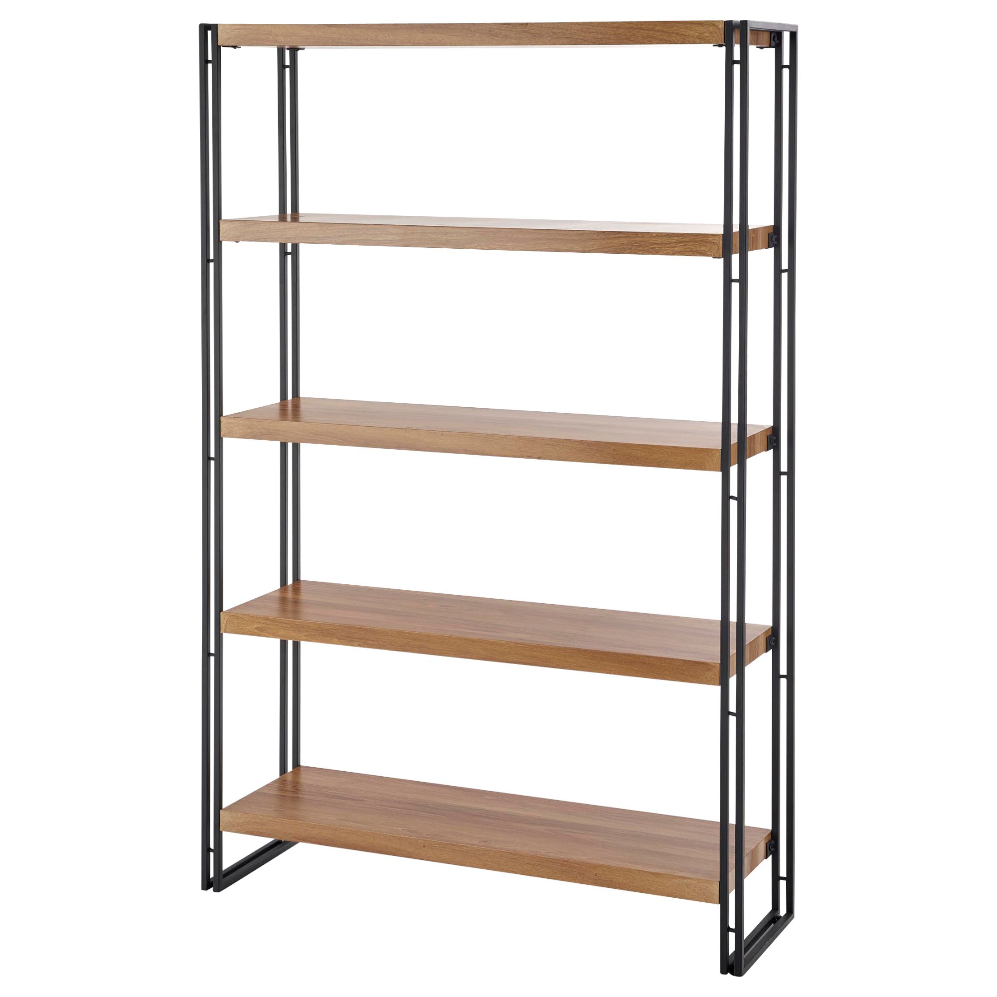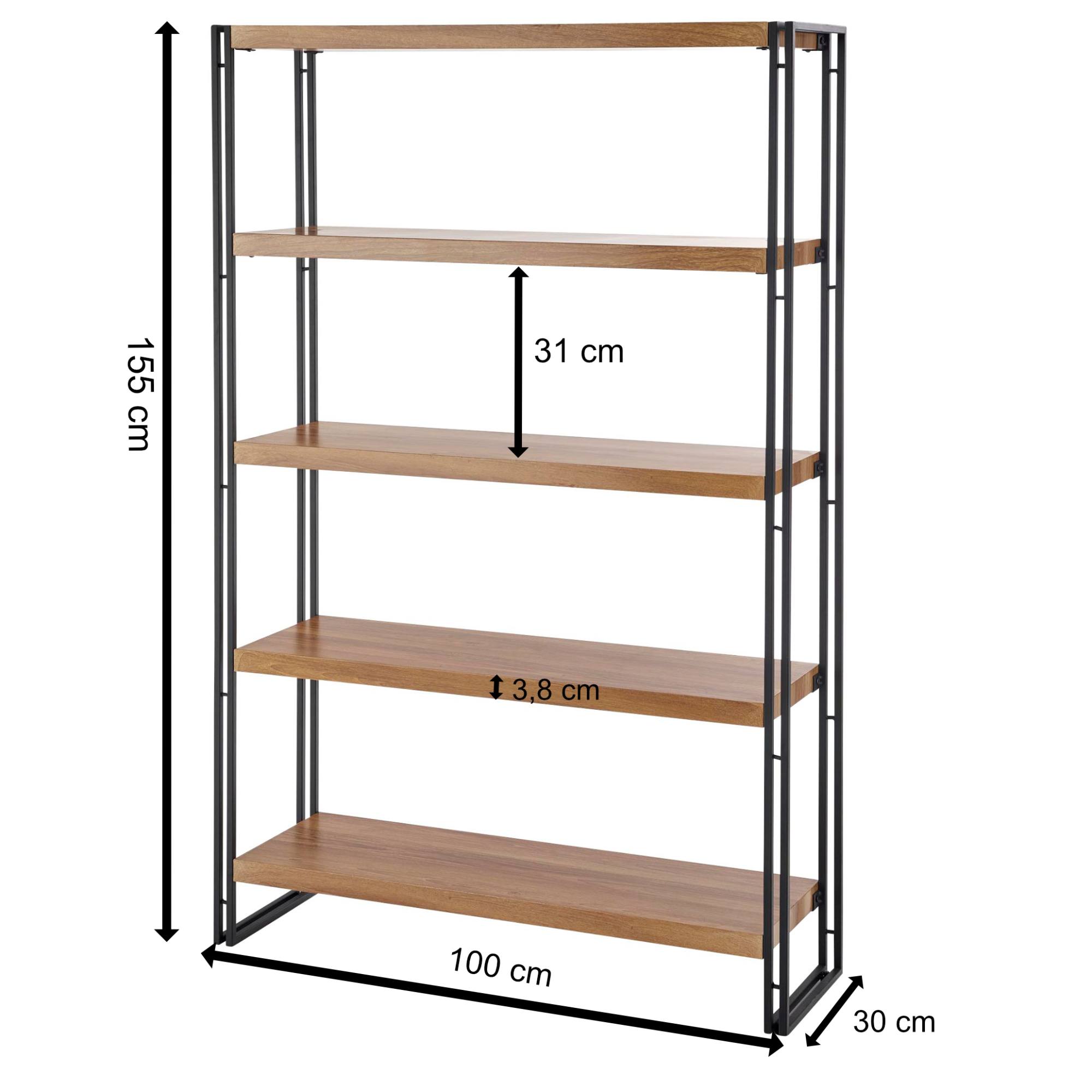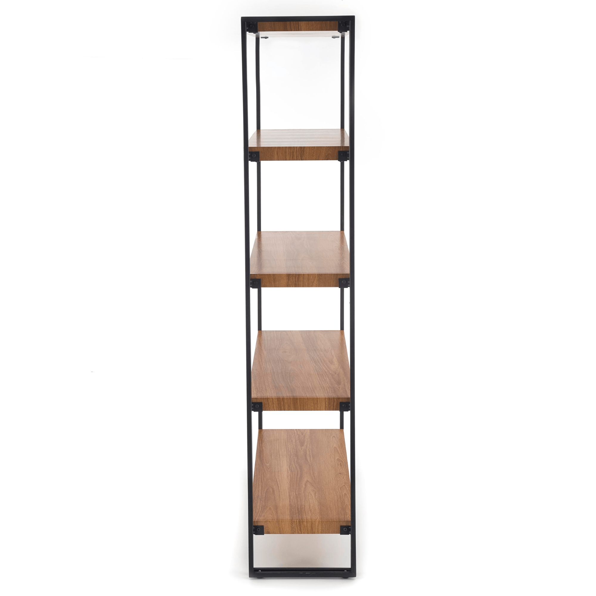 Pevná a stabilná oceľová konštrukcia s práškovo lakovanou povrchovou úpravou zaisťuje celkovú oporu regálu. Do oceľového rámu je zasadených 5 otvorených vložených políc, ktoré ponúkajú dostatok miesta na uskladnenie všetkého potrebného. Otvorené spracovanie vám pomôže mať všetko na jednom mieste, ale zároveň udržať si dokonalý prehľad o uložených predmetoch. Regálové police sú vyrobené z drevovláknitej dosky v dekore zlatého duba, ktorý v kombinácii s čiernym kovom vytvára štýlový vzhľad.