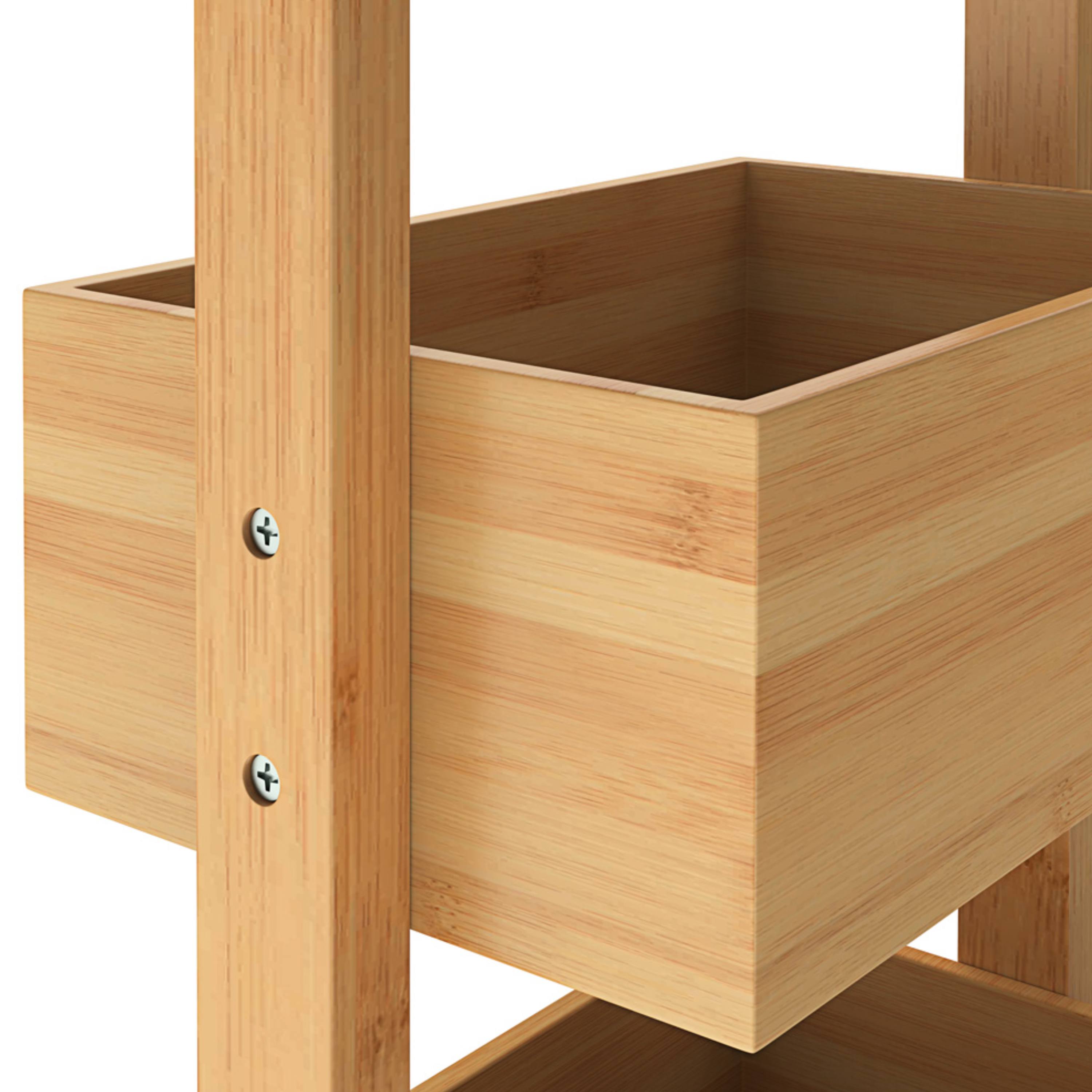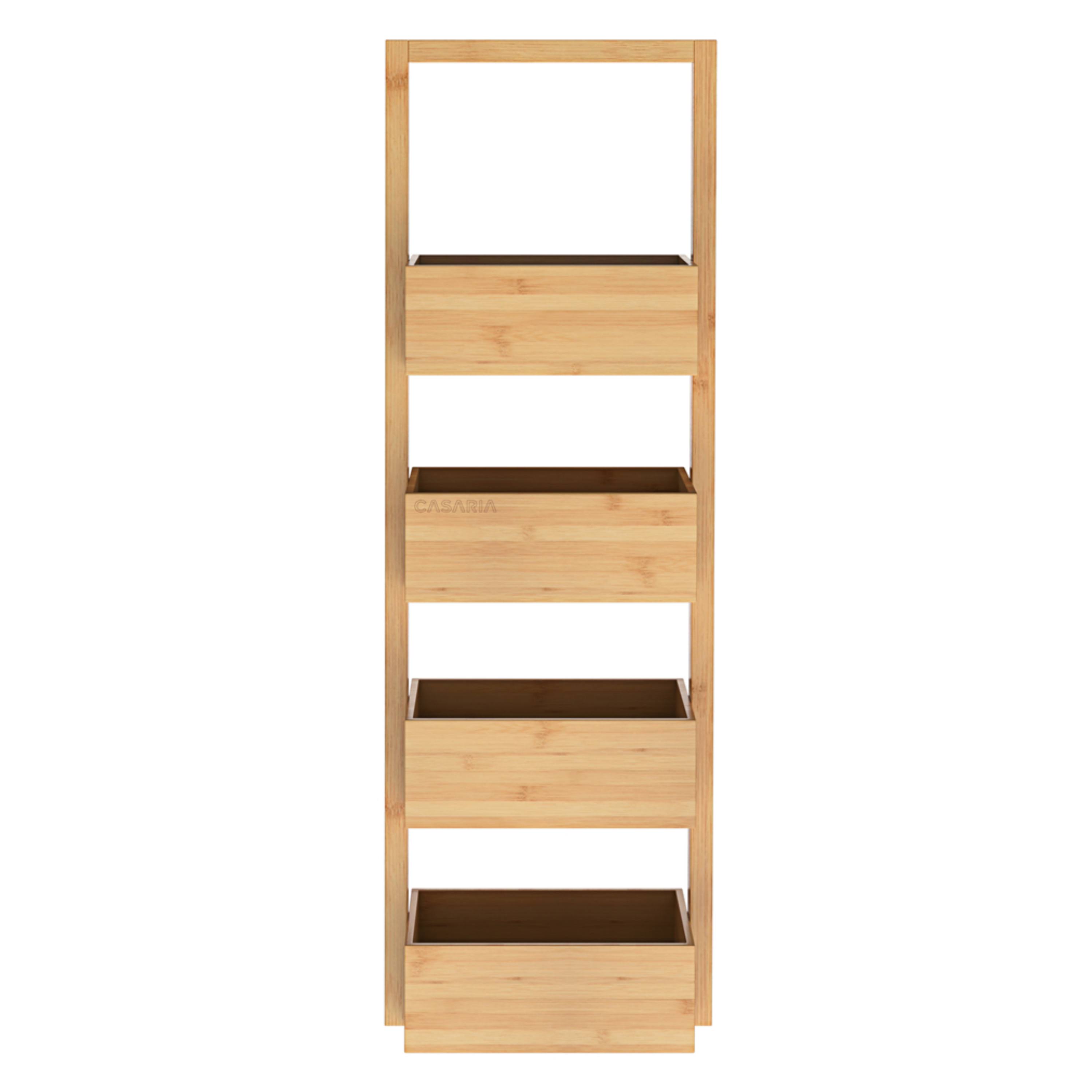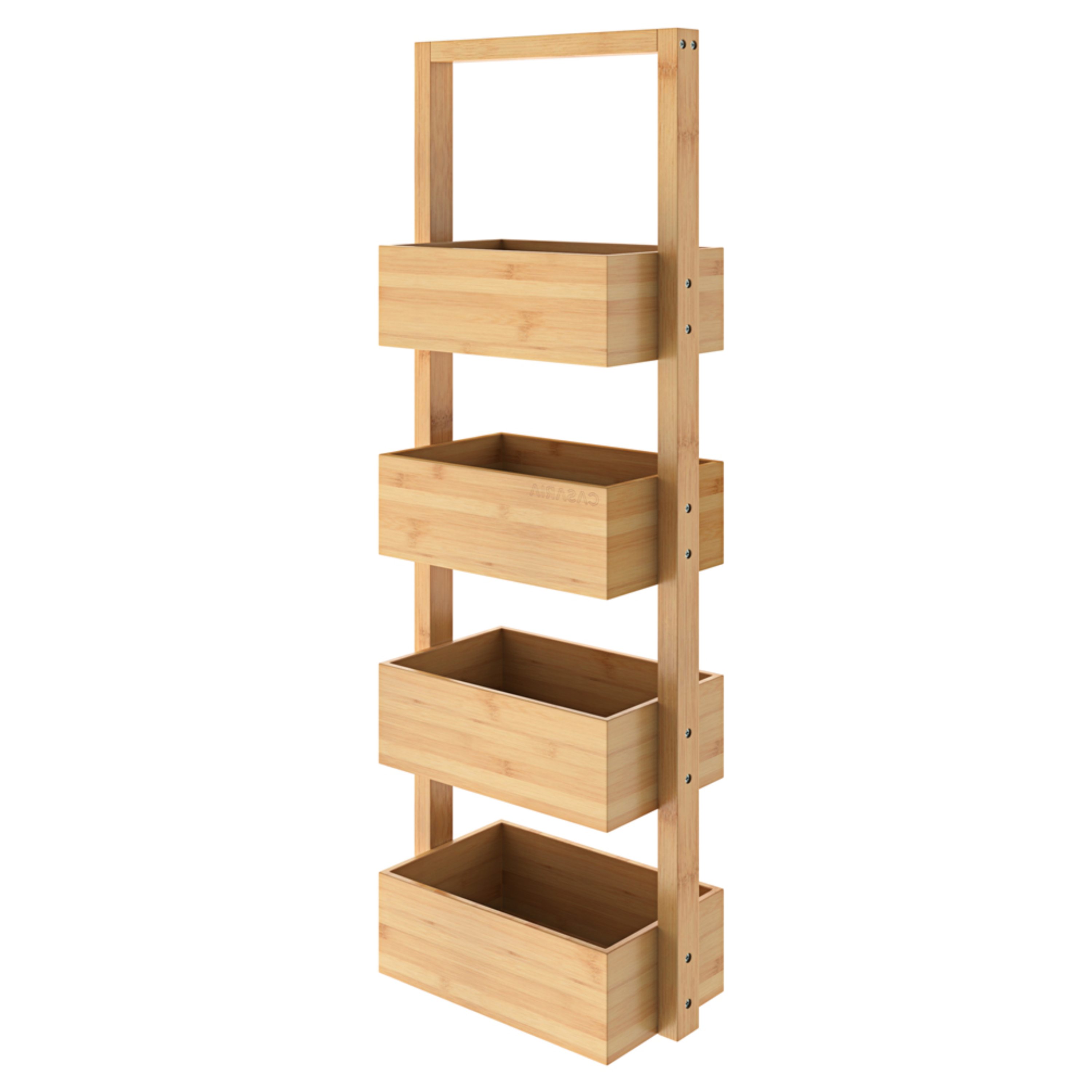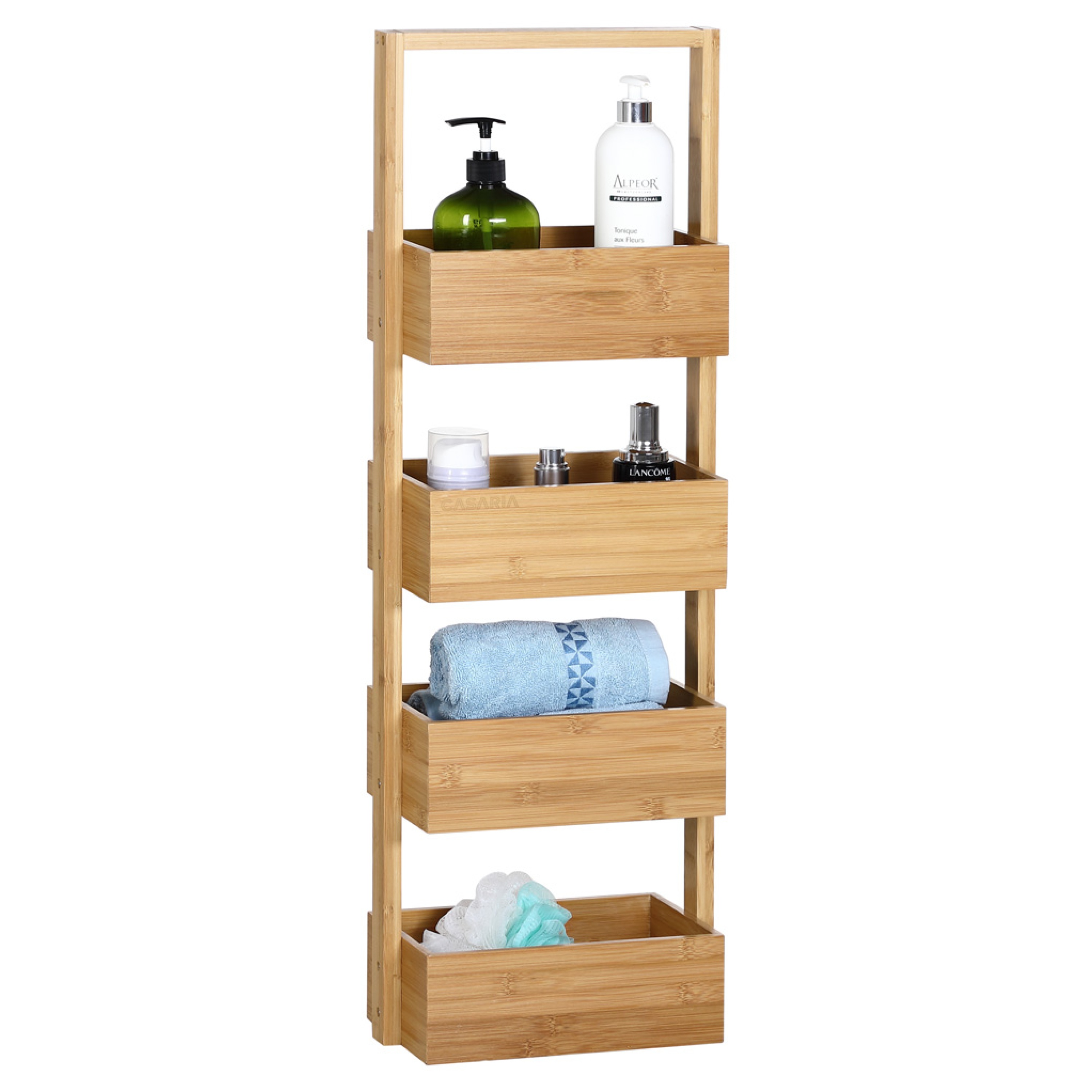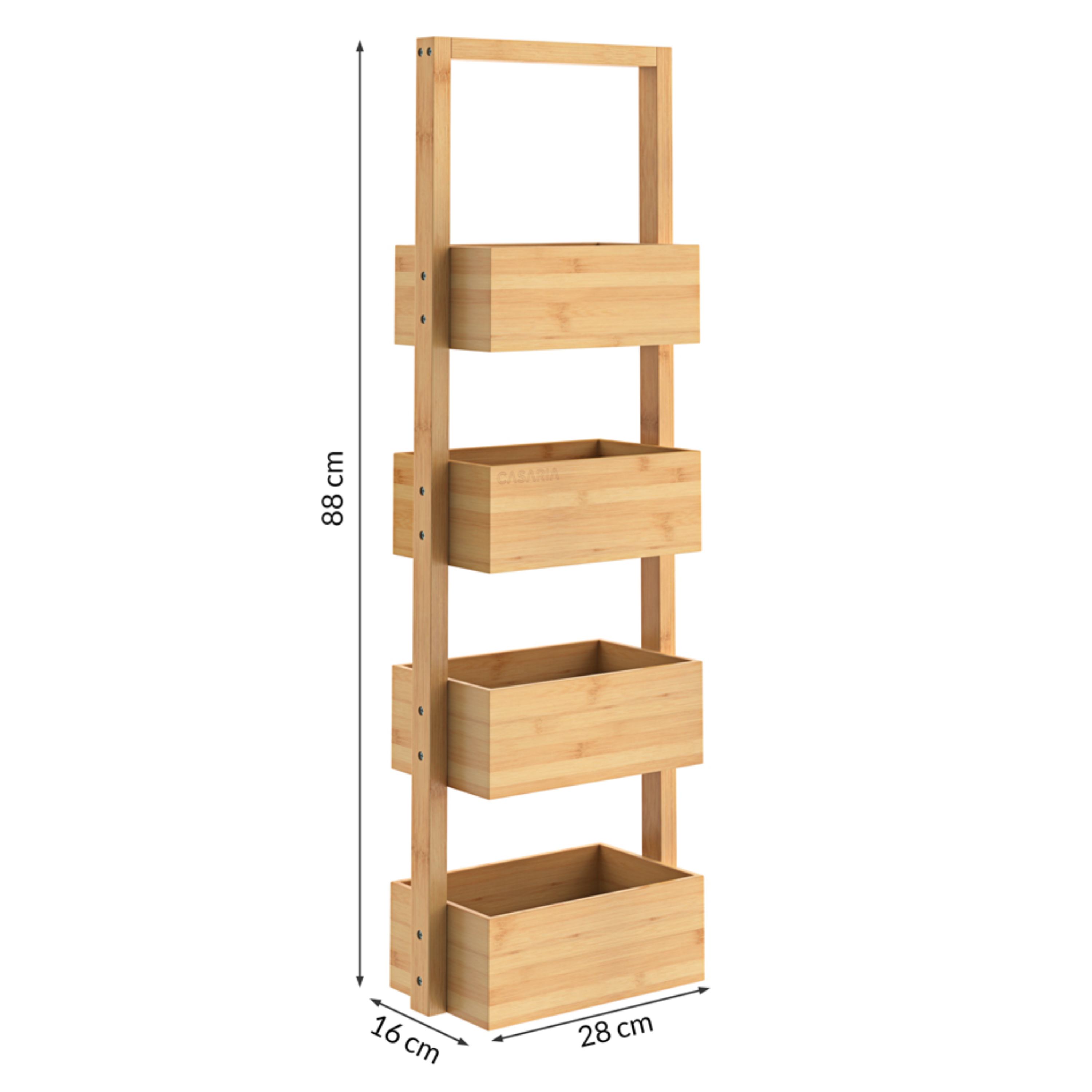 Regál je vybavený 4 hlbokými policami, ktoré uľahčujú organizáciu a každodenné používanie. Zvýšené okraje zároveň zabraňujú vypadnutiu uložených predmetov. Konštrukcia je vyrobená z udržateľného bambusu, ktorý je prirodzene odolný voči vlhkosti, takže sa skvele hodí práve do kúpeľňového prostredia. Regál je robustný a stabilný s nosnosťou až 5 kg na policu. Vďaka jednoduchému dizajnu sa navyše ľahko kombinuje s rôznymi štýlmi interiéru a využijete ho aj v ďalších miestnostiach vašej domácnosti.