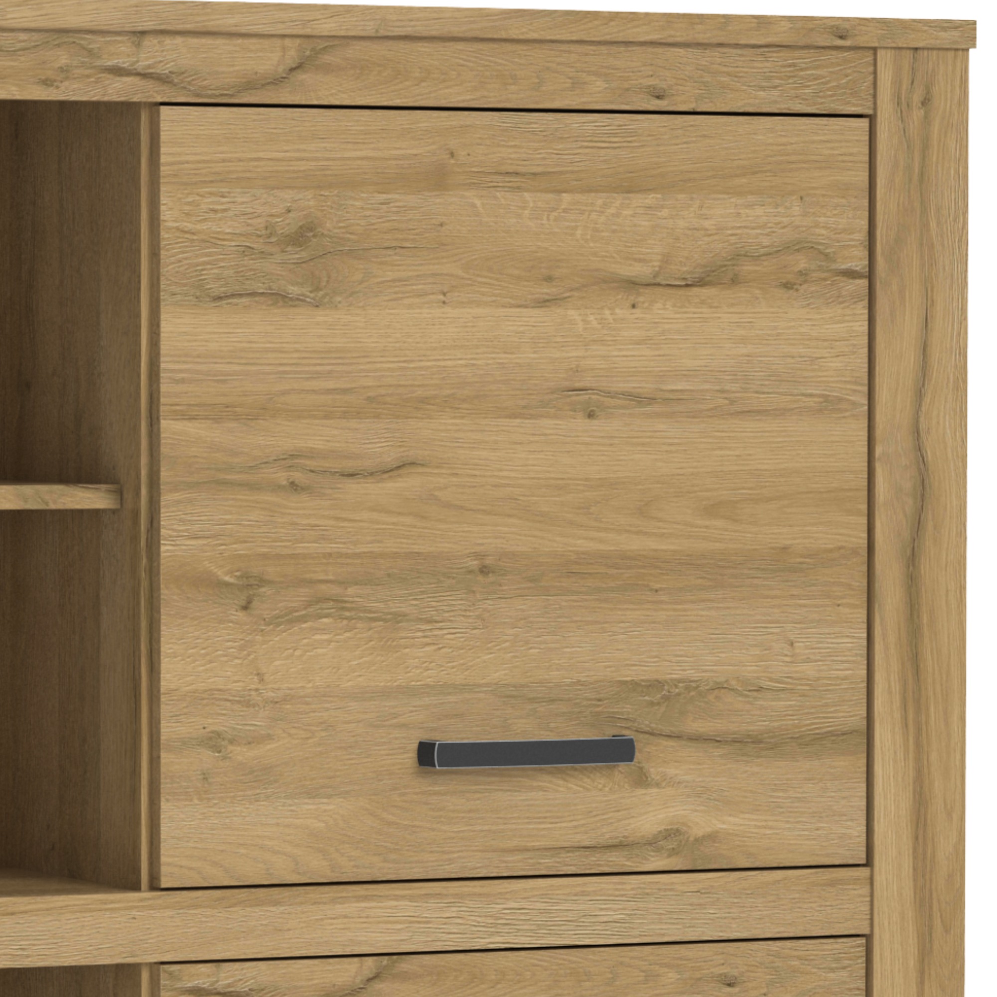 Elegantný regál CUBA zútulní nielen vašu obývaciu izbu, ale aj knižnicu či pracovňu. Je prakticky rozdelený na priestor s otvorenou a uzavretou časťou ponúkajúcou dostatok úložného aj odkladacieho priestoru. Budete tak mať k dispozícii celkom štyri police, z toho za každými dvierkami je schovaná vždy jedna polica. Pre ľahšiu manipuláciu sú dvierka vybavené decentnými rúčkami. Regál je vyrobený z laminovaného materiálu, ktorého povrch sa vyznačuje jednoduchou údržbou. Svojím spracovaním vytvára vzhľad masívneho dreva v dekore duba.