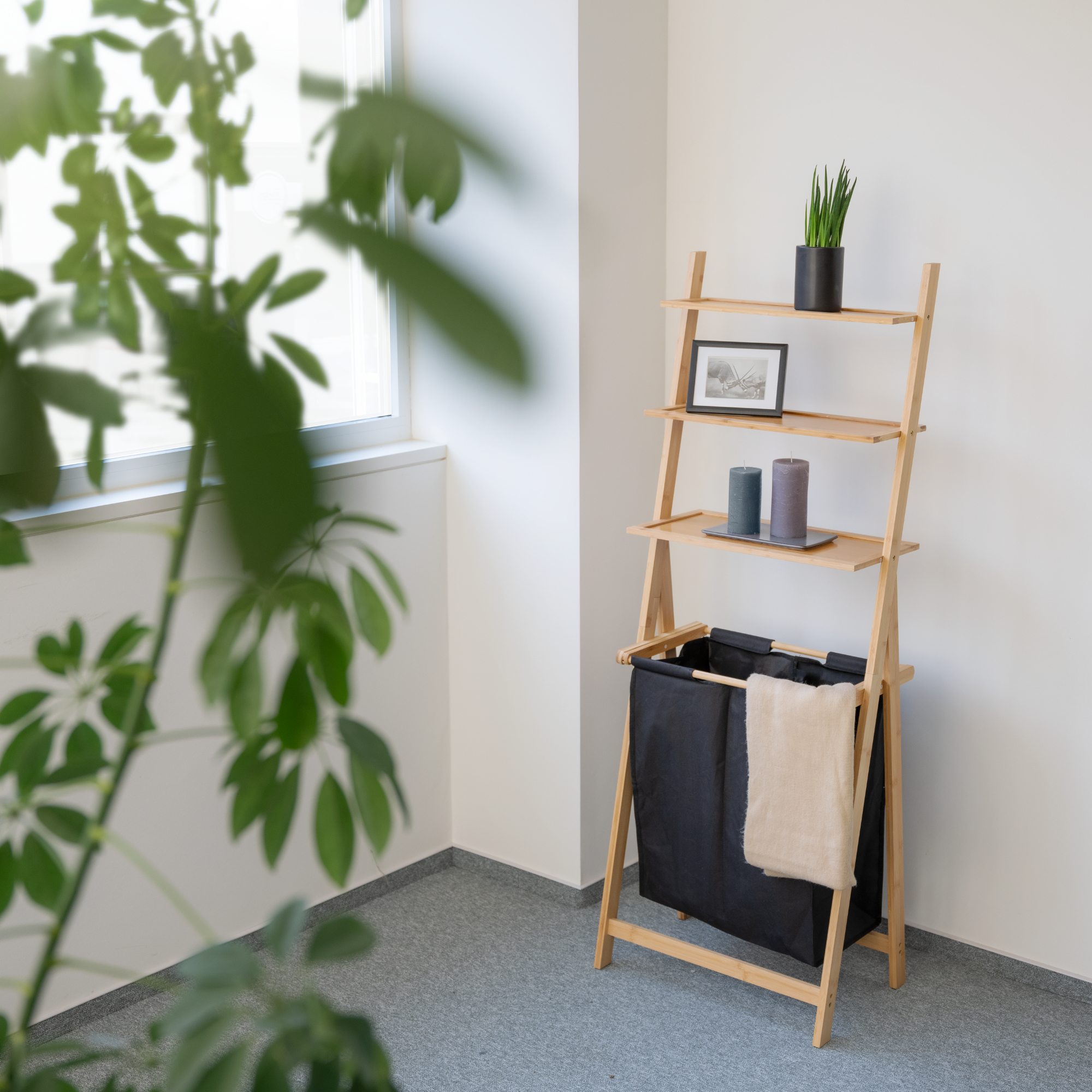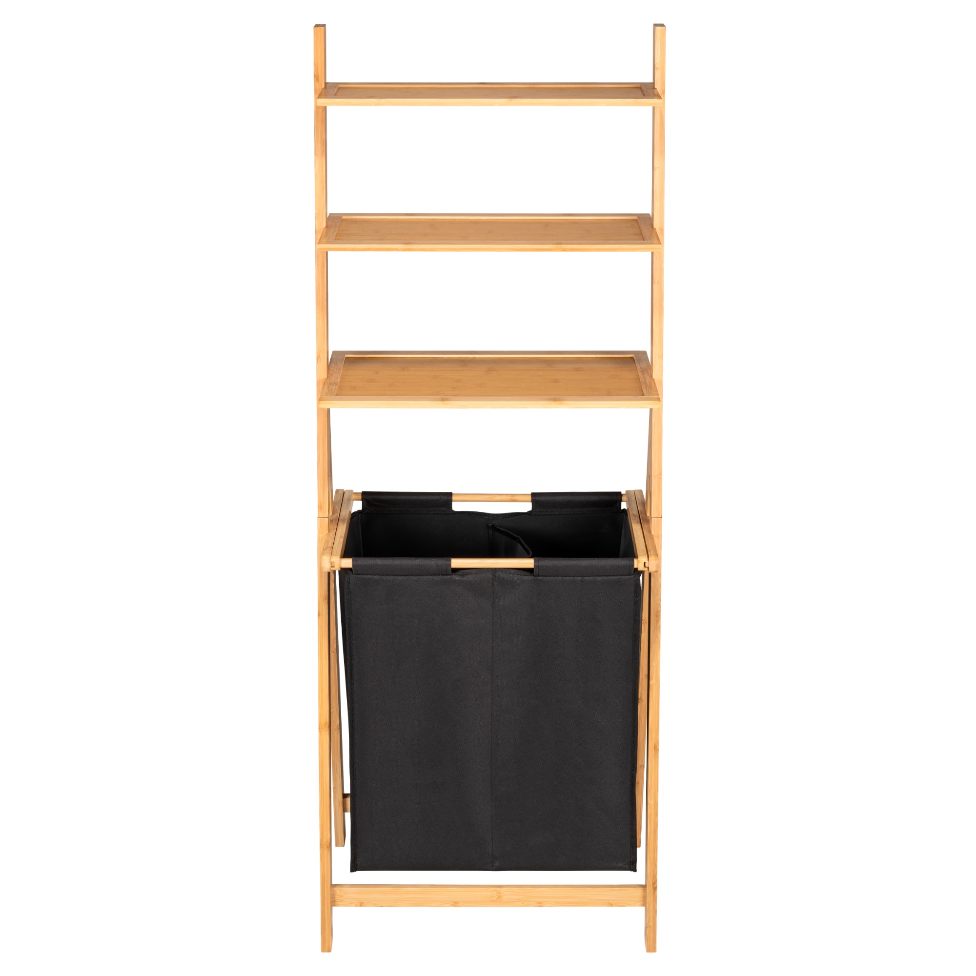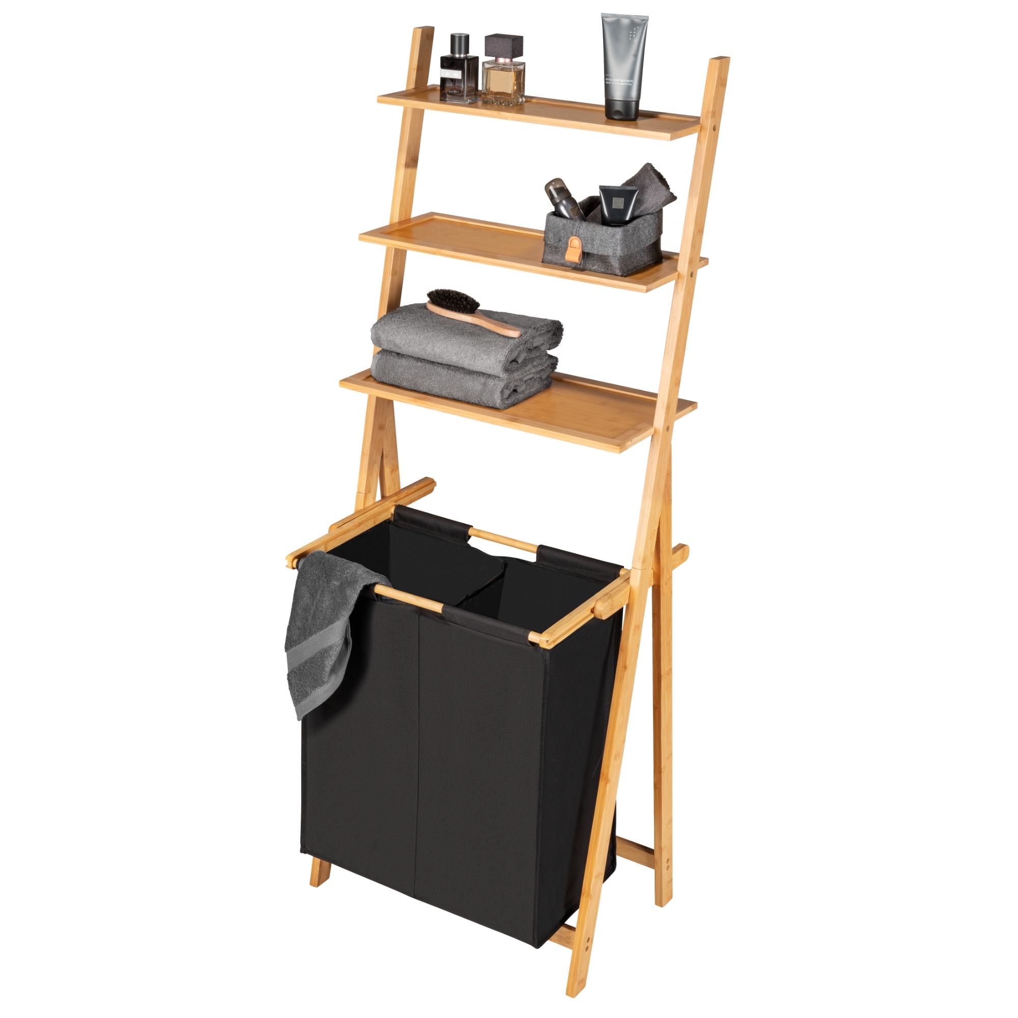 Regál je vyrobený z FSC certifikovaného bambusového dreva, vďaka ktorému je odolný voči vlhkosti, a teda ideálny do kúpeľní. Regál tvoria 3 police z MDF materiálu s vyvýšeným bambusovým okrajom, ktorý udrží všetko na mieste. Súčasťou regála je tiež praktický kôš na bielizeň vyrobený zo 100 % recyklovaného plastu. Kôš je rozdelený na 2 časti, ktoré vám uľahčia triedenie bielizne. Na vnútornej strane je kôš vybavený umývateľným poťahom, vďaka ktorému je jeho údržba veľmi jednoduchá. Kôš tiež môžete pohodlne z regálu vytiahnuť a odniesť kam potrebujete.
