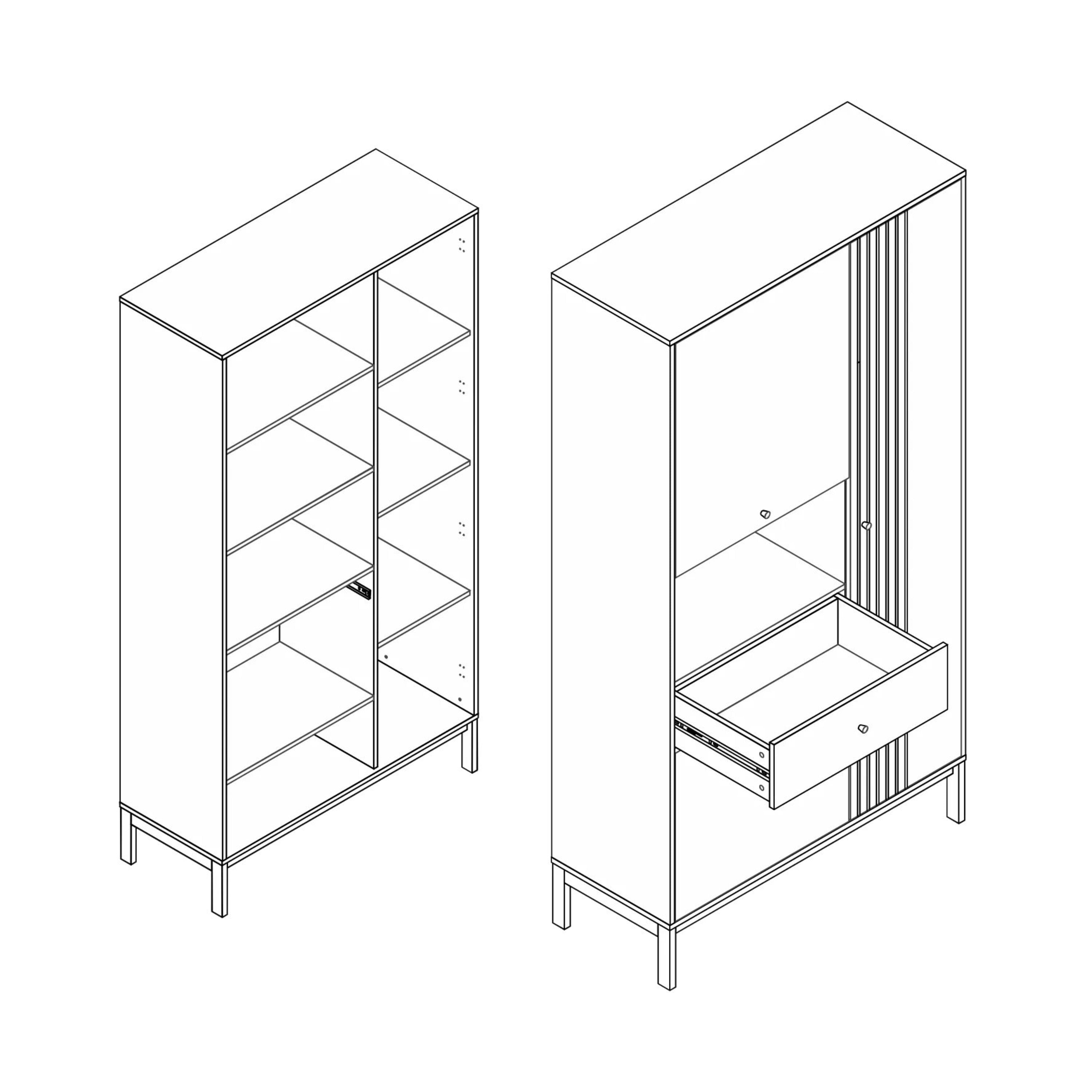 Disponuje 1 zásuvkou a 6 policami, ktoré sa ukrývajú za otočnými dvierkami. Všetko je vybavené praktickými rúčkami a doplnené dekorom alpského duba, ktorý regálu dodáva prírodný nádych. Nad zásuvkou nájdete ďalší otvorený úložný priestor na odloženie drobností, ktoré potrebujete mať poruke, alebo na vystavenie dekorácií. Konštrukcia je vyrobená z laminovanej drevotrieskovej dosky v bielej farbe. Jeho stabilitu zabezpečujú 4 biele kovové nohy. Svojím jednoduchým nadčasovým dizajnom zapadne do viacerých interiérov.