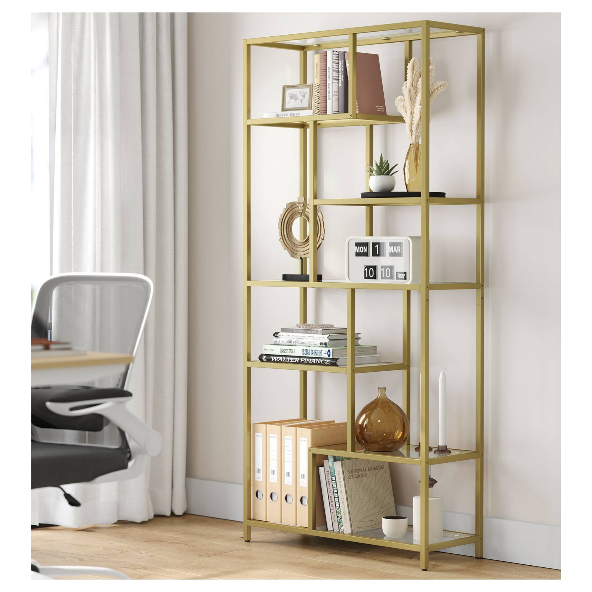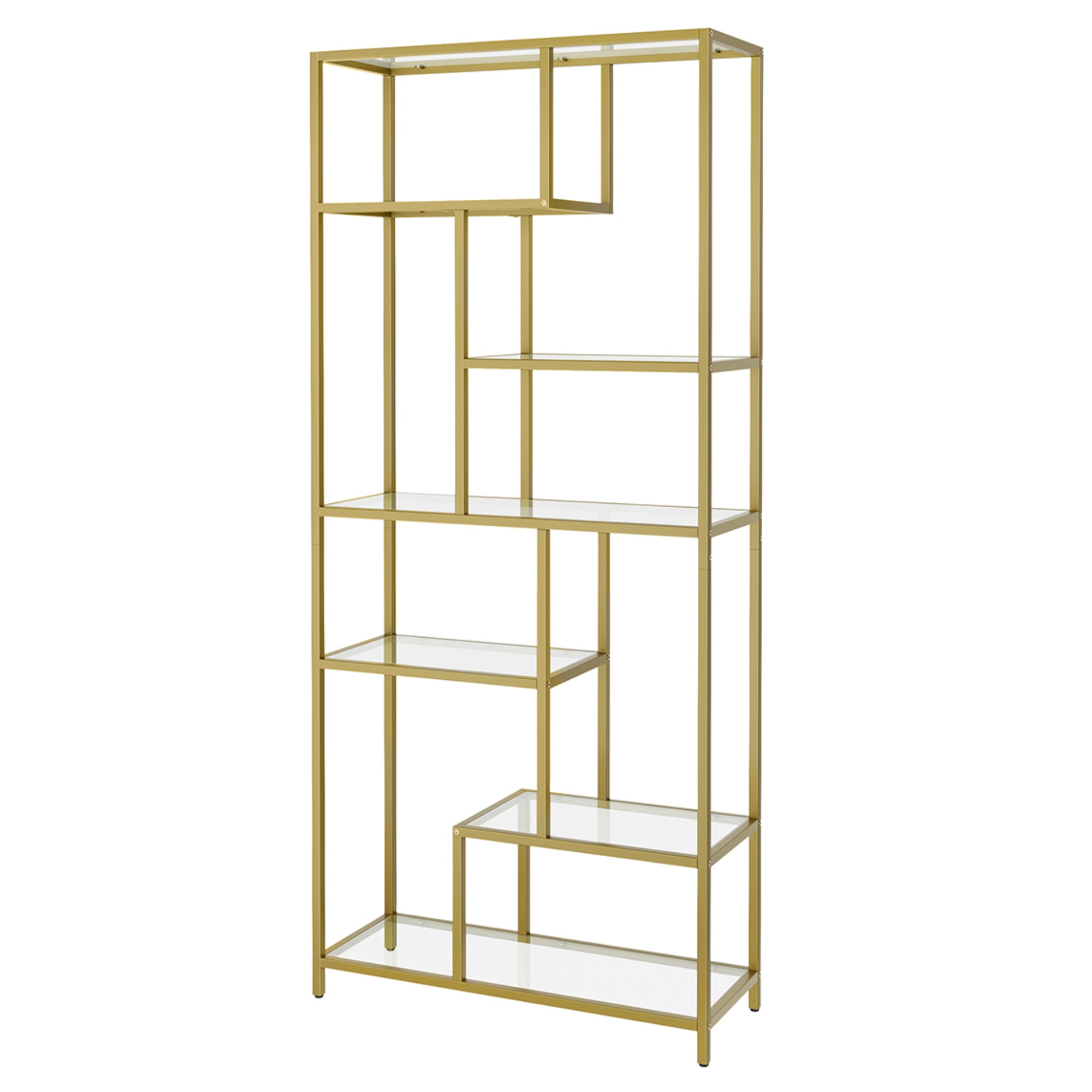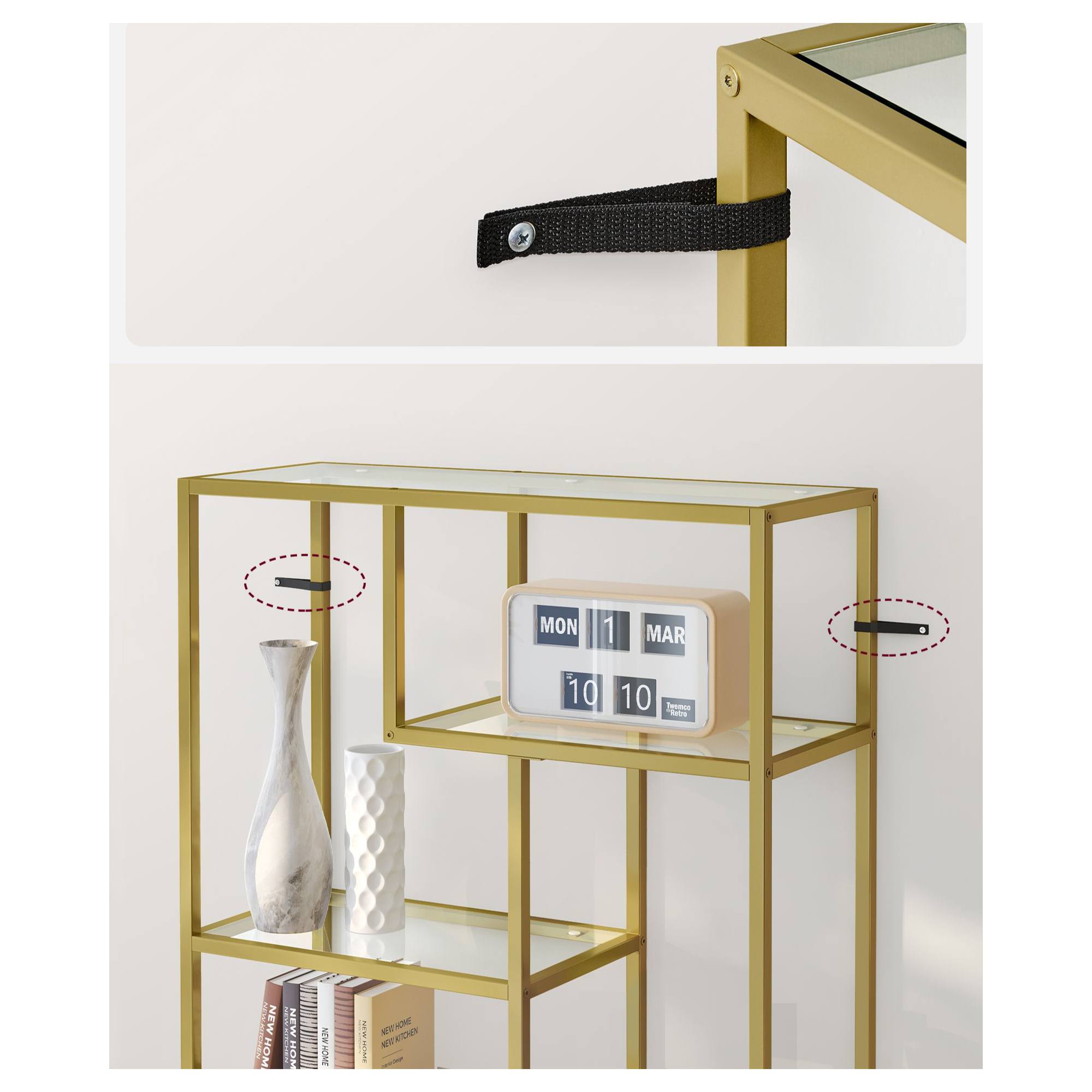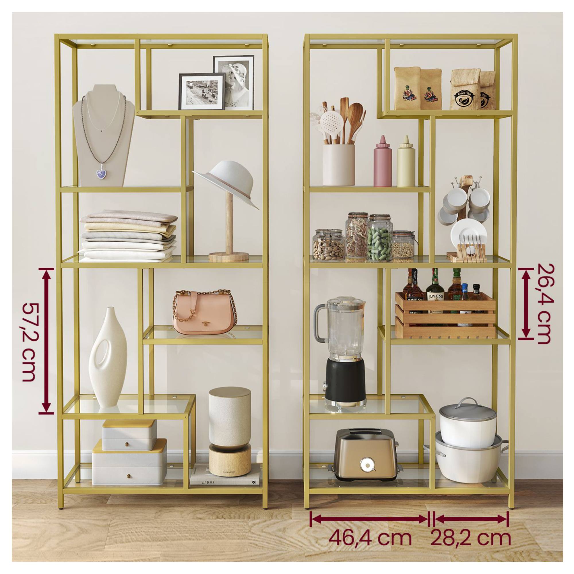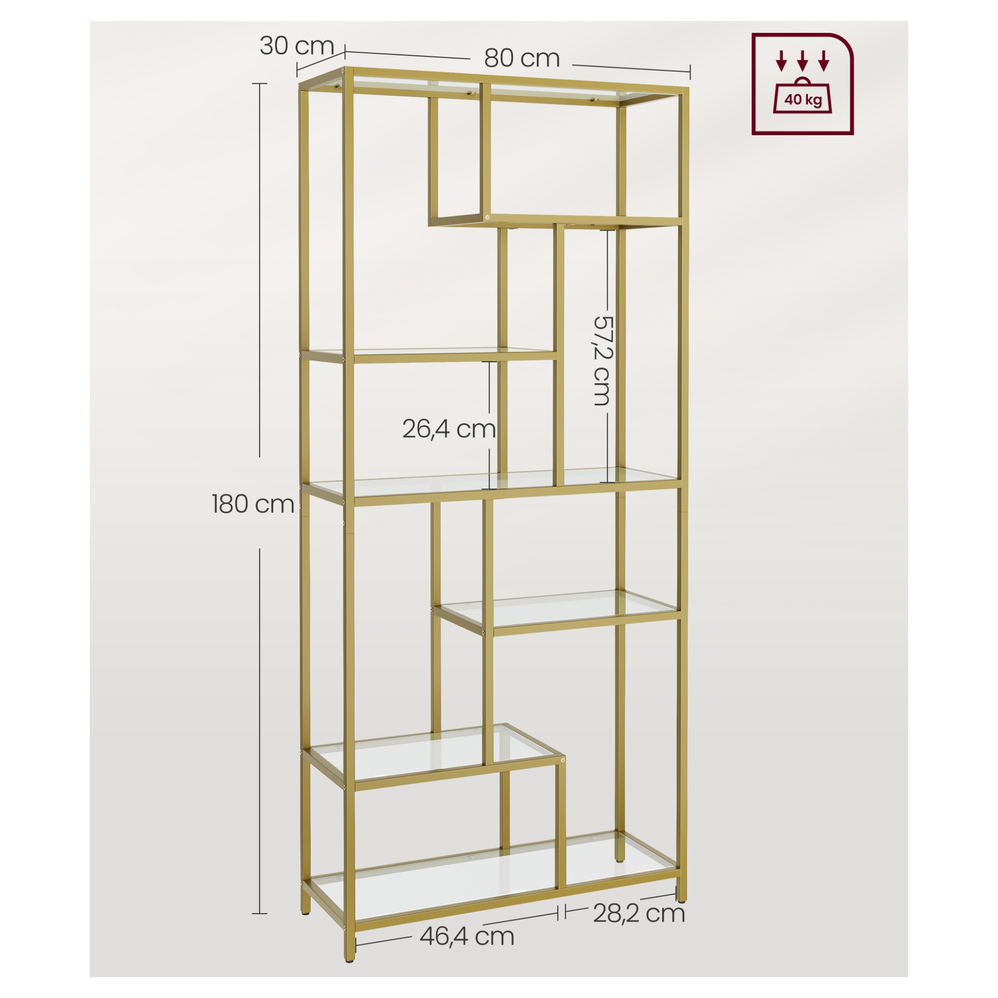 Regál disponuje 6 policami z tvrdeného skla, vyznačujúcimi sa jednoduchou údržbou a dlhšou životnosťou. Maximálna nosnosť regálu je 40 kg, je ideálna na knihy, dekorácie a rastliny. Kovová konštrukcia v zlatej farbe je doplnená nastaviteľnými nožičkami, ktoré poskytujú extra stabilitu a chránia proti poškriabaniu podlahy. Vďaka konštrukcii odolnej voči korózii, bez problémov doplní aj vašu kúpeľňu. Odporúčame pripevniť k stene pomocou sady proti prevráteniu, pre väčšiu bezpečnosť.