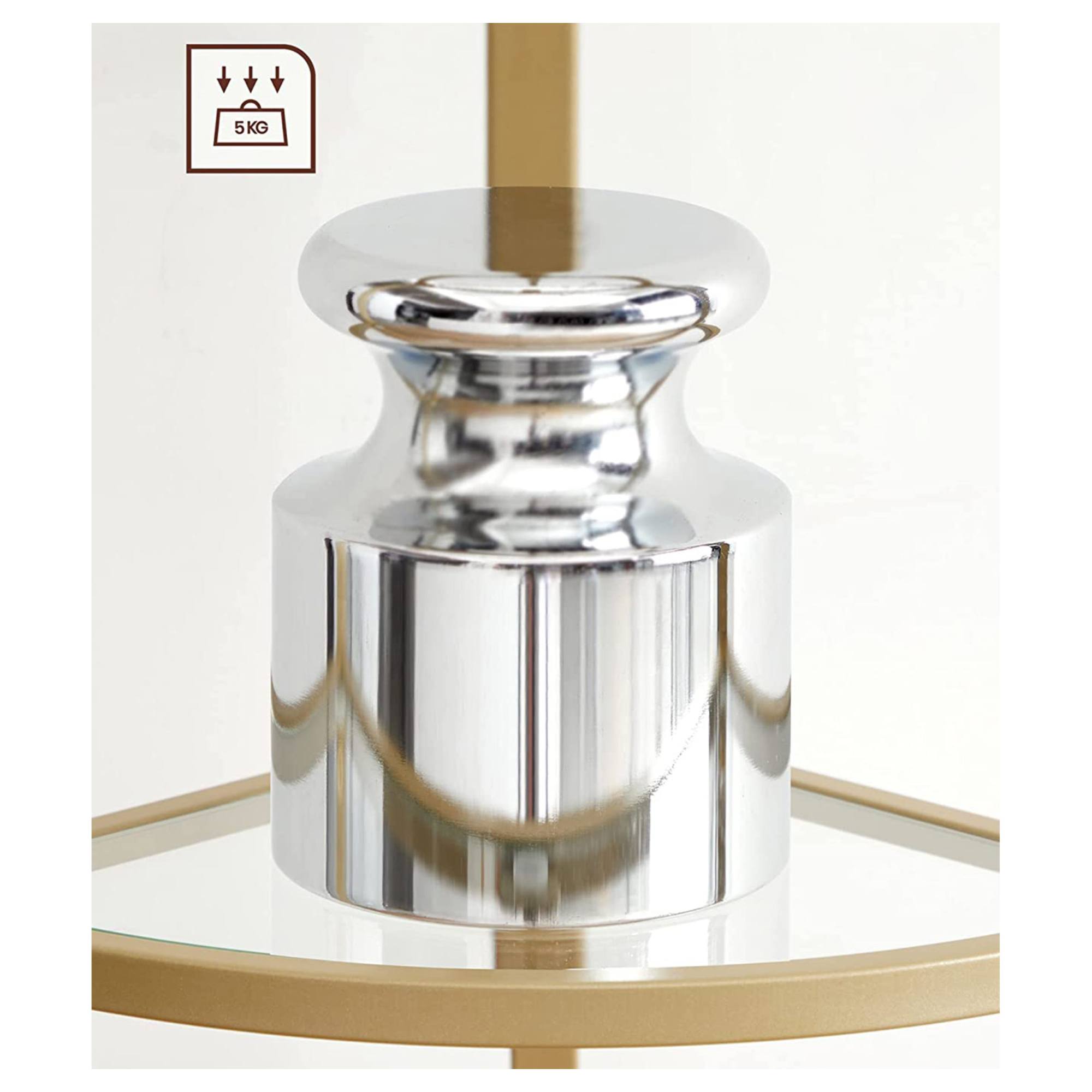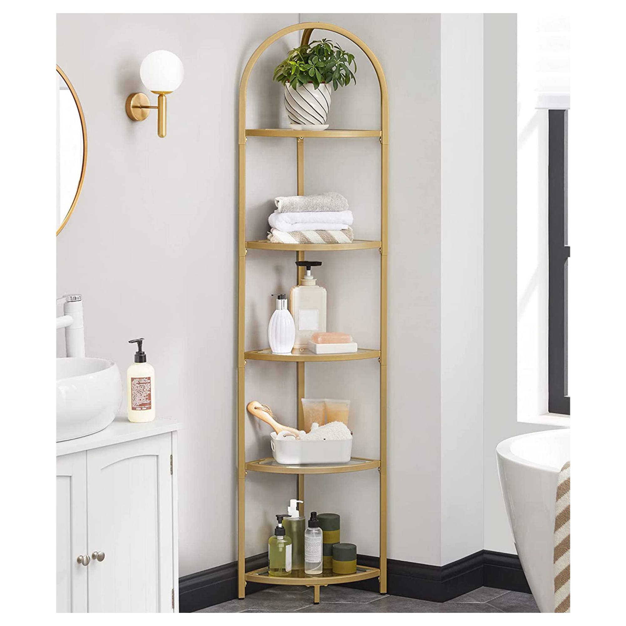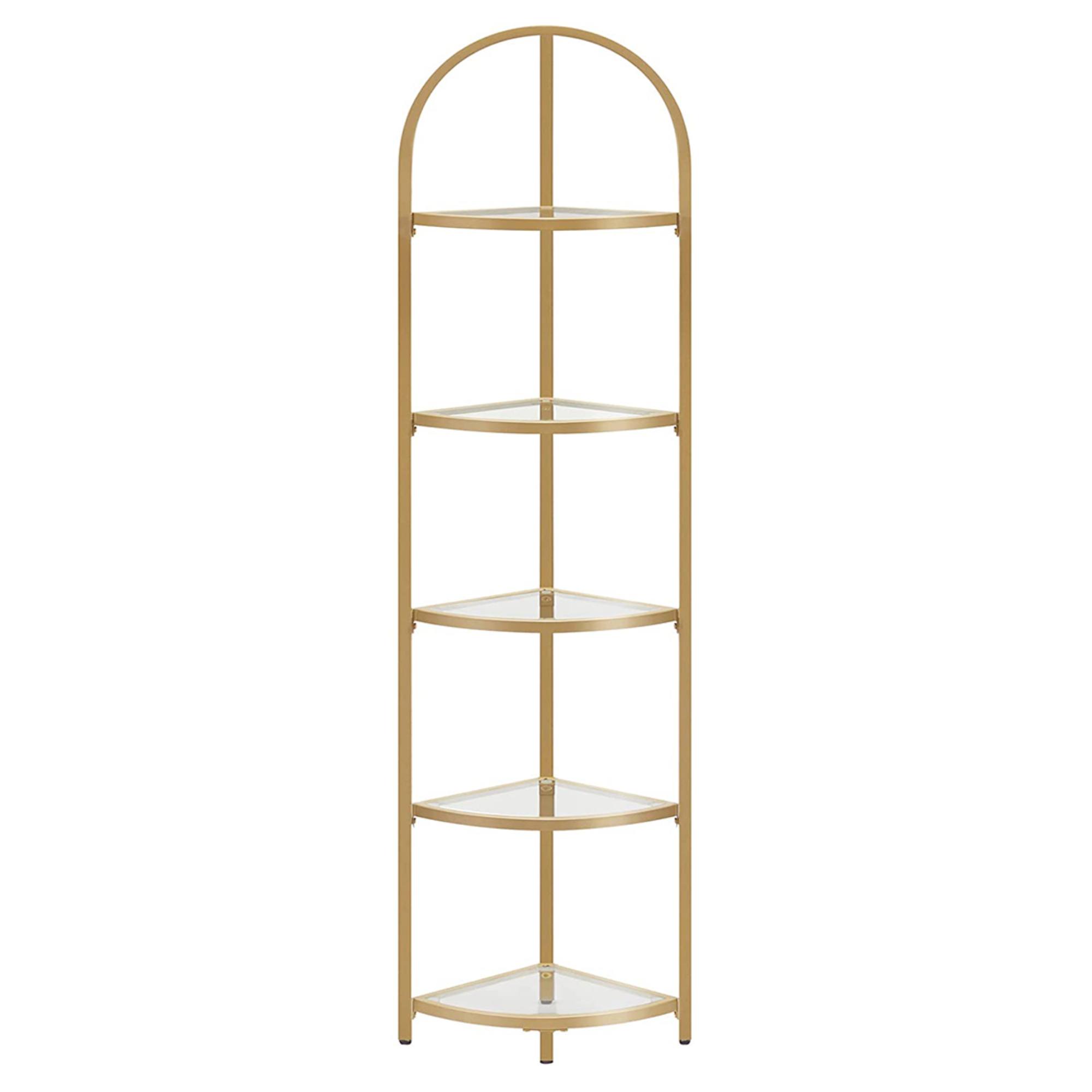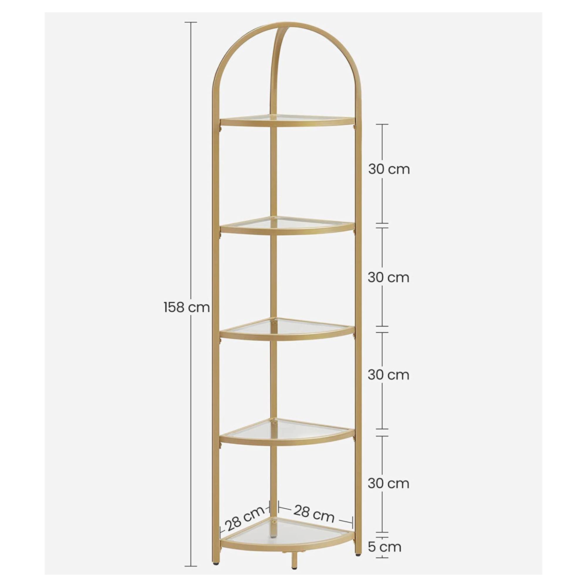Regál disponuje 5 policami z tvrdeného skla, vyznačujúcimi sa jednoduchou údržbou a dlhšou životnosťou. Každá polica má maximálnu nosnosť 5 kg, sú ideálne na knihy, dekorácie a menšie rastliny. Kovová konštrukcia v zlatej farbe je doplnená nastaviteľnými nožičkami, ktoré poskytujú extra stabilitu a chránia proti poškriabaniu podlahy. Jeho rohové vyhotovenie ho umožňuje bez problémov umiestniť do menších priestorov, či už do obývacej izby, spálne alebo kuchyne. Vďaka konštrukcii odolnej voči korózii, bez problémov doplní aj vašu kúpeľňu. Odporúčame pripevniť k stene pomocou sady proti prevráteniu, pre väčšiu bezpečnosť.