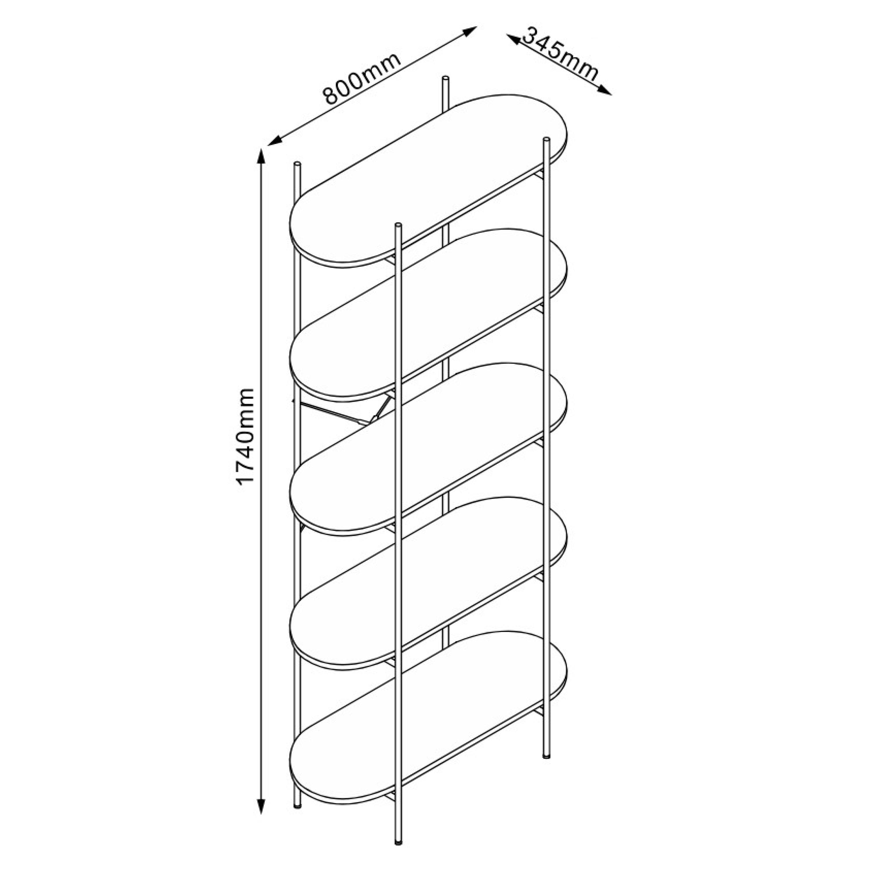 Kovová konštrukcia zabezpečuje pevnosť, stabilitu a odolnosť celého regála. Do rámu je vsadených 5 oválnych políc z laminovanej drevotriesky, ktoré ponúkajú dostatok miesta na prehľadné skladovanie. Otvorené prevedenie konštrukcie umožňuje jednoduchý prístup k uloženým predmetom. Regál možno využiť nielen ako úložný prvok, ale aj ako výrazný interiérový doplnok, ktorý podčiarkne moderný charakter interiéru.