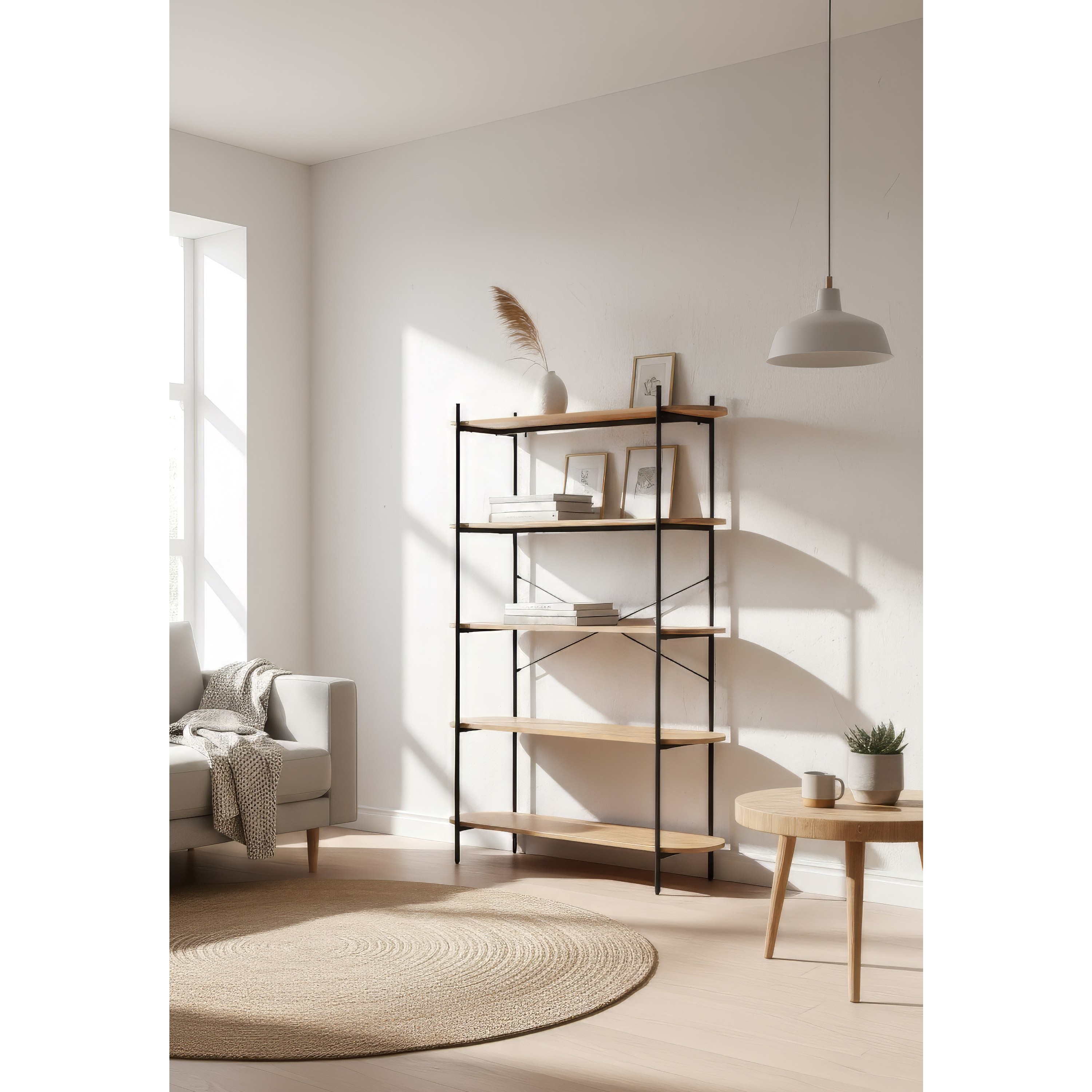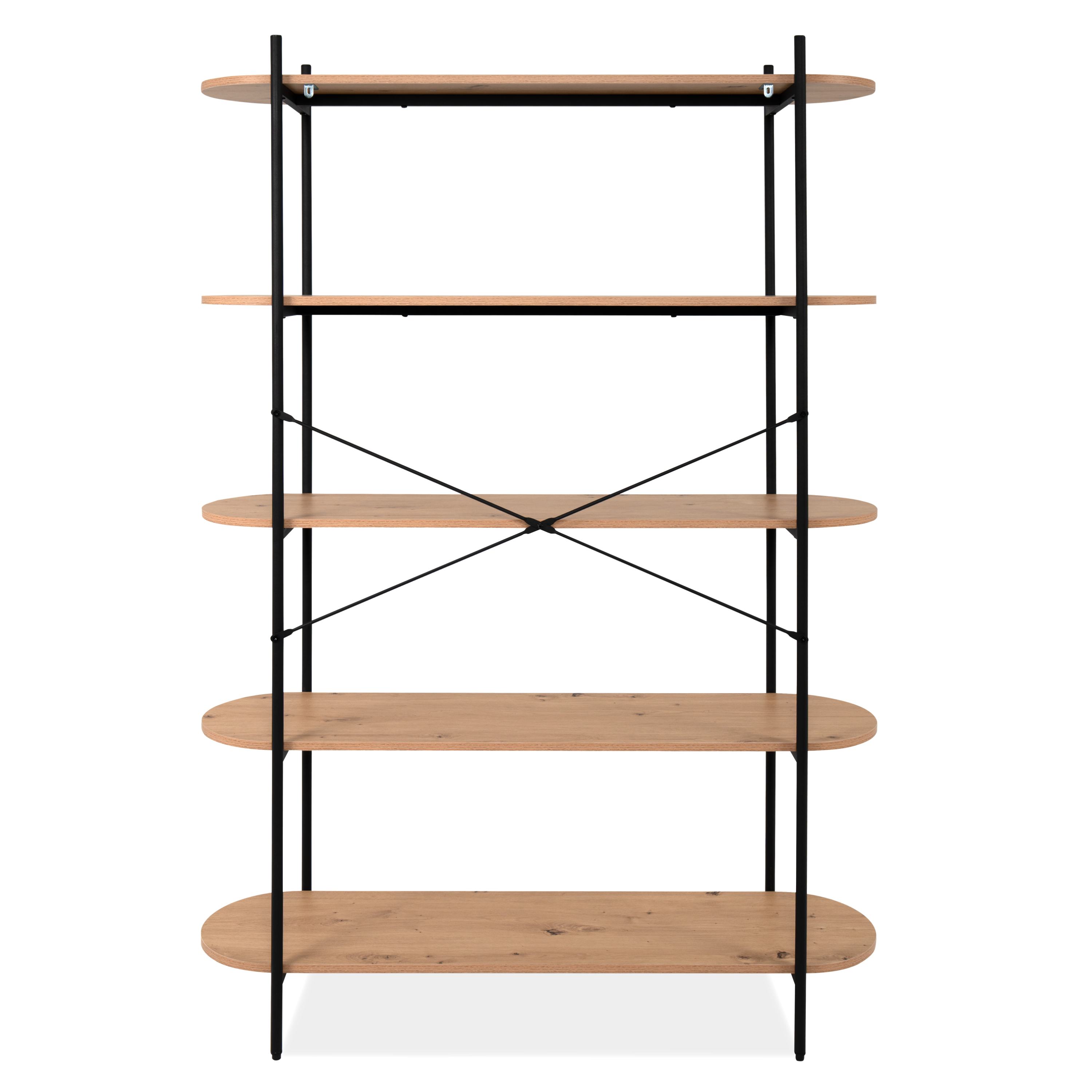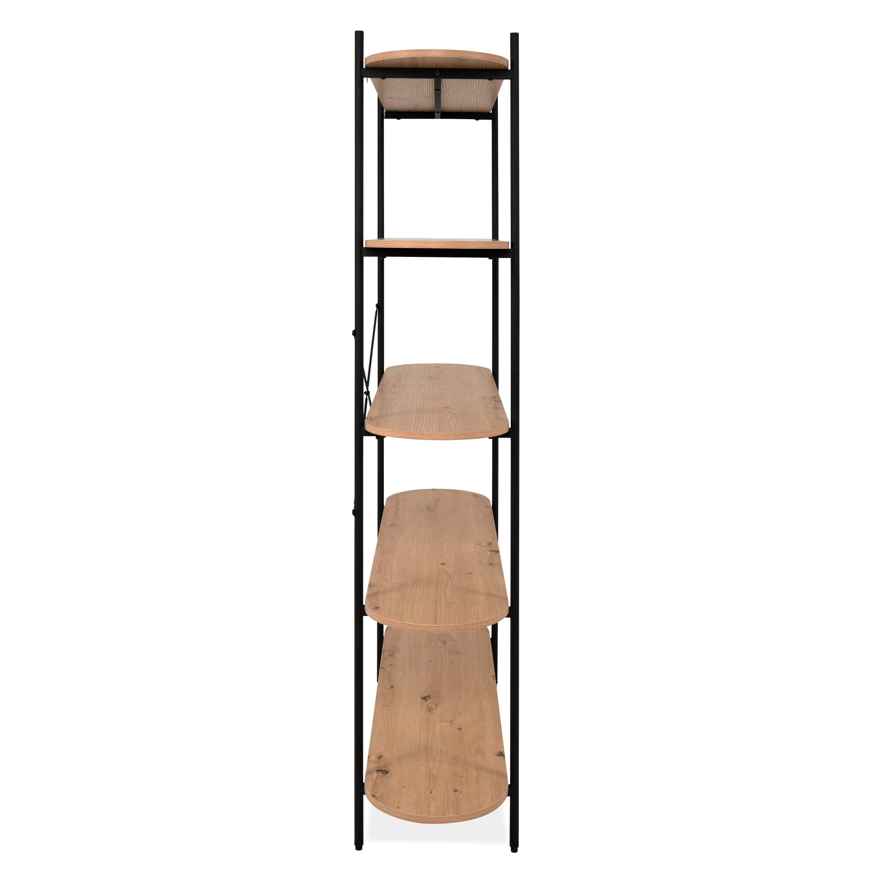 Kovová konštrukcia zabezpečuje pevnosť, stabilitu a odolnosť celého regála. Do rámu je vsadených 5 priestranných, oválnych políc z laminovanej drevotriesky, ktoré ponúkajú dostatok miesta na prehľadné skladovanie. Otvorené prevedenie konštrukcie umožňuje jednoduchý prístup k uloženým predmetom. Regál možno využiť nielen ako úložný prvok, ale aj ako výrazný interiérový doplnok, ktorý podčiarkne moderný charakter interiéru.