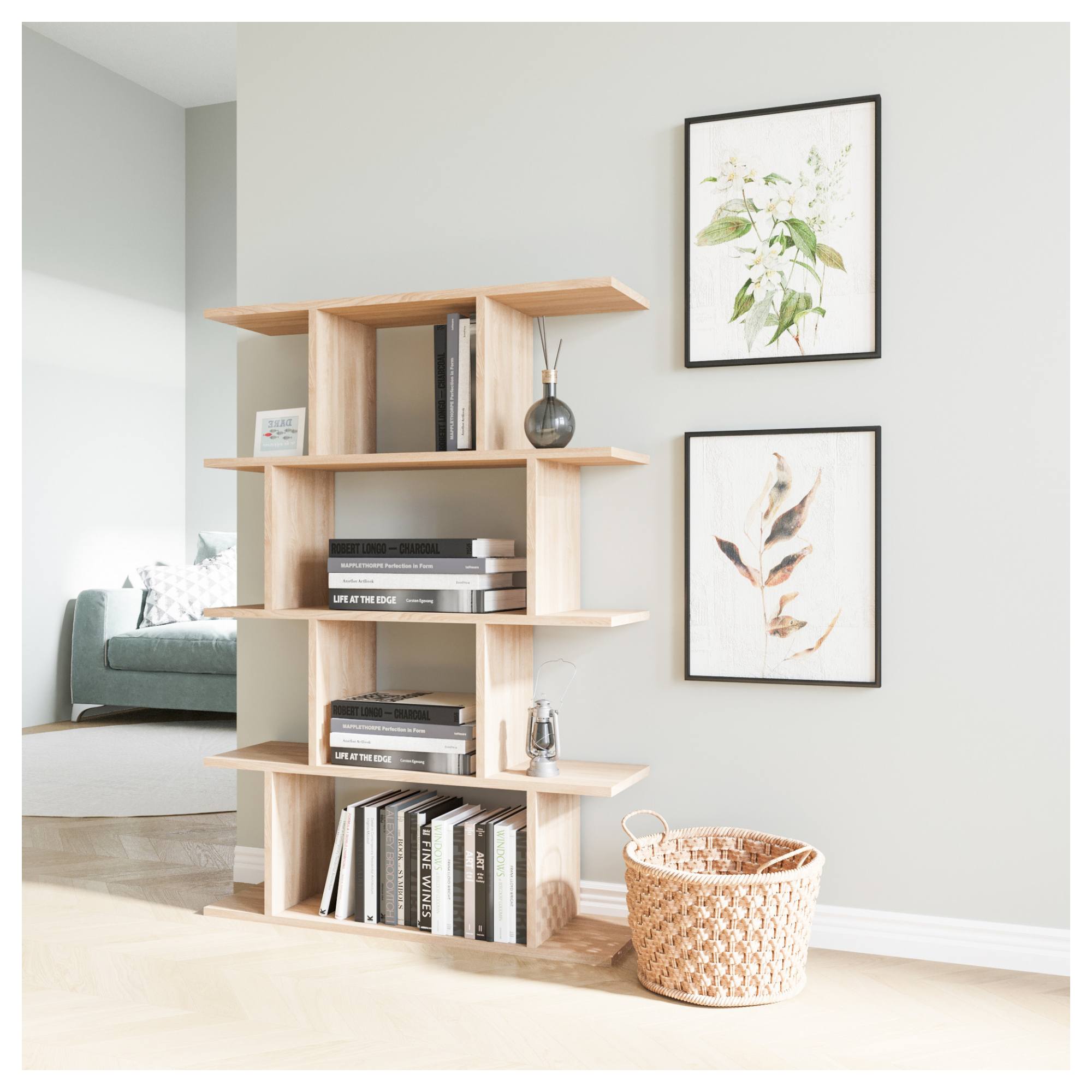 Či už ho umiestnite do obývacej izby, spálne či pracovne, tak spoľahlivo doplní miestnosť o jednoduchý úložný priestor. Zostavený je z vertikálne a horizontálne umiestnených dosiek, ktoré vytvárajú rôzne veľké odkladacie okná práve na prehľadné skladovanie alebo vystavenie dekoratívnych predmetov. Vďaka svojmu vzhľadu najviac vynikne postavený pri stene. Konštrukcia je vyrobená z laminovanej drevotriesky s nenáročnou povrchovou údržbou.