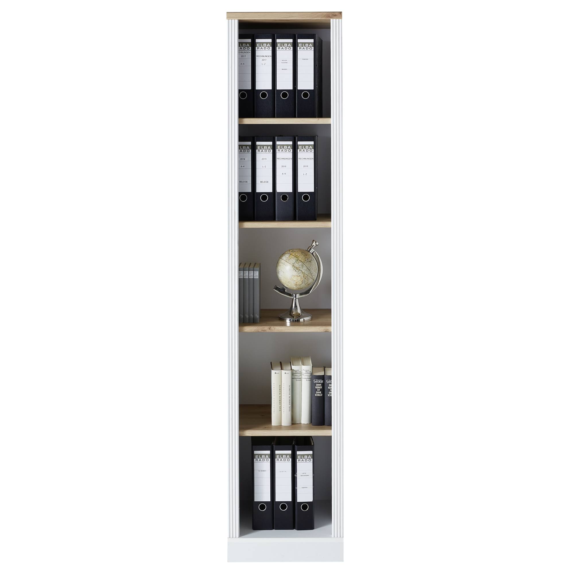 Otvorená sekcia disponuje dostatočným úložným priestorom deleným policami. Ideálne miesto v ňom nájdu šanóny, knihy a iné kancelárske nevyhnutnosti, takže nad všetkým budete mať dokonalý prehľad. Vyrobený je z drevovláknitých dosiek MDF s dekoratívnym frézovaním.