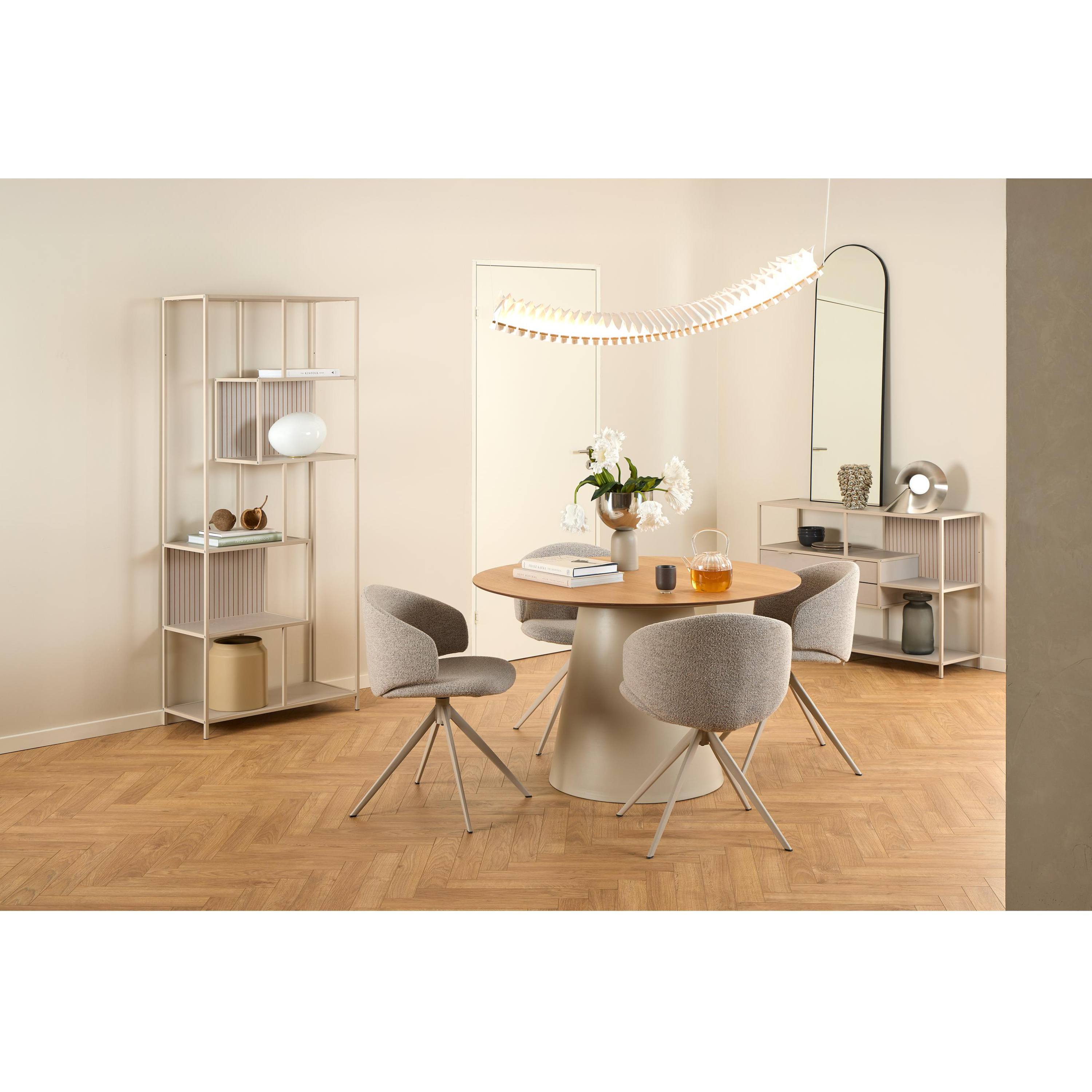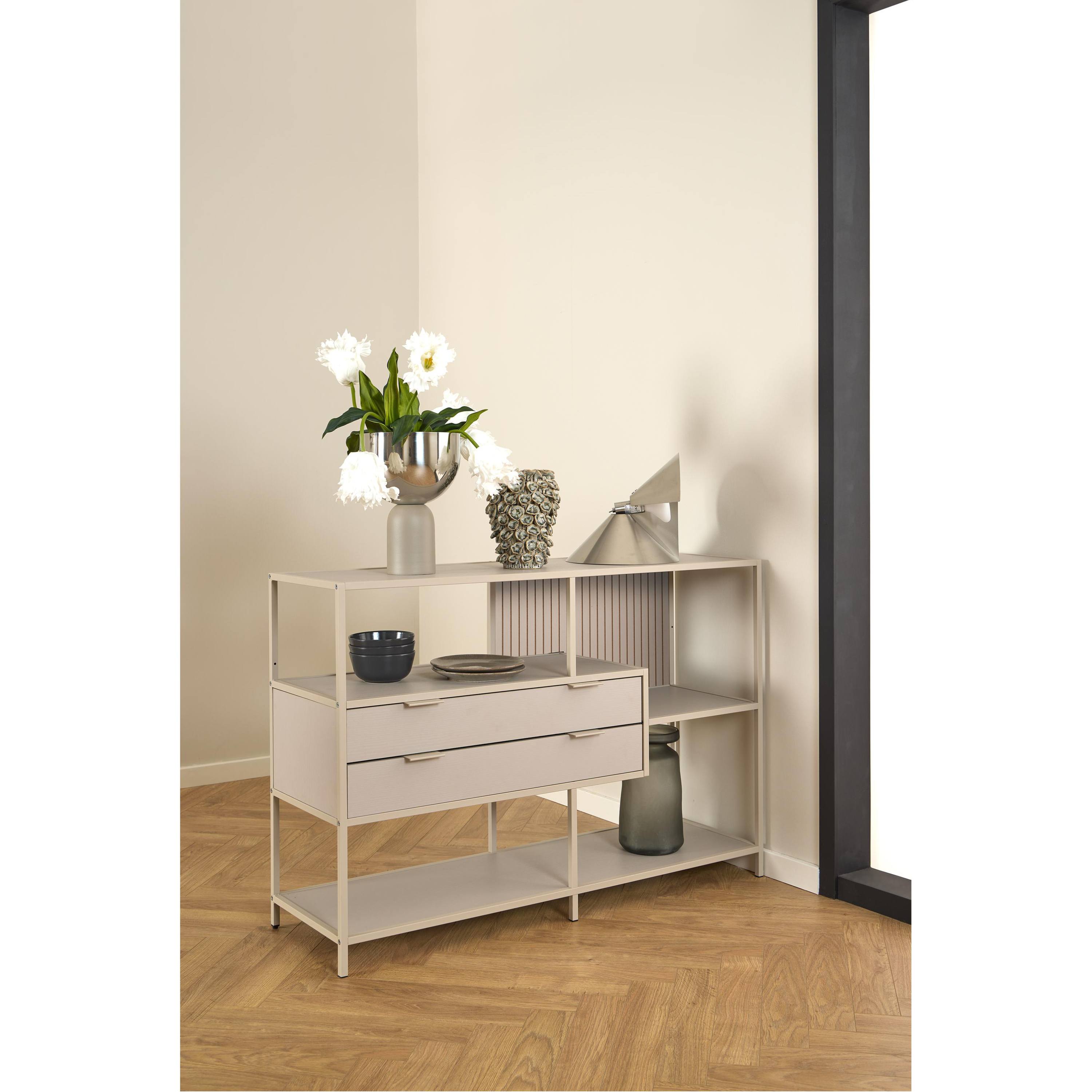 Jednoduchá konštrukcia s 2 zásuvkami a otvorenými, odkladacími plochami ponúka dostatok miesta na uloženie kníh, dokumentov a vystavenie dekoratívnych predmetov. Konštrukcia knižnice je vyrobená z pevnej ocele s práškovým nástrekom, zatiaľ čo zásuvky a odkladacie plochy sú vyhotovené z laminovaných MDF dosiek s povrchom nenáročným na údržbu.