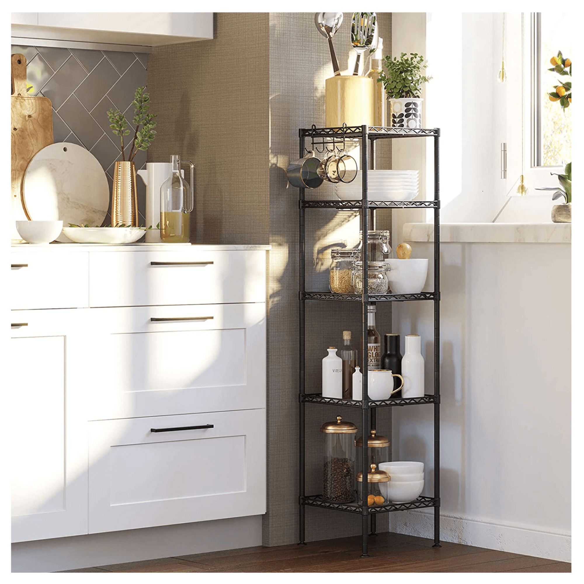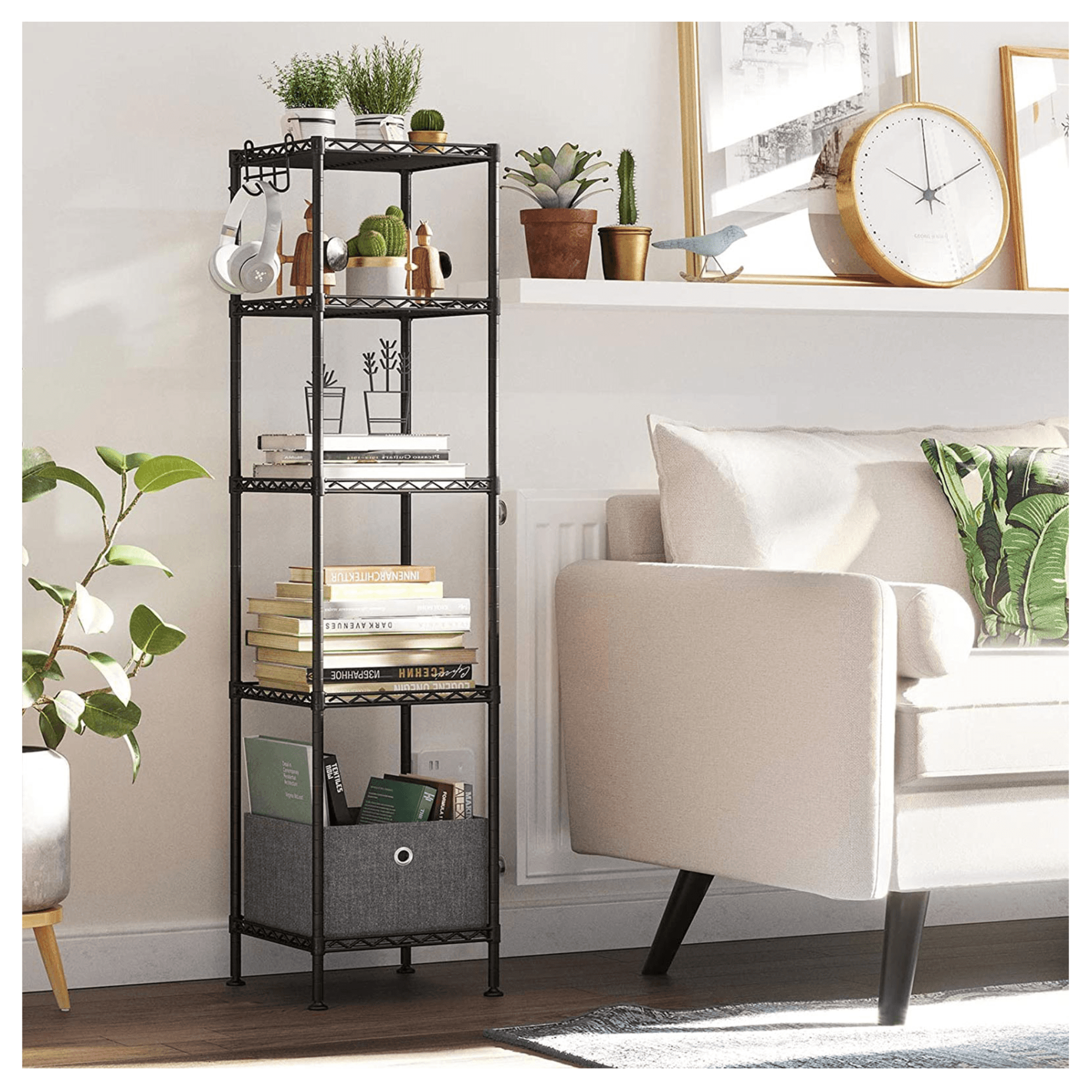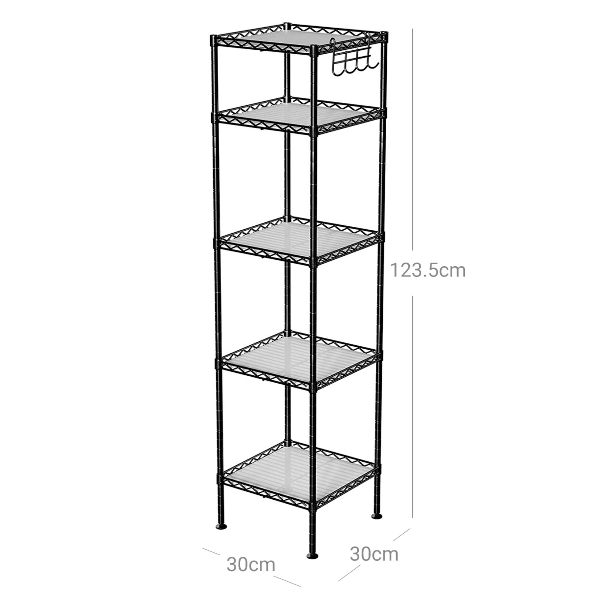 Úsporný policový regál zaberá málo cenného miesta, ale perfektne využíva vertikálny priestor a poskytuje tak dostatok úložného priestoru na všetky nevyhnutnosti či dekorácie. Kovovú konštrukciu dopĺňa 5 nastaviteľných políc ktorých dno pokrývajú priesvitné podložky, ktoré vyrovnávajú odkladacie plochy. Regál tiež disponuje 4 odnímateľnými háčikmi na zavesenie. Vďaka nastaviteľným nohám ľahko vyrovnáte nerovnosti podlahy.