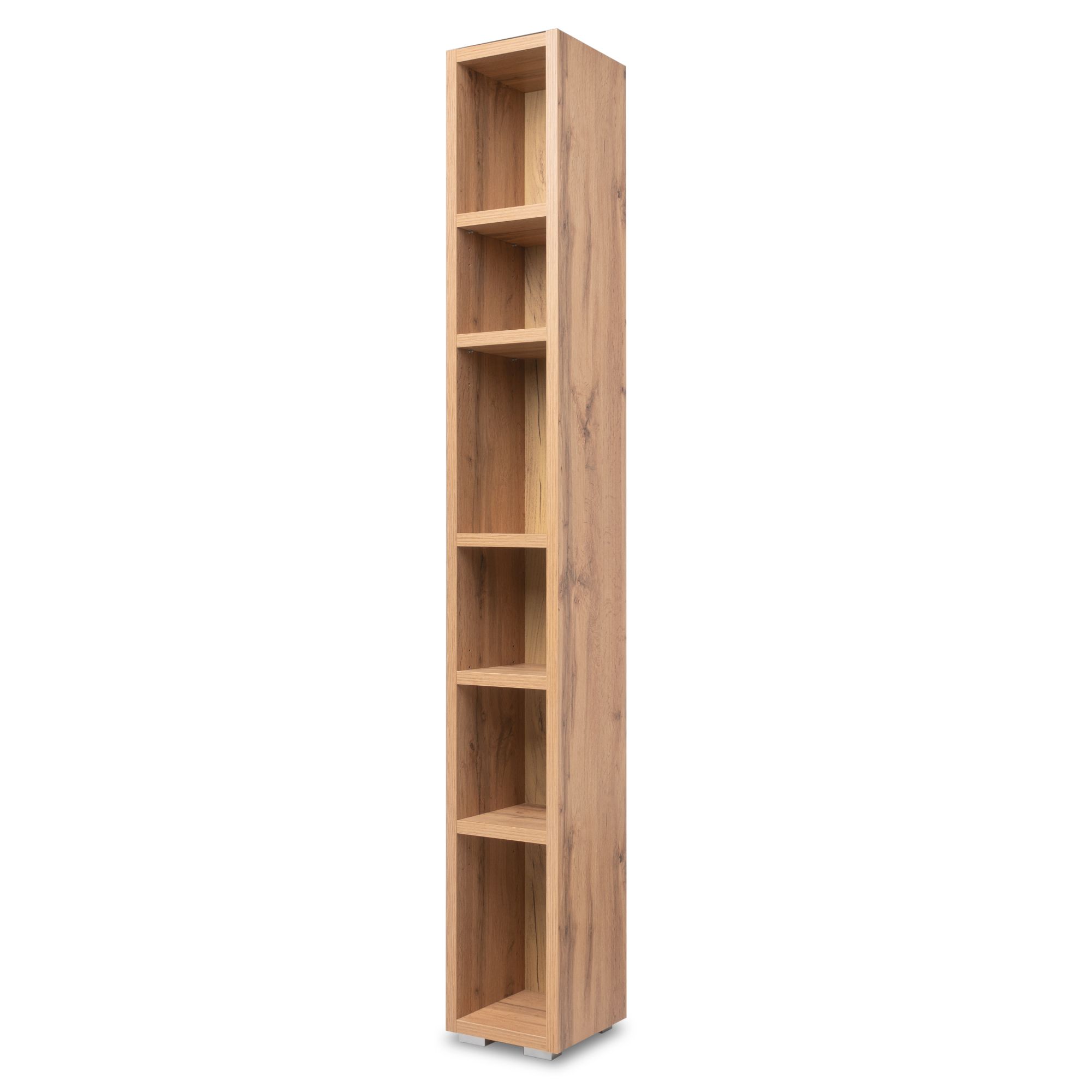 Regál ponúka dostatočne veľký odkladací priestor v podobe 5 vložených políc. Celkový vzhľad regálu dopĺňajú drobné plastové nôžky. Vďaka svojmu úzkemu vyhotoveniu regál perfektne využíva vertikálny priestor a je tak vhodný aj do menších miestností, kde nezaberie toľko cenného miesta. Vyrobený je z laminovanej drevotriesky, ktorá je nenáročná na údržbu. ABS hrany navyše znižujú riziko mechanického poškodenia.