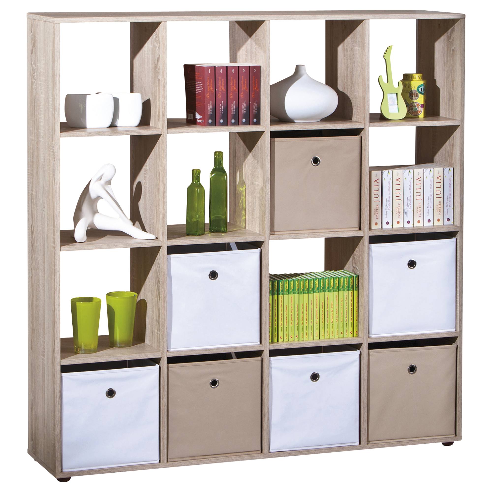 Konštrukcia z laminovaného dreveného materiálu vyhotovená v nestarnúcom dekore duba sonoma poteší svojou ľahkou udržiavateľnosťou. Využijete ho ako knižnicu, otvorený úložný priestor na vystavenie vašich pokladov, na uskladnenie hračiek alebo tiež pomôže prakticky rozdeliť miestnosť a vytvoriť tak oddelený priestor. 12 vložených políc vytvára dostatok odkladacieho miesta v podobe celkovo 16 rovnako veľkých okien.