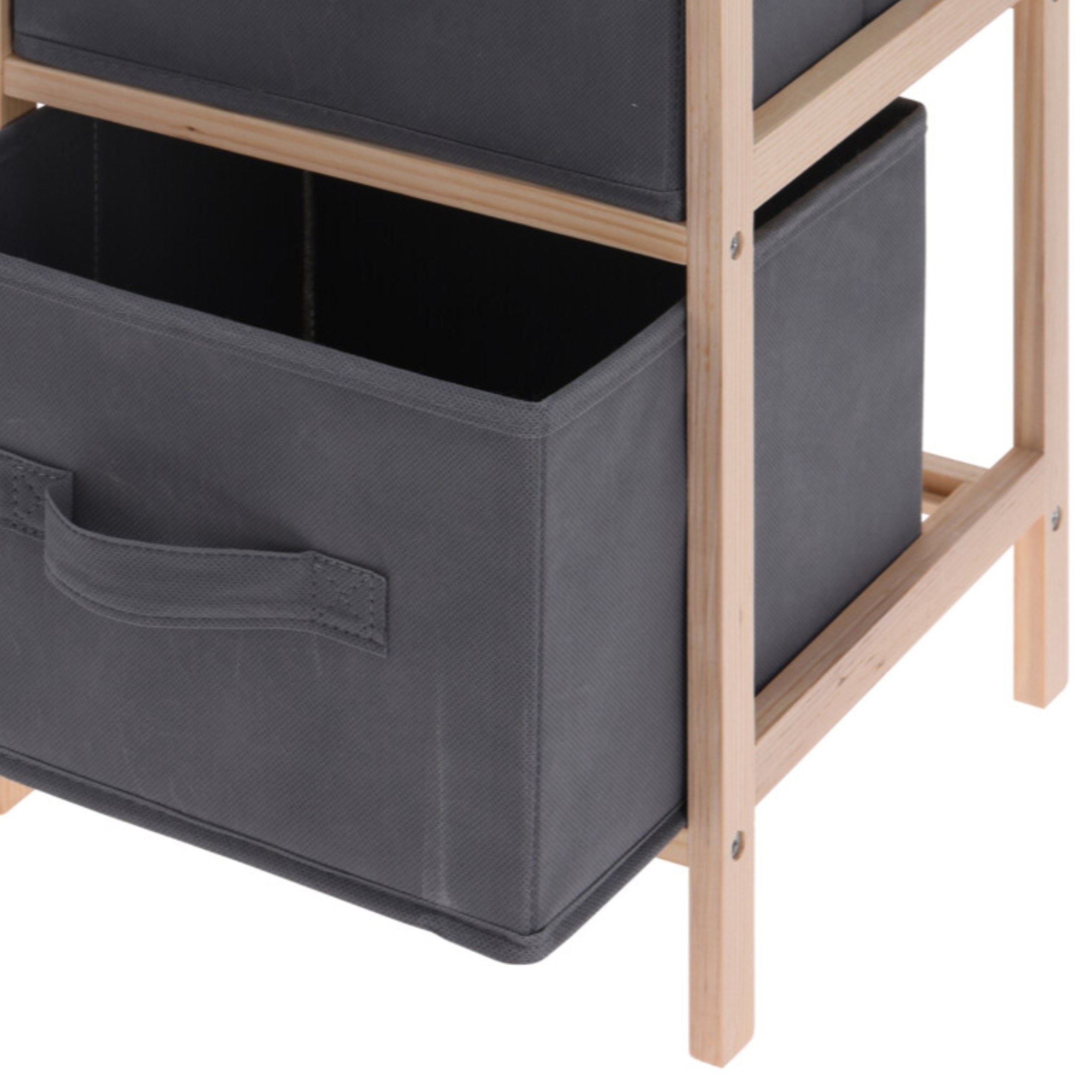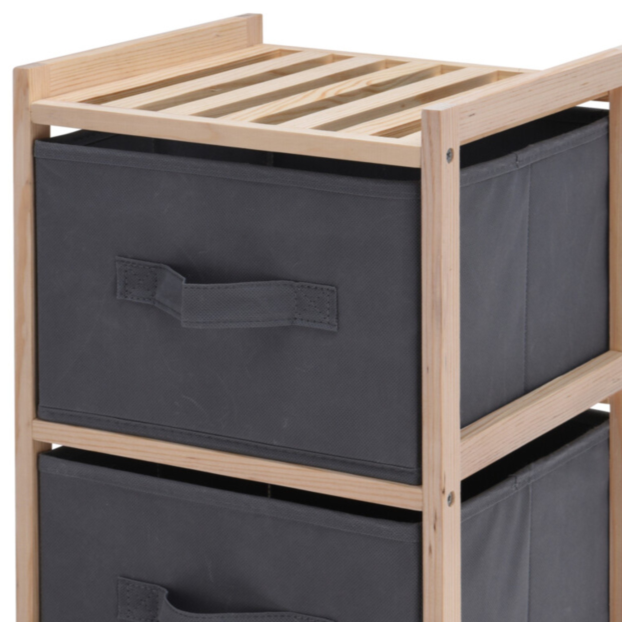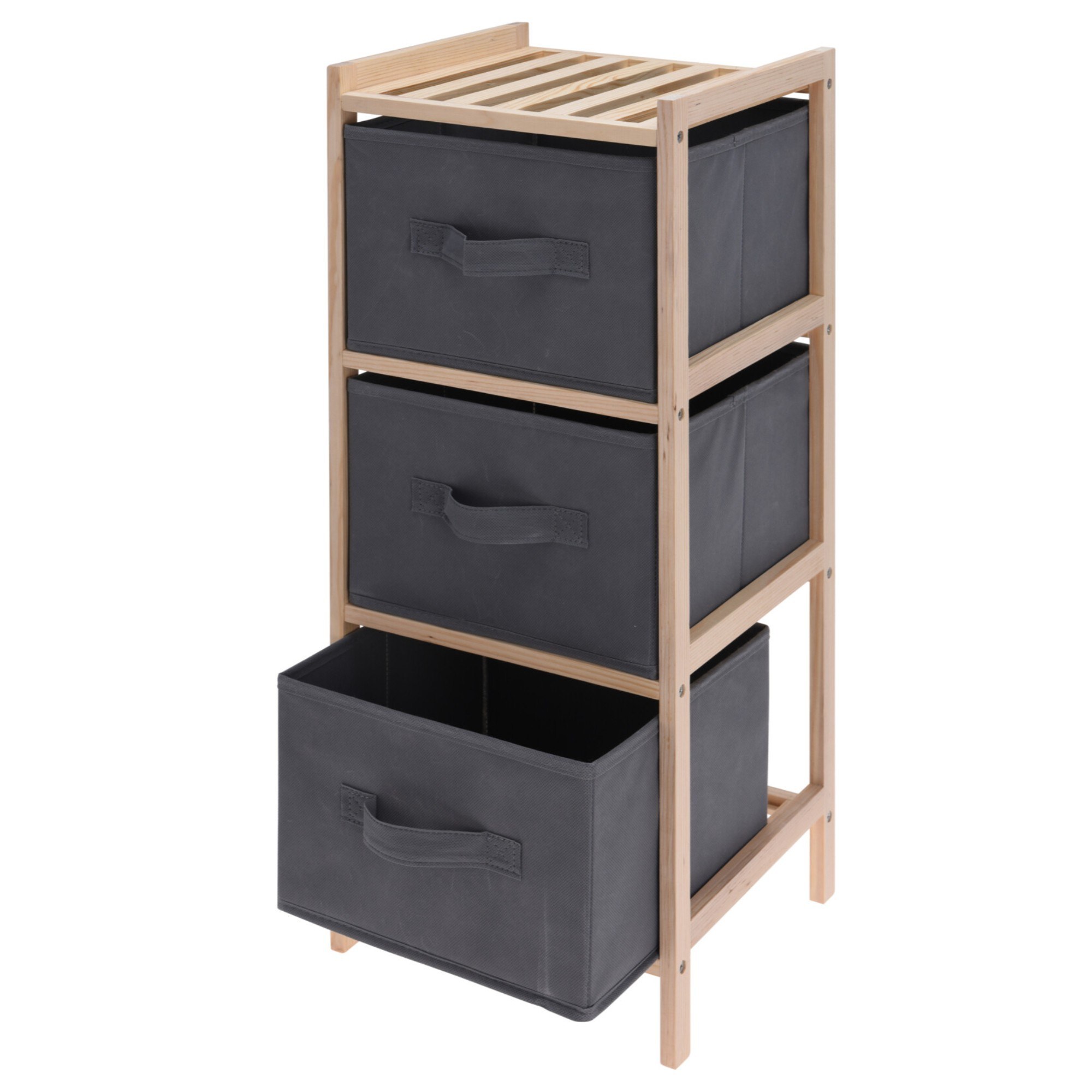 Regál MARYBETH ponúka jednoduché, ale praktické riešenie úložného priestoru. Na odloženie všetkého potrebného obsahuje tri zásuvné boxy z netkanej textílie. Všetko pohromade drží drevená konštrukcia s odkladacou plochou na vrchu. Vďaka tomuto vyhotoveniu nájde regál všestranné využitie.