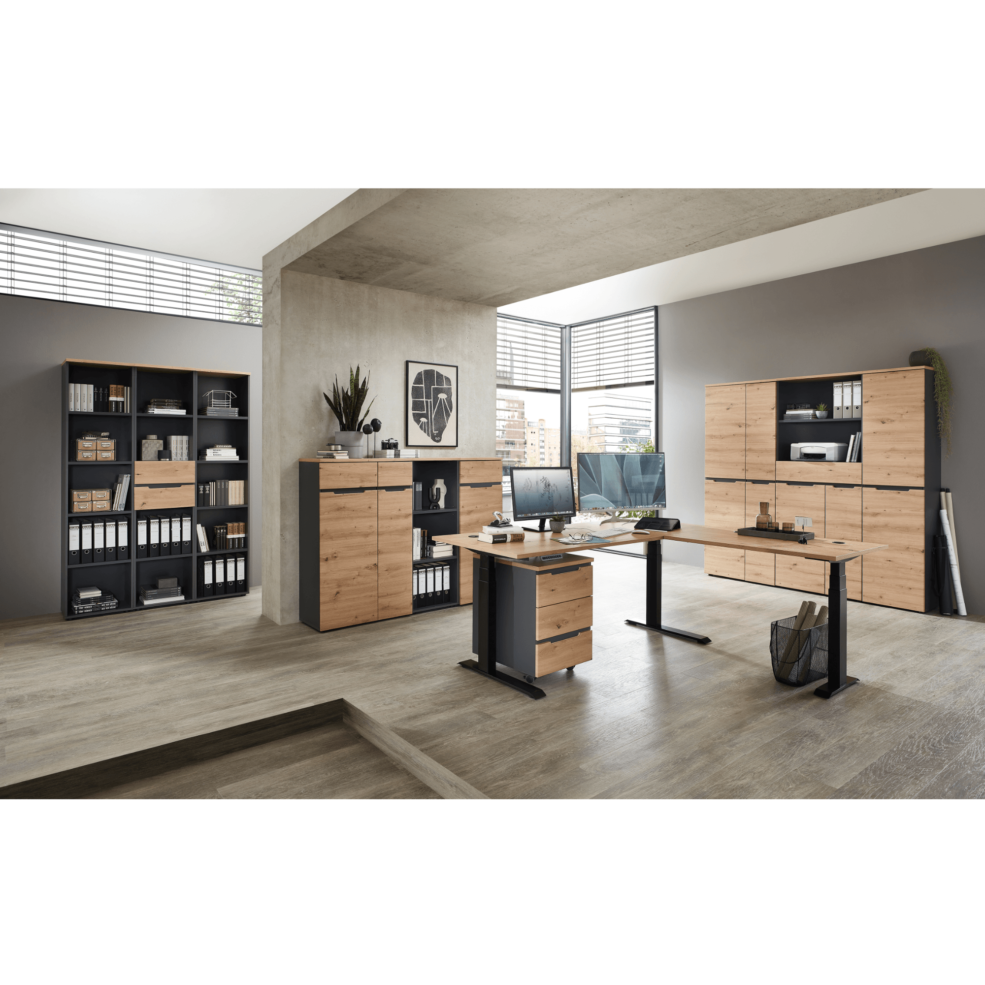 Vyrobený je z laminovaného dreveného materiálu, ktorý vyniká ľahkou udržiavateľnosťou aj dlhou životnosťou. Horná doska je ladená do dekora duba artisan, zatiaľ čo korpus je v kontrastnom grafitovom odtieni. Dostatočný úložný priestor zaisťujú štyri police.
