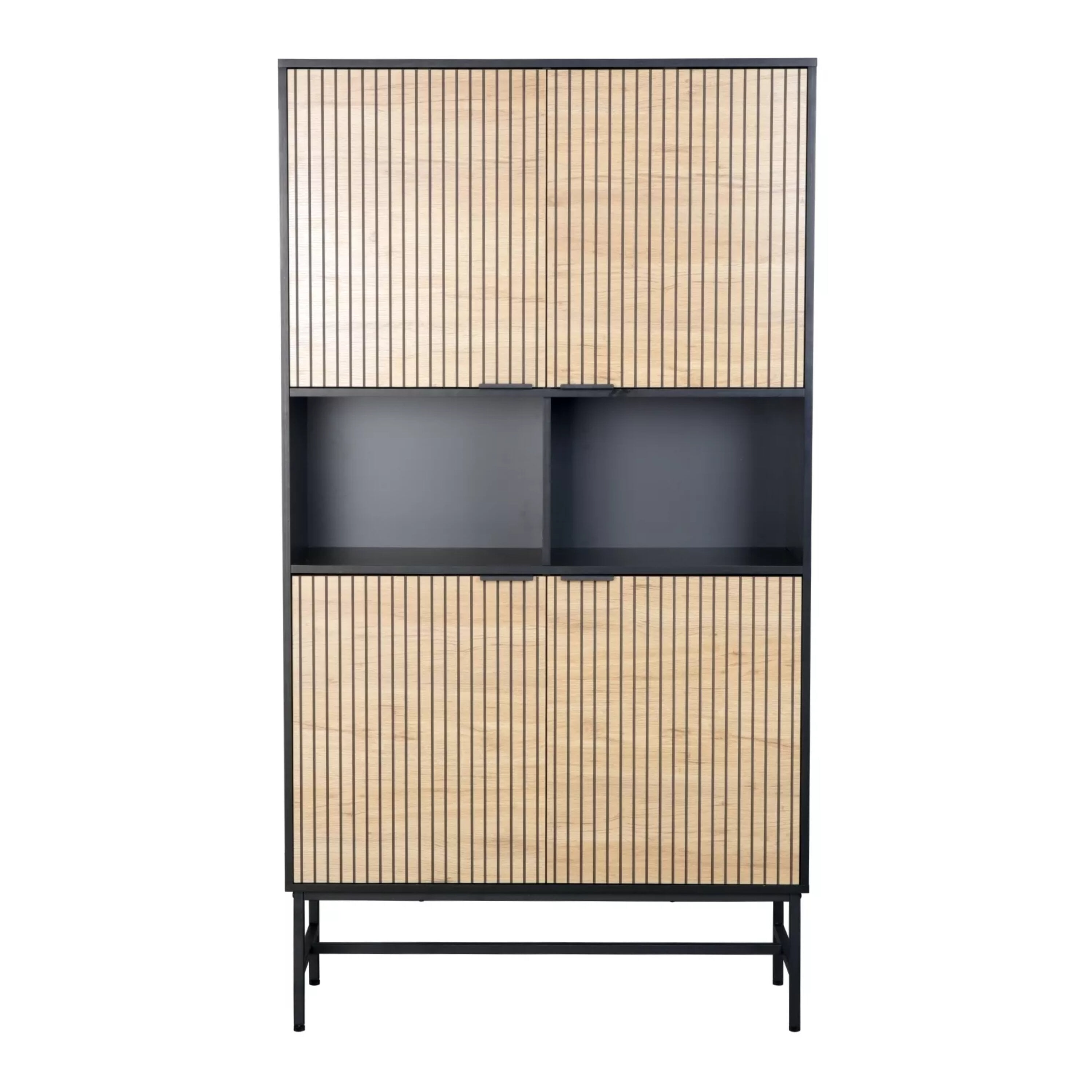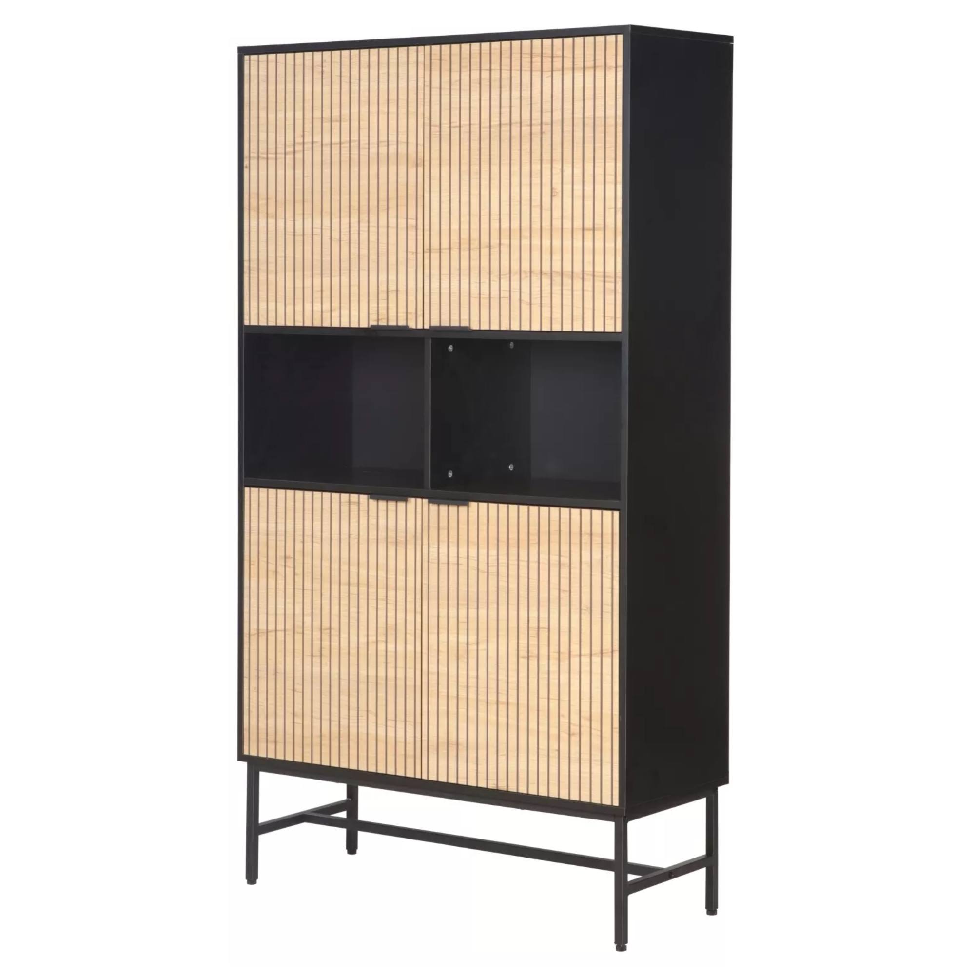 Disponuje 4 policami, ktoré sa ukrývajú za celkovo 4 otočnými dvierkami s praktickými úchytkami. Je doplnený aj otvoreným úložným priestorom, ideálnym na vystavenie dekorácií či sviatočného riadu. Dvierka sú doplnené imitáciou lamiel v dekore duba, ktorá dodáva regálu prírodný nádych. Hlavným materiálom je laminovaná drevotriesková doska v čiernej farbe. Jeho stabilitu zaisťuje kovová konštrukcia nôh. Vyniká svojou kontrastnou farebnou kombináciou, ktorá z neho robí zaujímavý dizajnový prvok, vhodný do viacerých interiérov. Skvele doplní vašu obývačku a bude spoľahlivým pomocníkom na vystavenie dekorácií či uloženie potrieb, ktoré potrebujete mať po ruke.