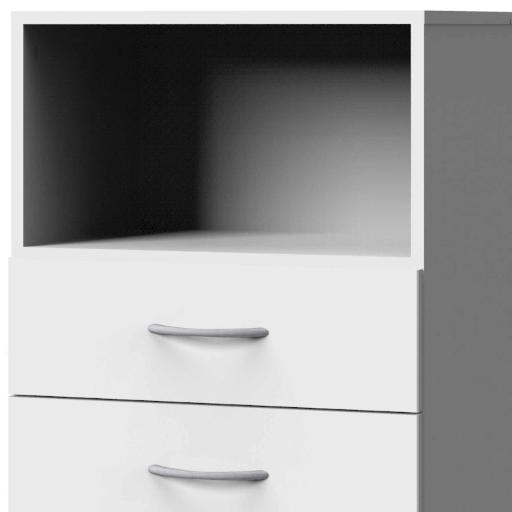 Regál obsahuje 1 vloženú policu, ktorá poskytuje dostatočný odkladací priestor a 3 zásuvky, ktoré ponúkajú praktický úložný priestor. Regál má korpus vyrobený z laminovaného dreveného materiálu a zásuvky z fóliovaného dreveného materiálu. Tieto materiály sú nenáročné na údržbu. Chcete mať interiér zjednotený do jedného štýlu? Pozrite sa na ďalší nábytok z rovnomenného nábytkového programu MULTIRAUMKONZEPT.