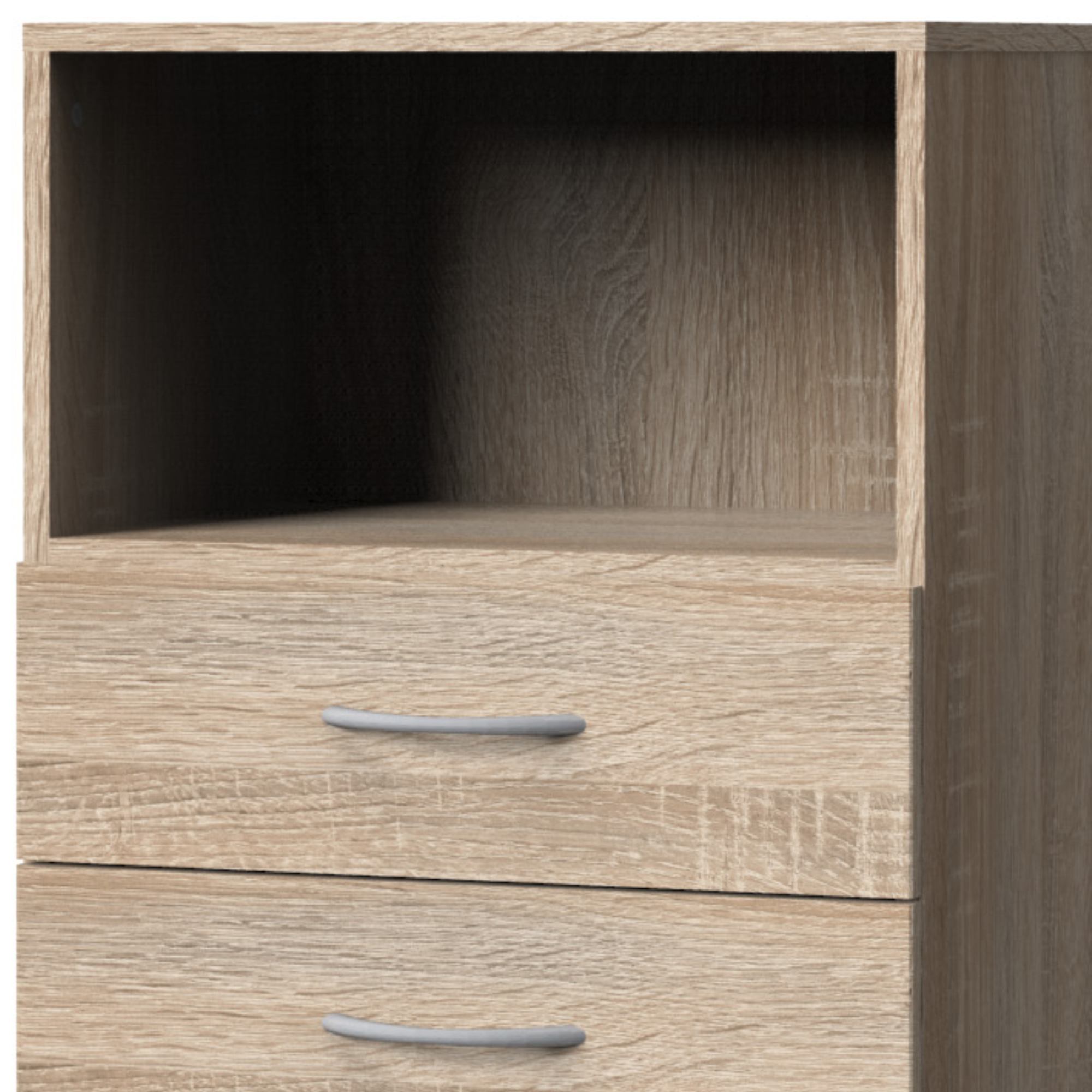 Regál obsahuje 1 vloženú policu, ktorá poskytuje dostatočný odkladací priestor a 3 zásuvky, ktoré ponúkajú praktický úložný priestor. Regál má korpus vyrobený z laminovaného dreveného materiálu a zásuvky z fóliovaného dreveného materiálu. Tieto materiály sú nenáročné na údržbu. Chcete mať interiér zjednotený do jedného štýlu? Pozrite sa na ďalší nábytok z rovnomenného nábytkového programu MULTIRAUMKONZEPT.