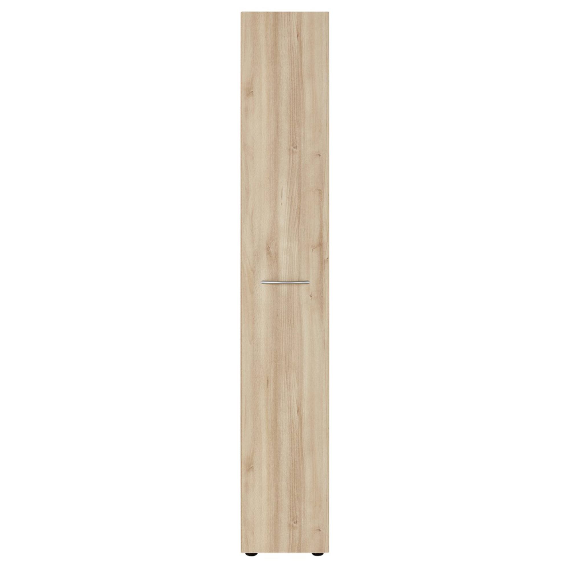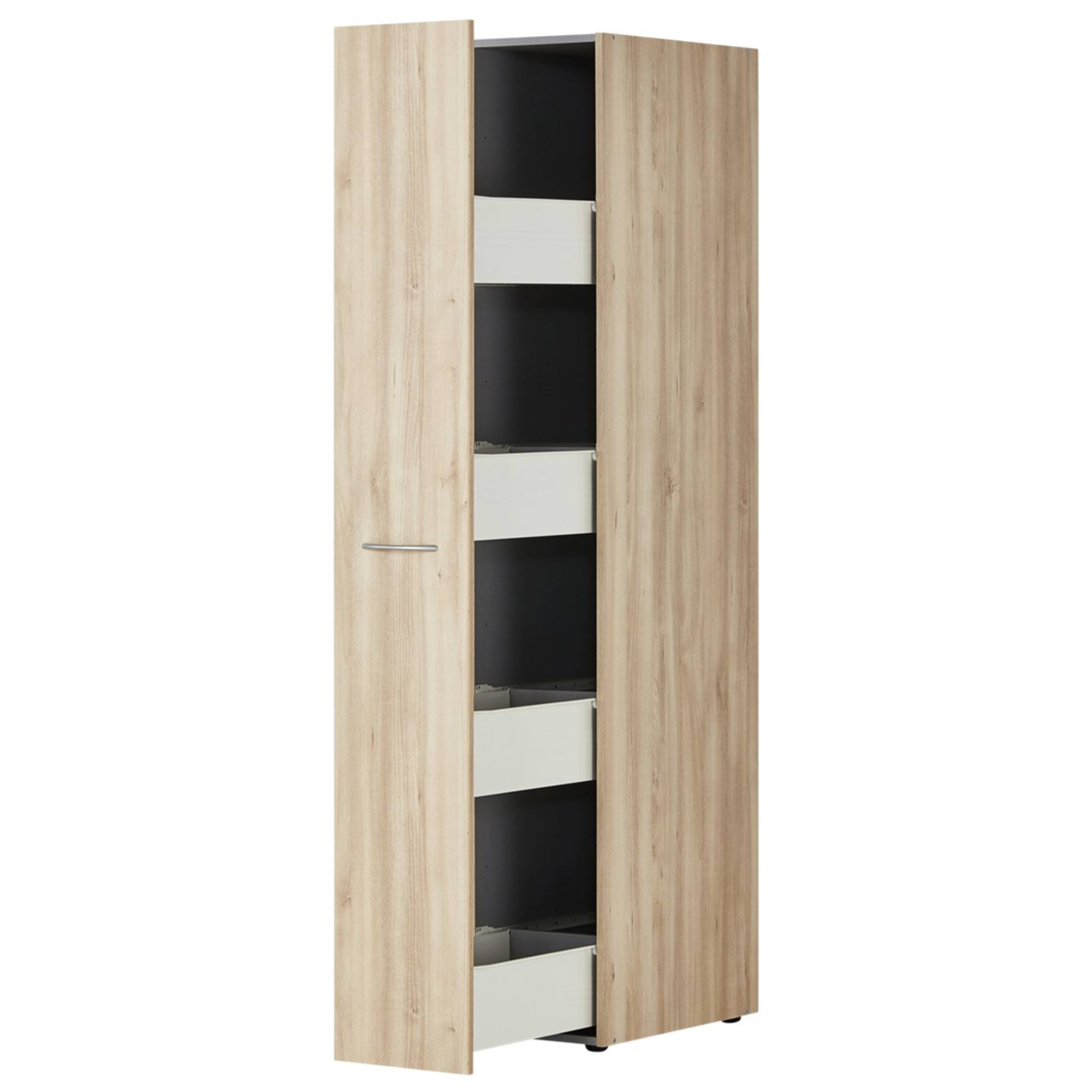 Regál má 1 vysúvacie dvierka, za ktorými sa nachádzajú 4 zásuvky. Tieto zásuvky sú praktickým úložným priestorom do interiéru. Regál má korpus vyrobený z laminovaného dreveného materiálu a dvierka z fóliovaného dreveného materiálu. Tieto materiály sú nenáročné na údržbu. Chcete mať interiér zjednotený do jedného štýlu? Pozrite sa na ďalší nábytok z rovnomenného nábytkového programu MULTIRAUMKONZEPT.