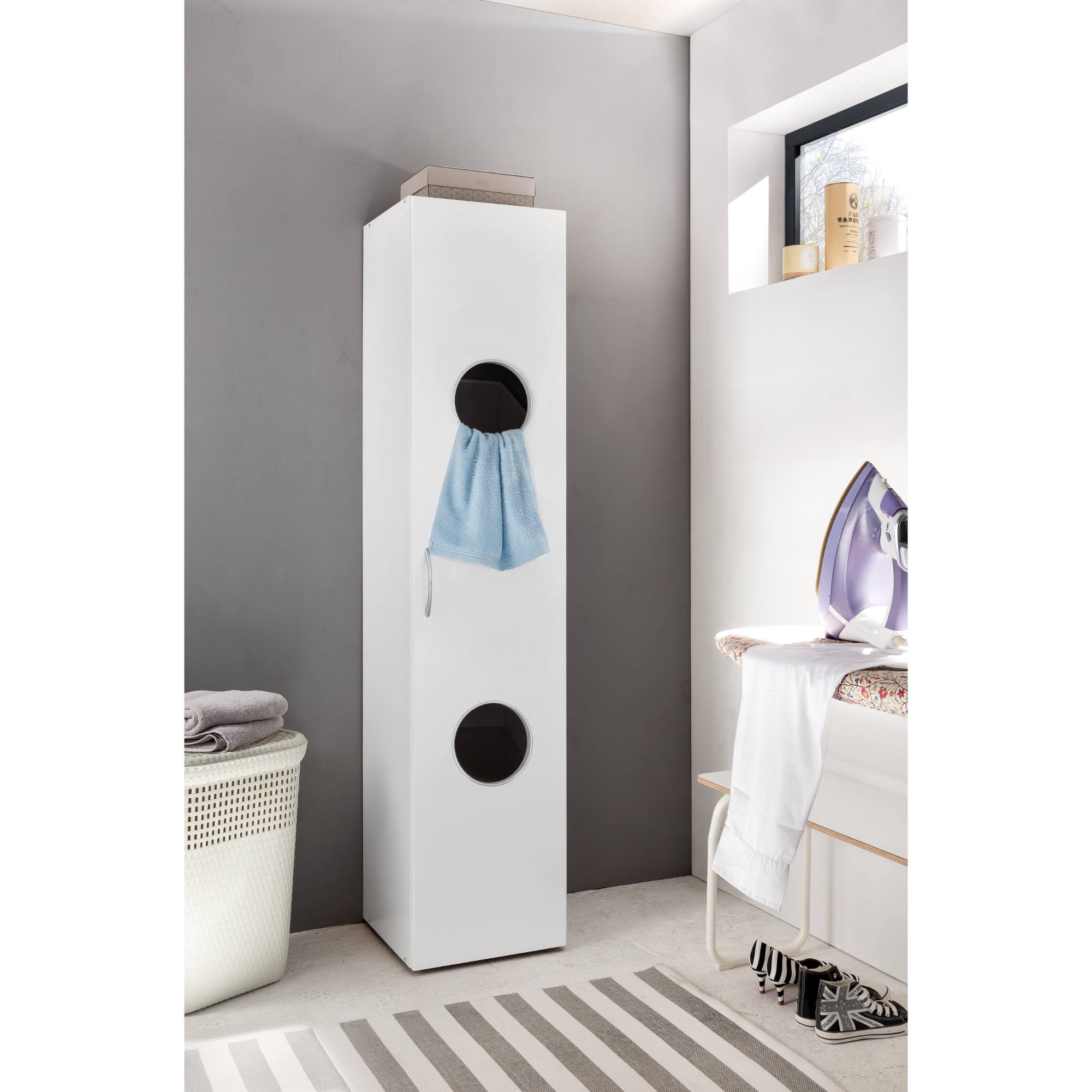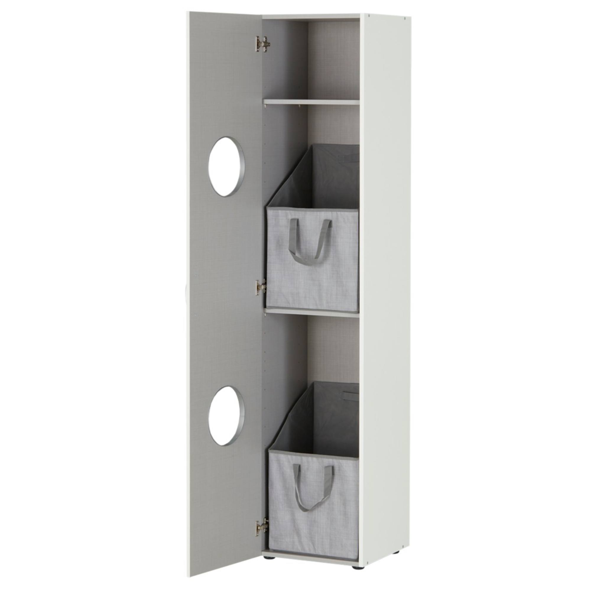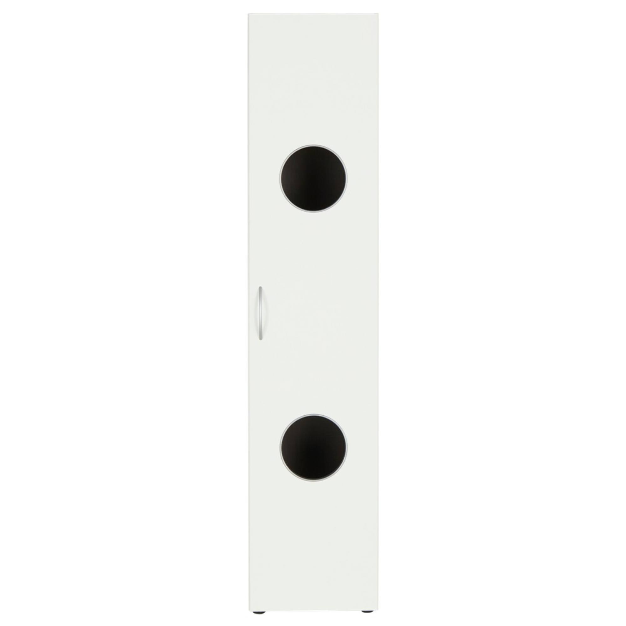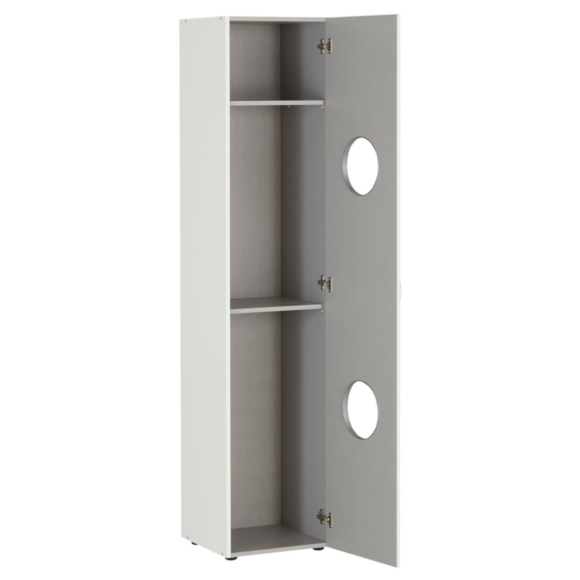 Disponuje 1 otočnými dverami s otvormi, ktoré uľahčujú otváranie. Vnútorné vybavenie regála je zostavené z 2 vložených políc. Regál obsahuje tiež 2 praktické boxy na uskladnenie oblečenia či iných predmetov. Regál je vyrobený z laminovaného dreveného materiálu, ktorý vás presvedčí svojou nenáročnosťou na údržbu. Chcete mať interiér zjednotený do jedného štýlu? Pozrite sa na ďalší nábytok z rovnomenného nábytkového programu MULTIRAUMKONZEPT.