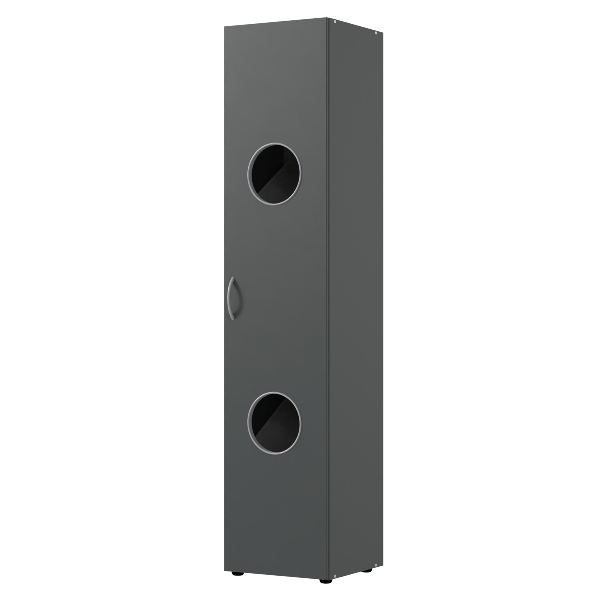 Disponuje 1 otočnými dverami s otvormi, ktoré uľahčujú otváranie. Vnútorné vybavenie regála je zostavené z 2 vložených políc. Regál obsahuje tiež 2 praktické boxy na uskladnenie oblečenia či iných predmetov. Regál je vyrobený z laminovaného dreveného materiálu, ktorý vás presvedčí svojou nenáročnosťou na údržbu. Chcete mať interiér zjednotený do jedného štýlu? Pozrite sa na ďalší nábytok z rovnomenného nábytkového programu MULTIRAUMKONZEPT.