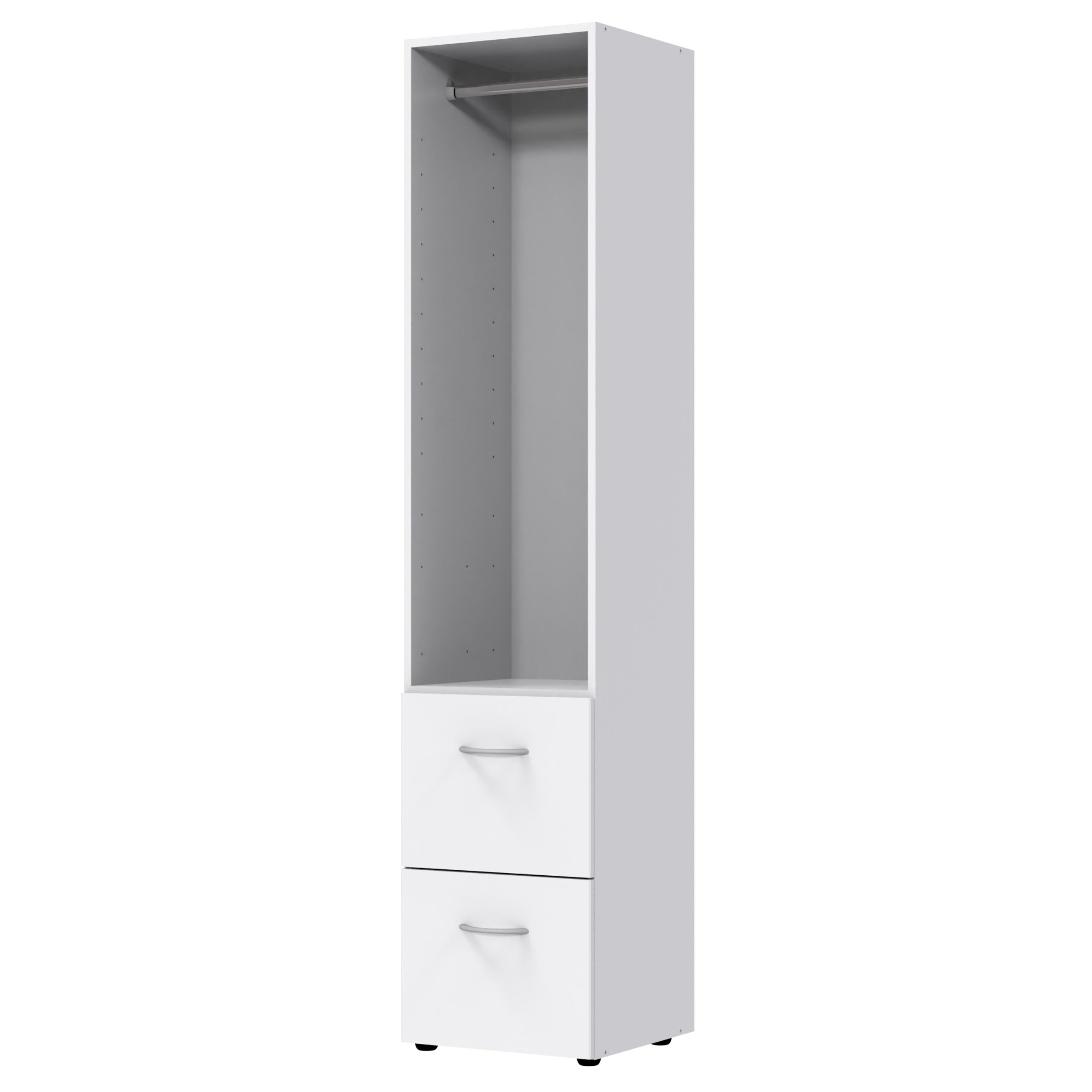Regál je vybavený 2 praktickými zásuvkami ktorých predné plochy sú doplnené o výrazné rúčky na ľahkú dennú manipuláciu. Vrchná časť navyše obsahuje šatníkovú tyč na komfortné zavesenie vonkajšieho a krčivého oblečenia. Konštrukcia regála je vyrobená z dreveného materiálu s povrchmi nenáročnými na údržbu.