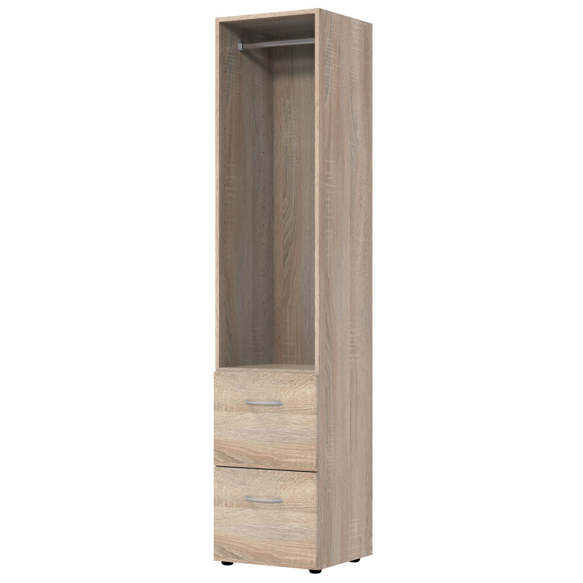 Regál je vybavený 2 praktickými zásuvkami ktorých predné plochy sú doplnené o výrazné rúčky na ľahkú dennú manipuláciu. Vrchná časť navyše obsahuje šatníkovú tyč na komfortné zavesenie vonkajšieho a krčivého oblečenia. Konštrukcia regála je vyrobená z dreveného materiálu s povrchmi nenáročnými na údržbu.