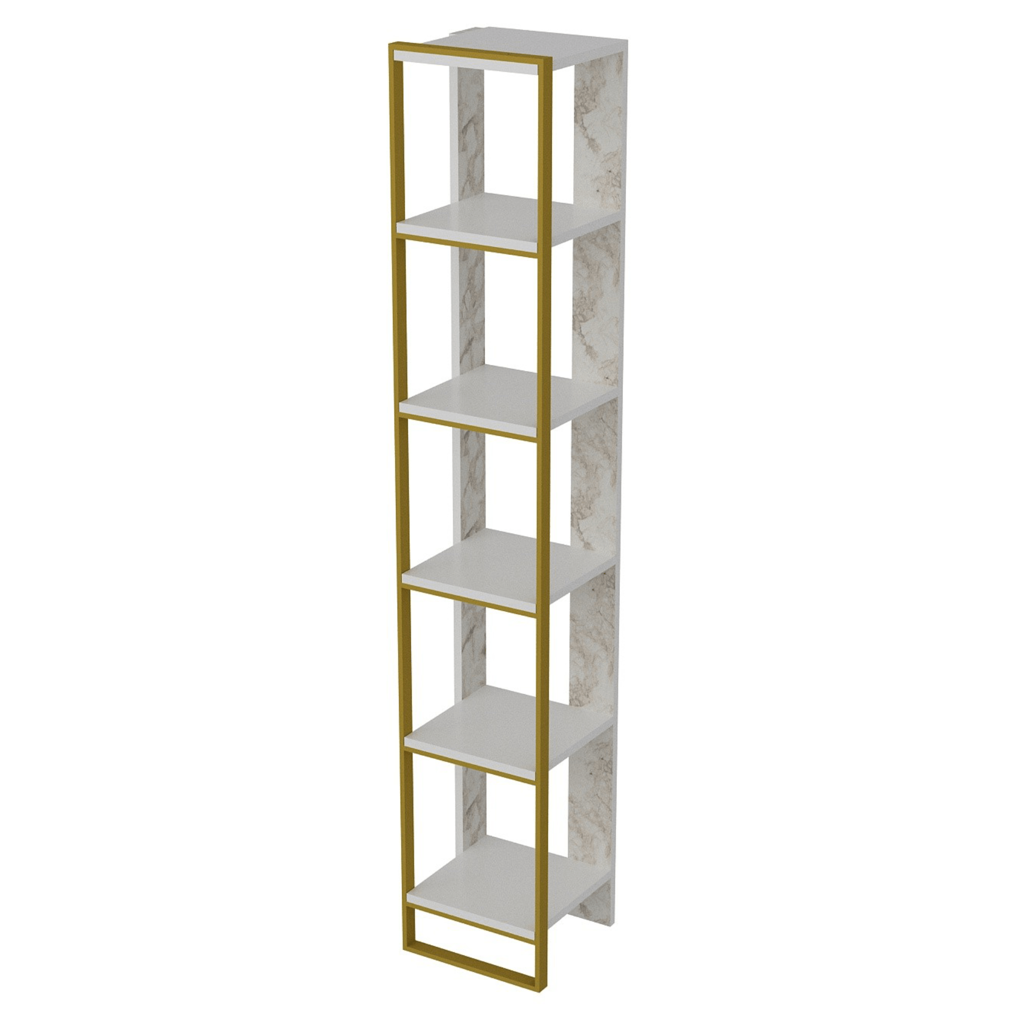 Moderné vyhotovenie vo veľmi atraktívnej kombinácii bieleho mramoru a zlatej farby pôsobí luxusne a interiéru dodá potrebný šmrnc. Ponúka zo všetkých strán otvorený úložný priestor, ktorý umožňuje rôznorodé využitie. Vybavený je 5 vloženými policami poskytujúcimi dostatok miesta nielen na knihy, ale aj na rastliny, fotografie a ďalšie najrôznejšie dekorácie. Vďaka svojmu praktickému vyhotoveniu do výšky perfektne využíva vertikálny priestor a je tak ideálnym kusom nábytku aj do menších miestností, kde nezaberie toľko cenného miesta. Vyrobený je z laminovaného dreveného materiálu, ktorý nie je náročný na údržbu.
