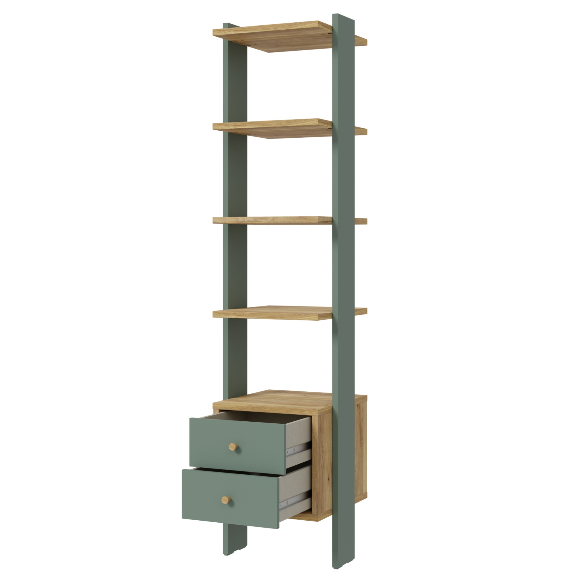 Regál NESRYN v štýlovej kombinácii šalviovo zelenej farby a prírodného dekora duba mauvella zdôrazní moderný vzhľad vášho domova.
