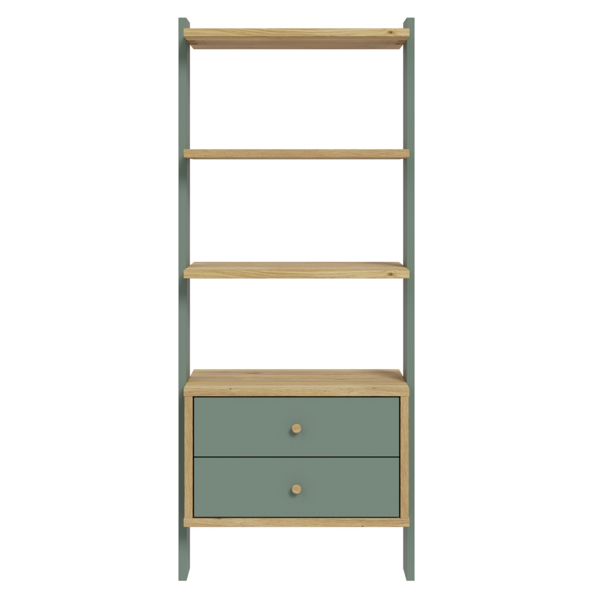Regál NESRYN v štýlovej kombinácii šalviovo zelenej farby a prírodného dekora duba mauvella zdôrazní moderný vzhľad vášho domova.