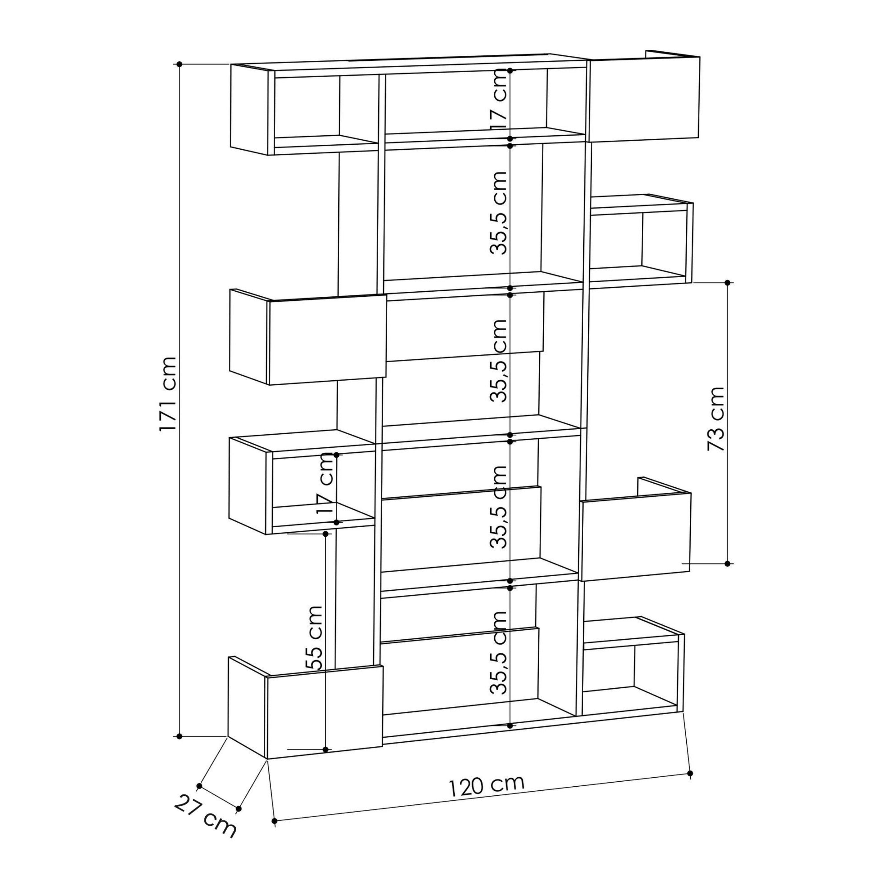 Regál NIHO upúta svojou nelineárnou konštrukciou a rozvrhnutou úložnou plochou. Tieto prvky spoločne s výraznými farebnými odtieňmi utvárajú celistvý moderný štýl. Vďaka svojmu netradičnému dizajnu oživí nielen obývaciu izbu, ale aj knižnicu či pracovňu. Regál obsahuje v prostrednej časti dostatok políc na knihy a ostatné predmety. Bočné boxy si navyše nájdu miesto aj na kvety. Dostupný je vo viacerých farebných variantoch.