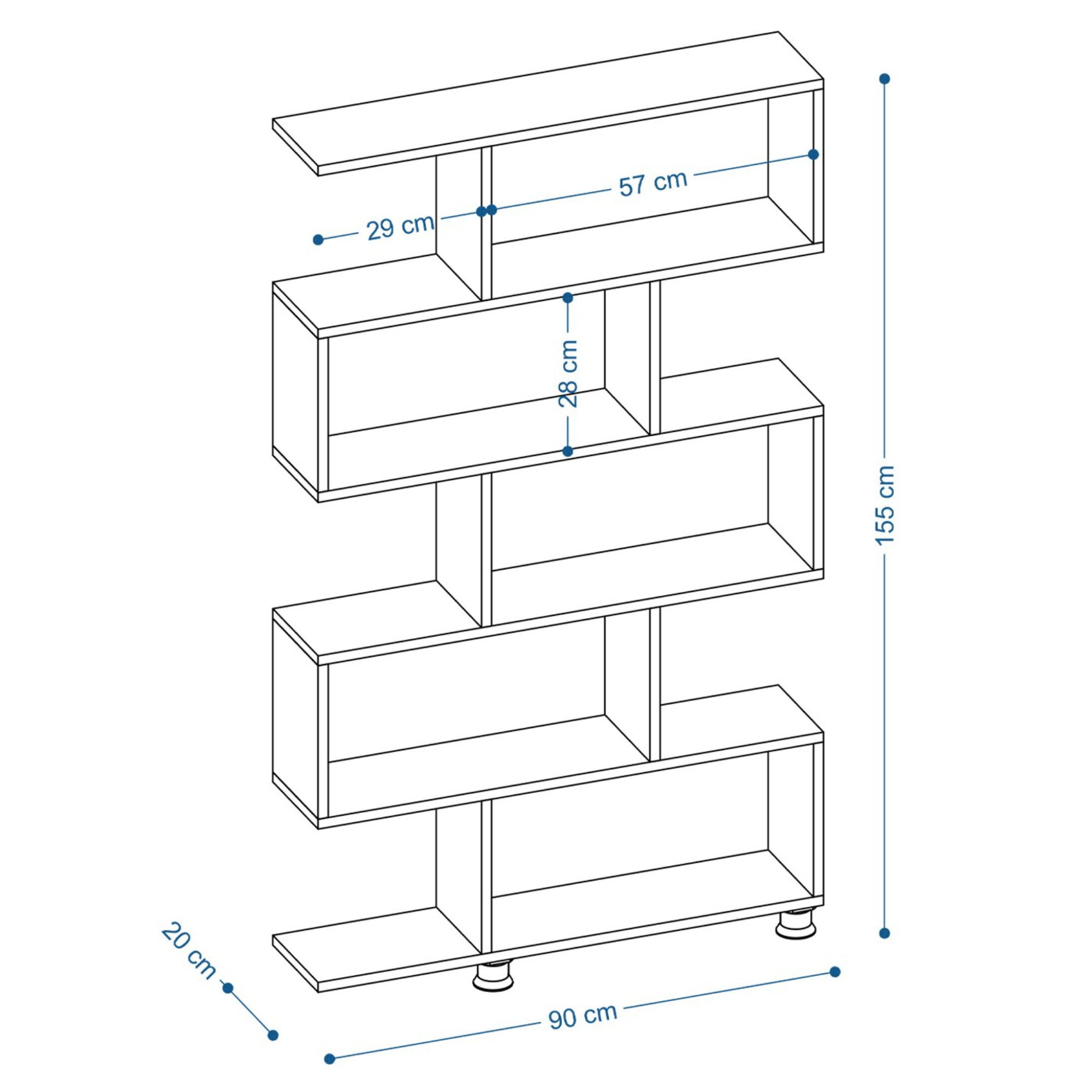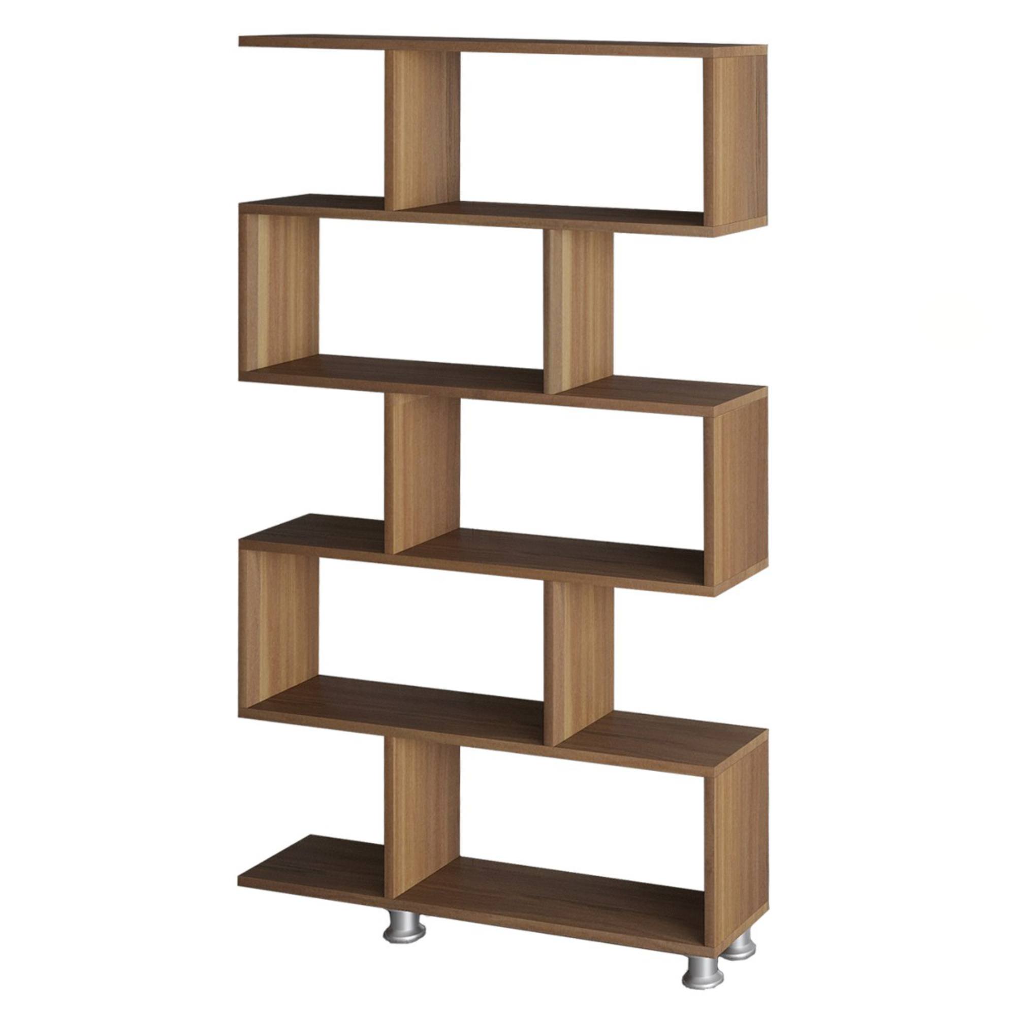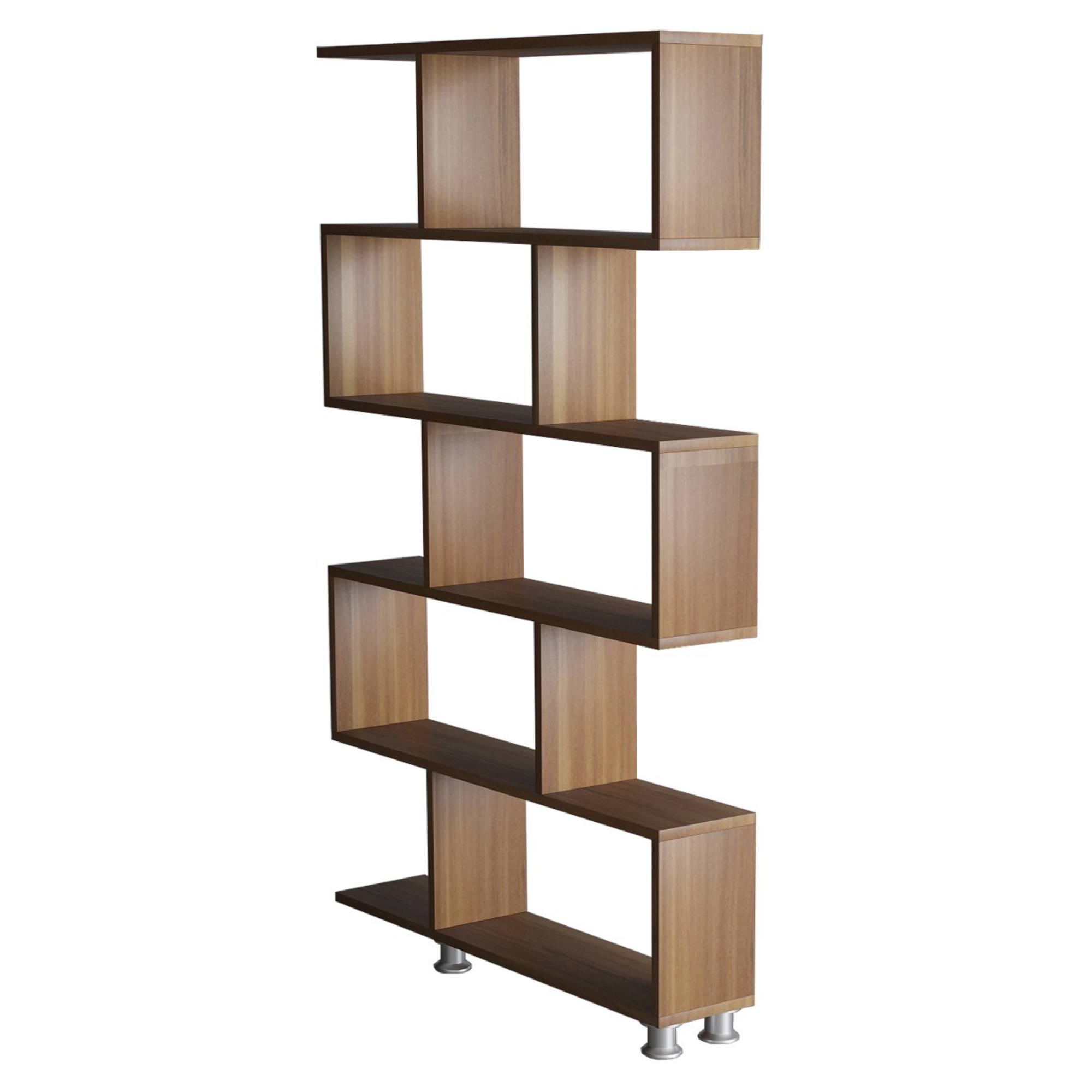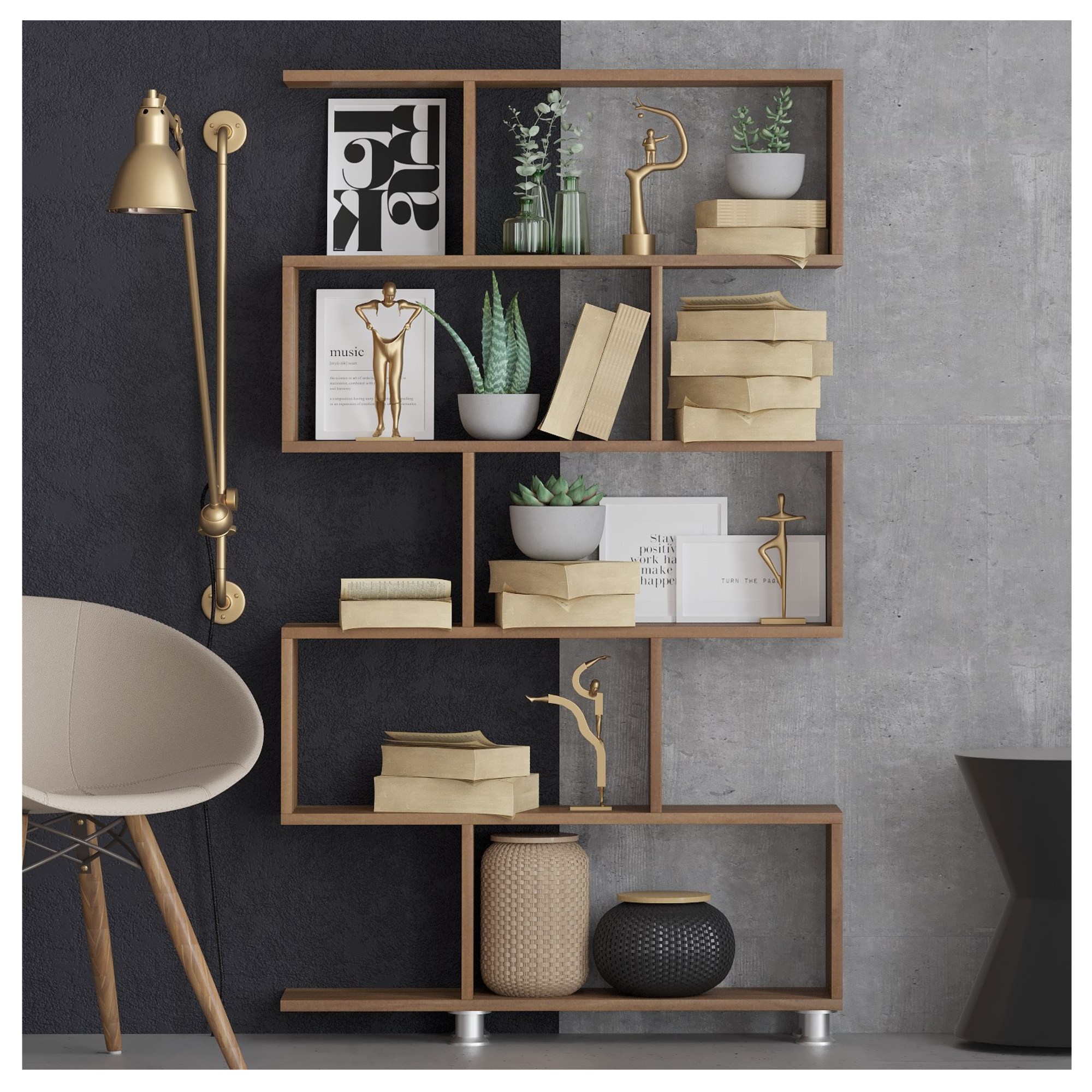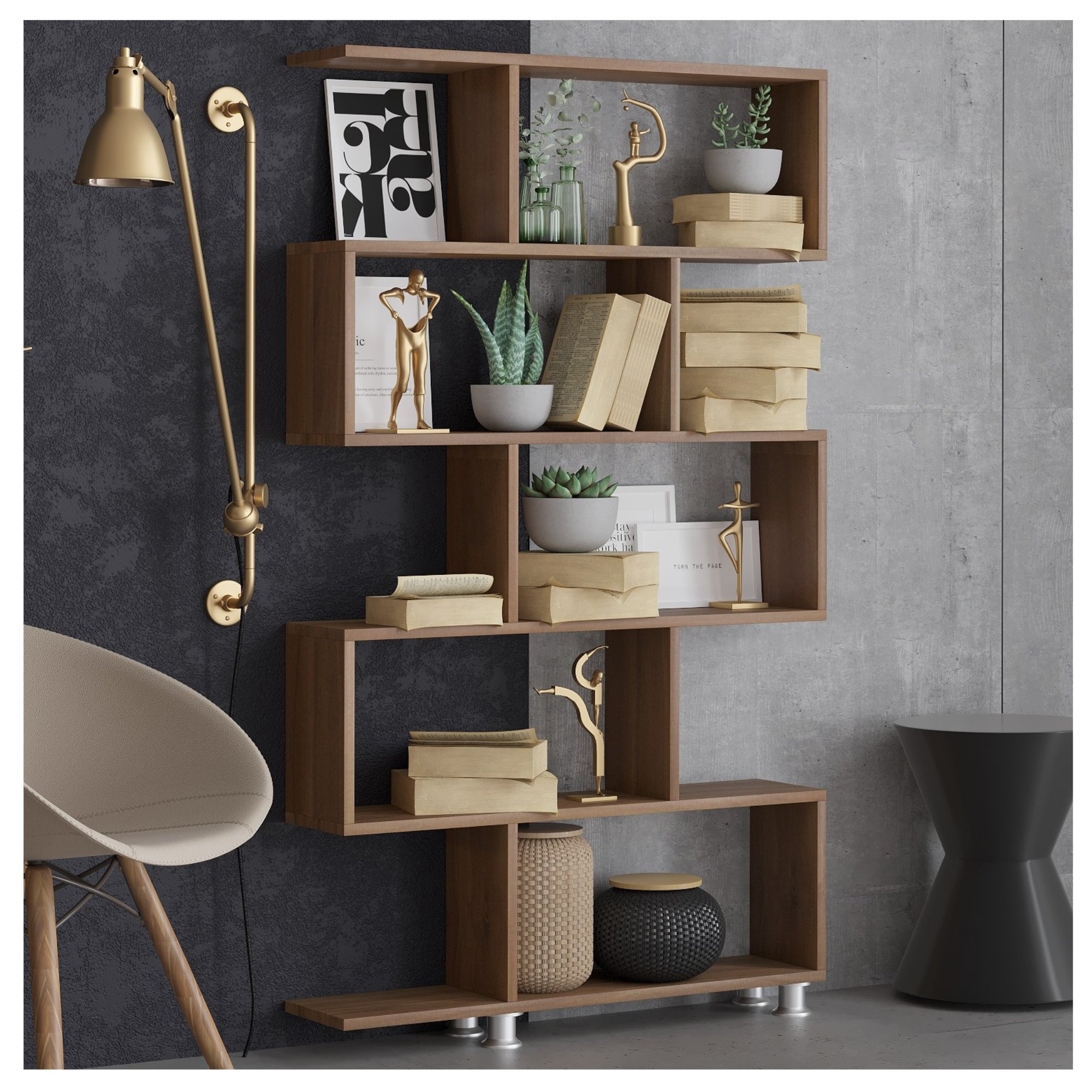 Disponuje policami, ktoré sú rozdelené na 10 úložných miest. Priestor je možné využiť na vaše knihy, časopisy, dekorácie a rastliny. Klasický dizajn v kombinácii s atypickou konštrukciou dotvára dekor orechu, ktorý je štýlovým doplnkom regálu. Je možné ho pripevniť k stene pre väčšiu stabilitu a bezpečnosť. Je vyrobený z laminovanej drevotrieskovej dosky, ktorá zaisťuje jeho ľahkú údržbu.