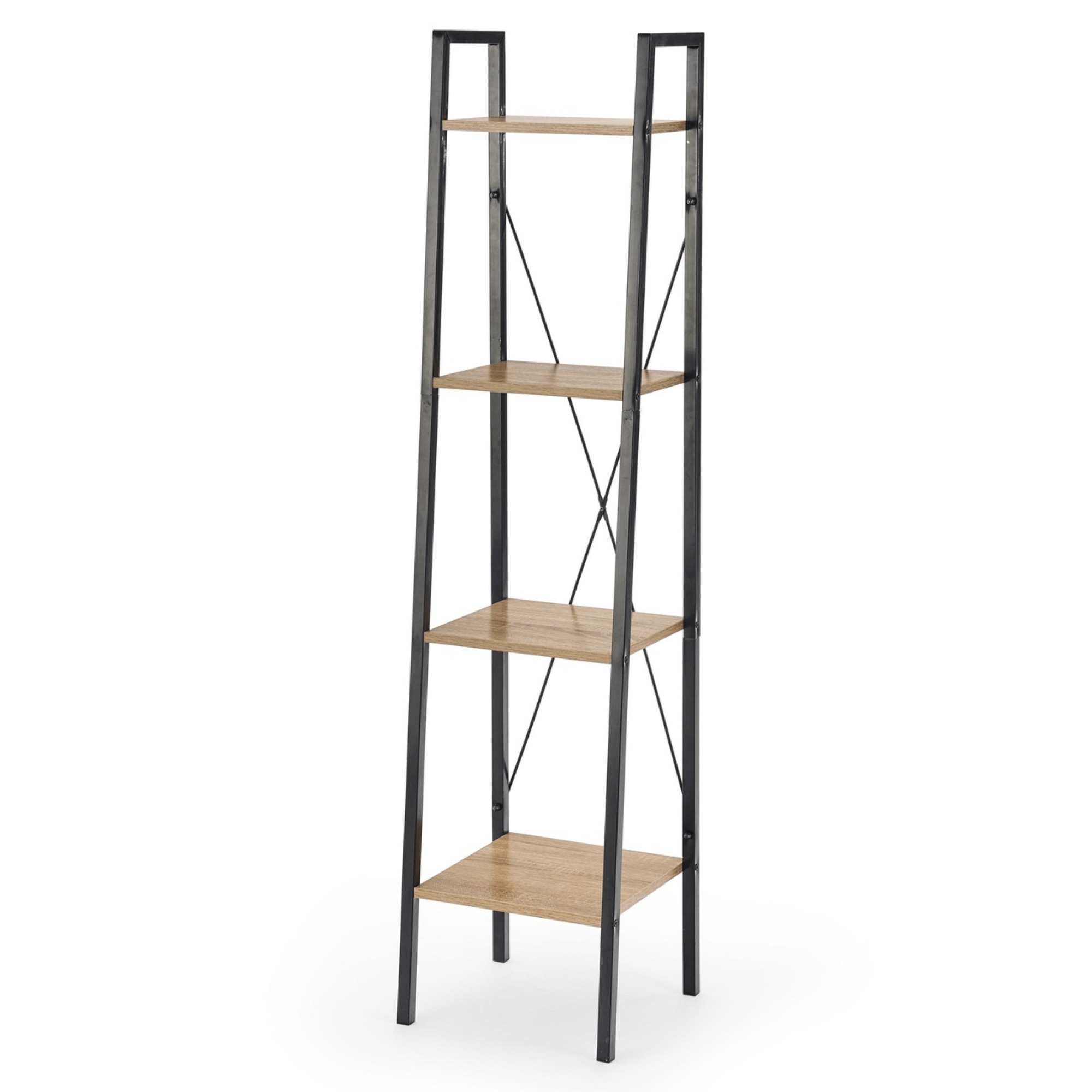Kombinácia práškovo lakovaného kovu a laminovaného dreveného materiálu v prírodnom dekore je ukážkou jednoduchého a praktického spracovania. Vďaka užším rozmerom a perfektnému využitiu vertikálneho priestoru ho ľahko umiestnite aj do menších priestorov. Aj napriek menšej veľkosti ponúka dostatok odkladacieho miesta v podobe 4 vložených políc. Zo zadnej strany je regál vybavený bezpečnostným prekrížením proti vypadnutiu predmetov z regála.
