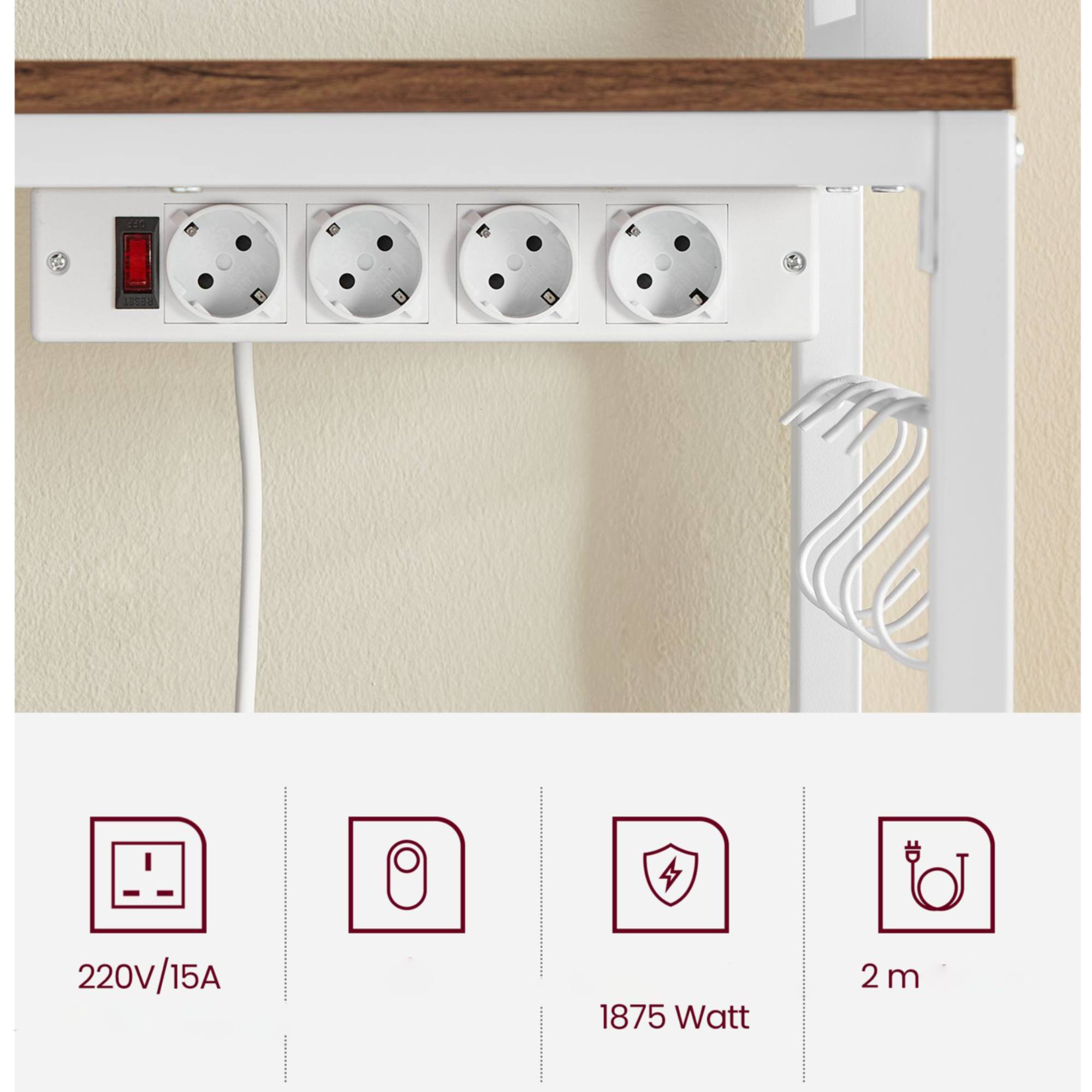 Na regáli NYKO 6 oceníte aj 4 zásuvky, do ktorých môžete zapojiť kuchynské spotrebiče, a 2 m dlhý kábel.
