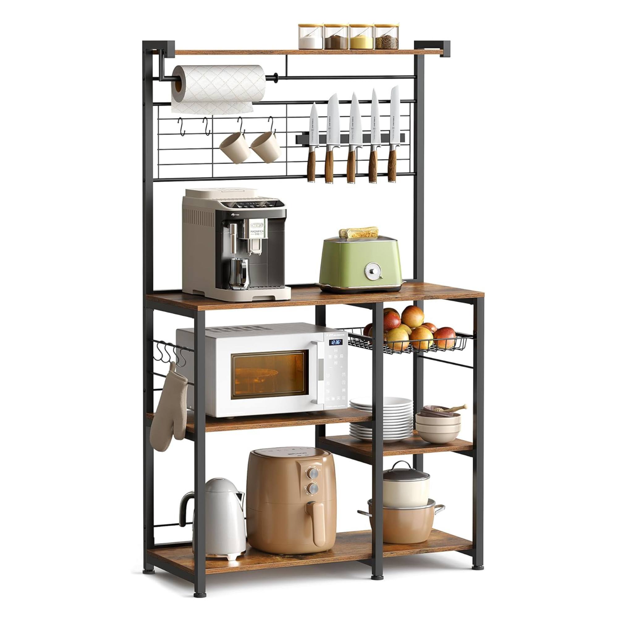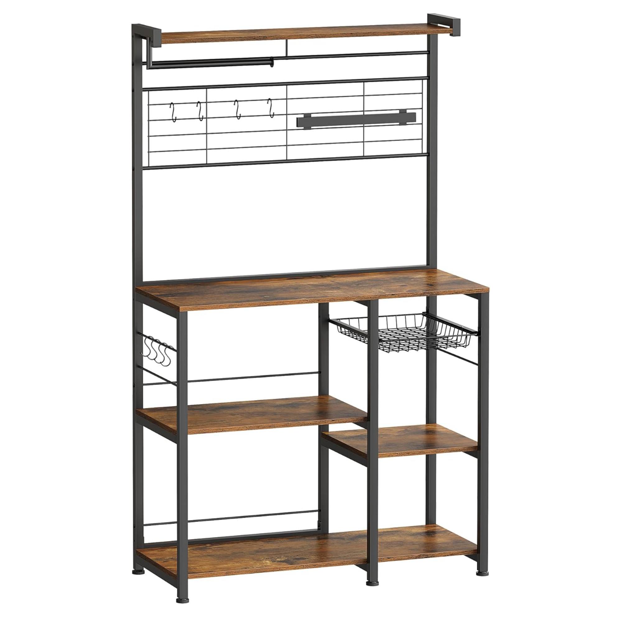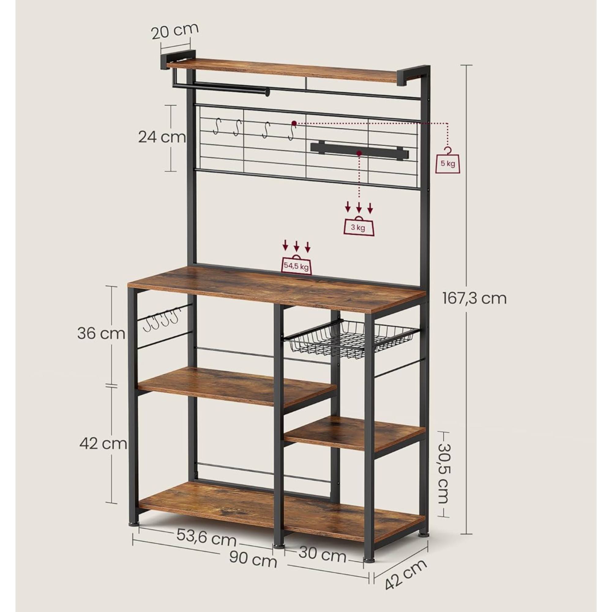 Súčasťou regála je 5 políc z ľahko udržiavateľnej laminovanej drevotrieskovej dosky, ktoré sú zasadené do pevnej kovovej konštrukcie. Nechýba ani 8 háčikov v tvare S, na ktoré si môžete zavesiť najčastejšie používané kuchynské náčinie.