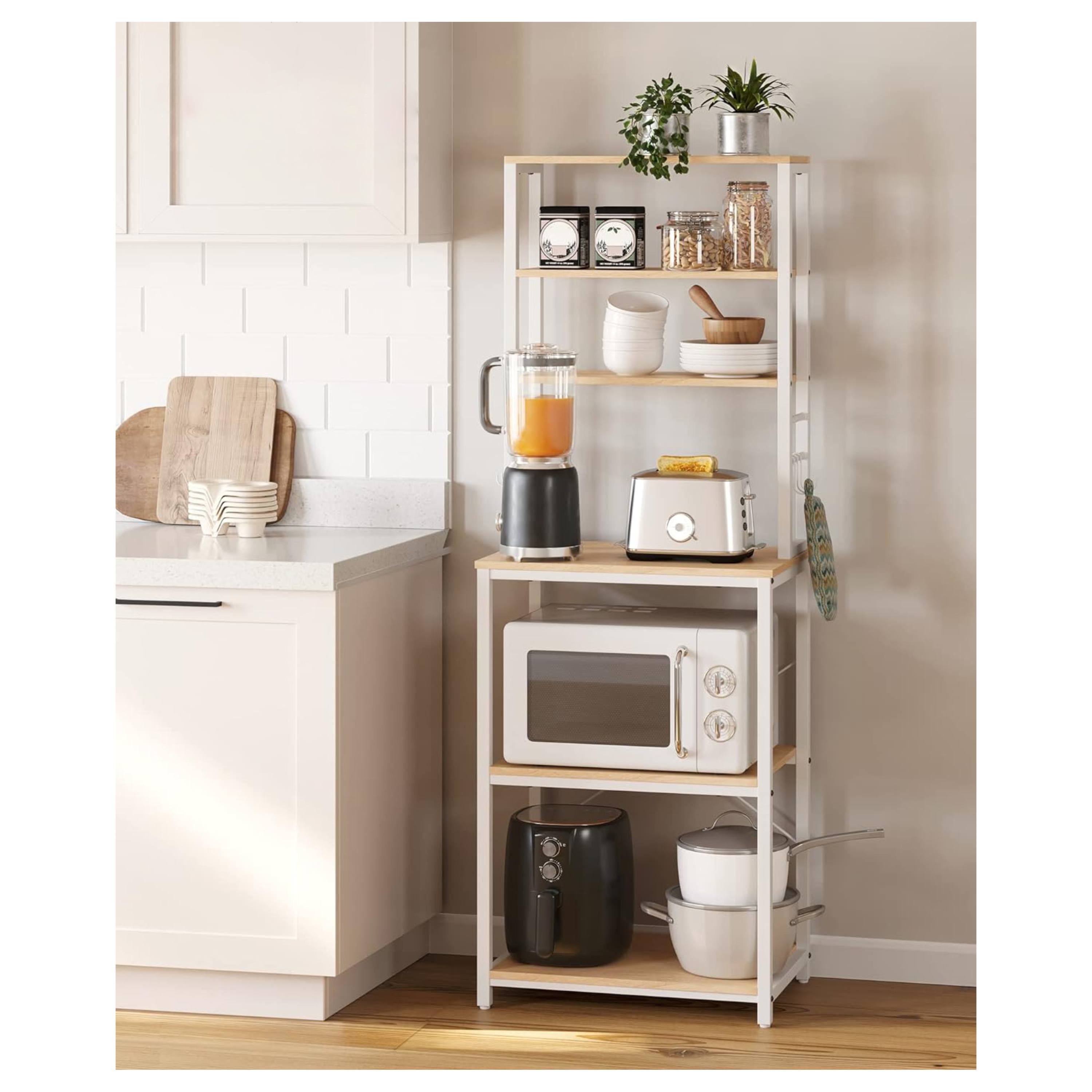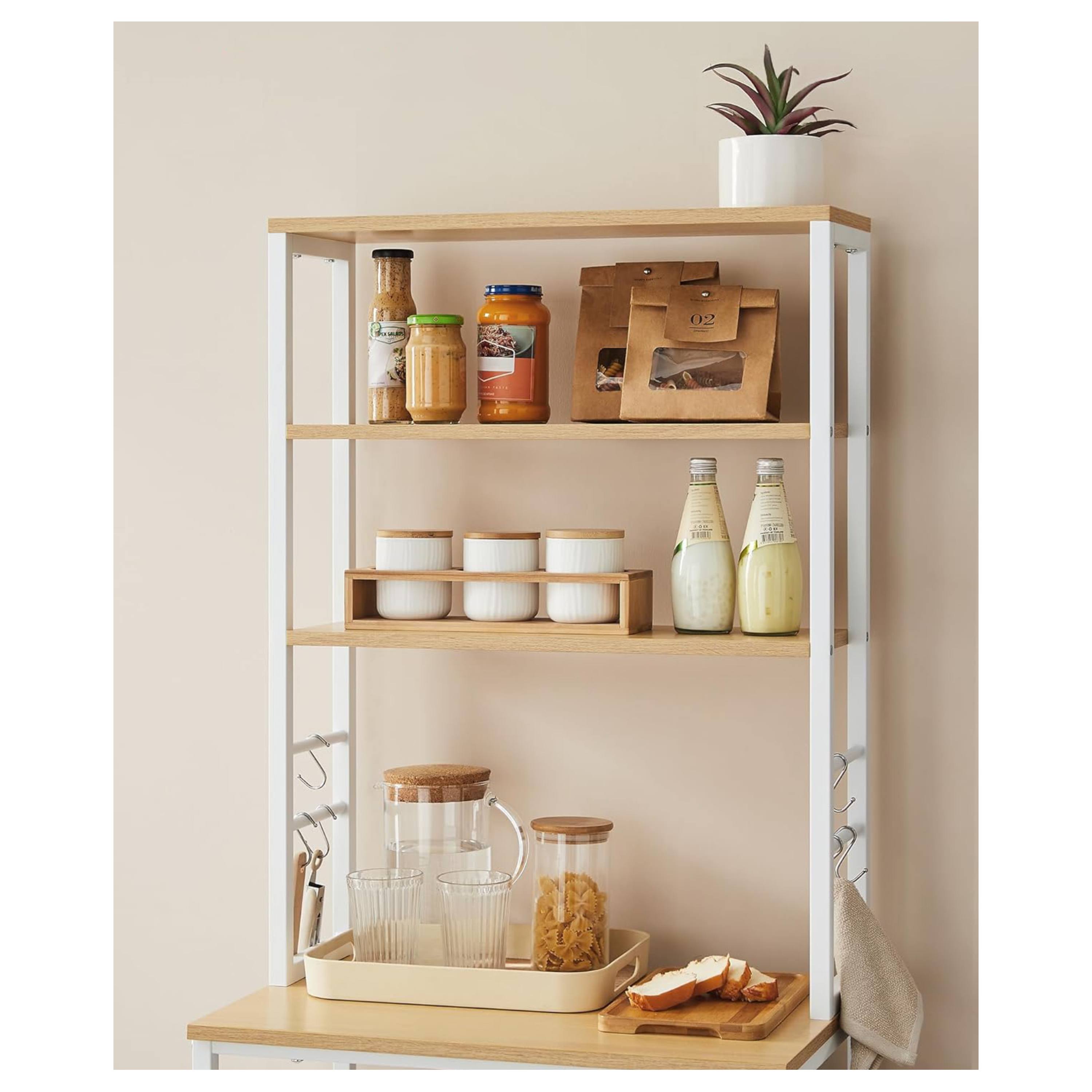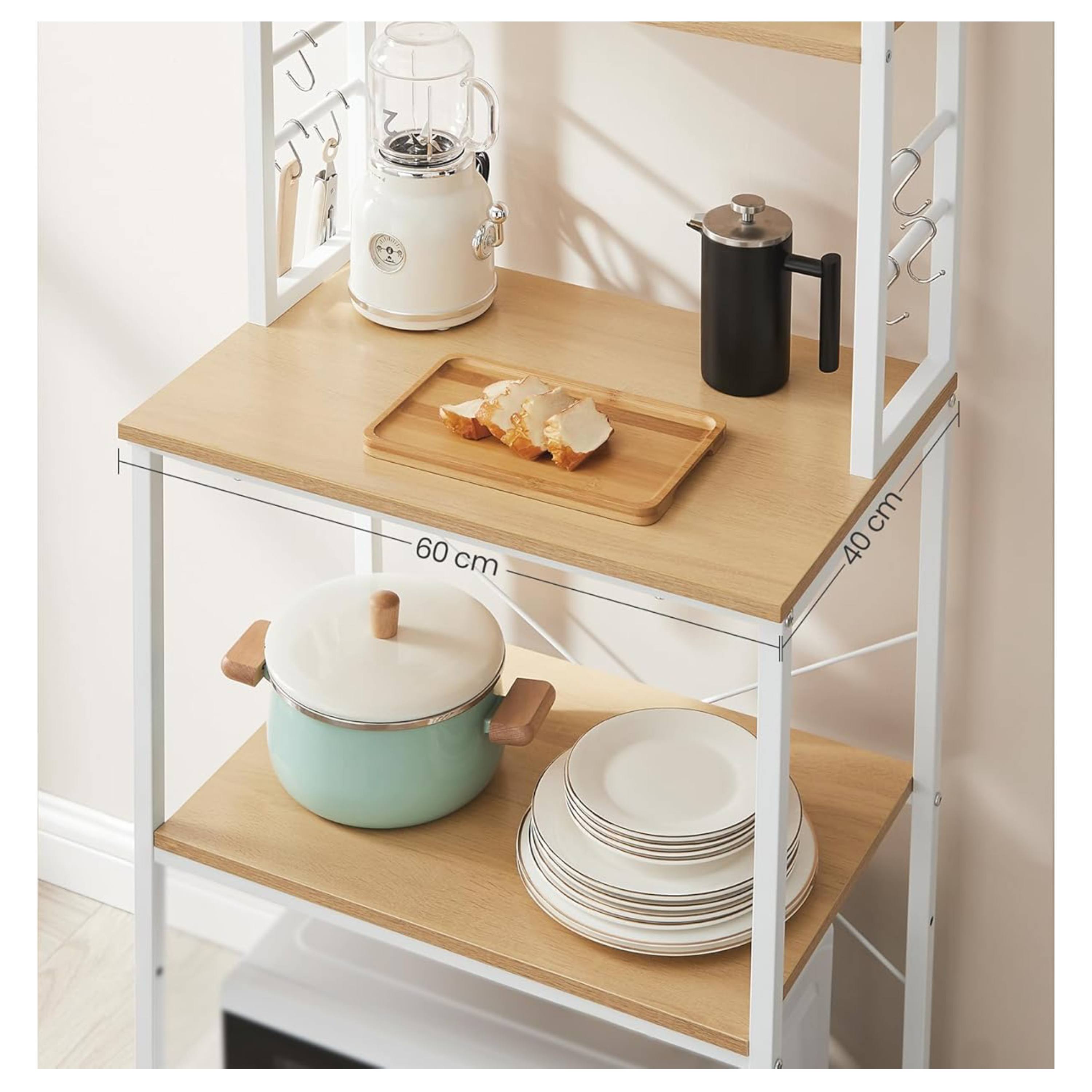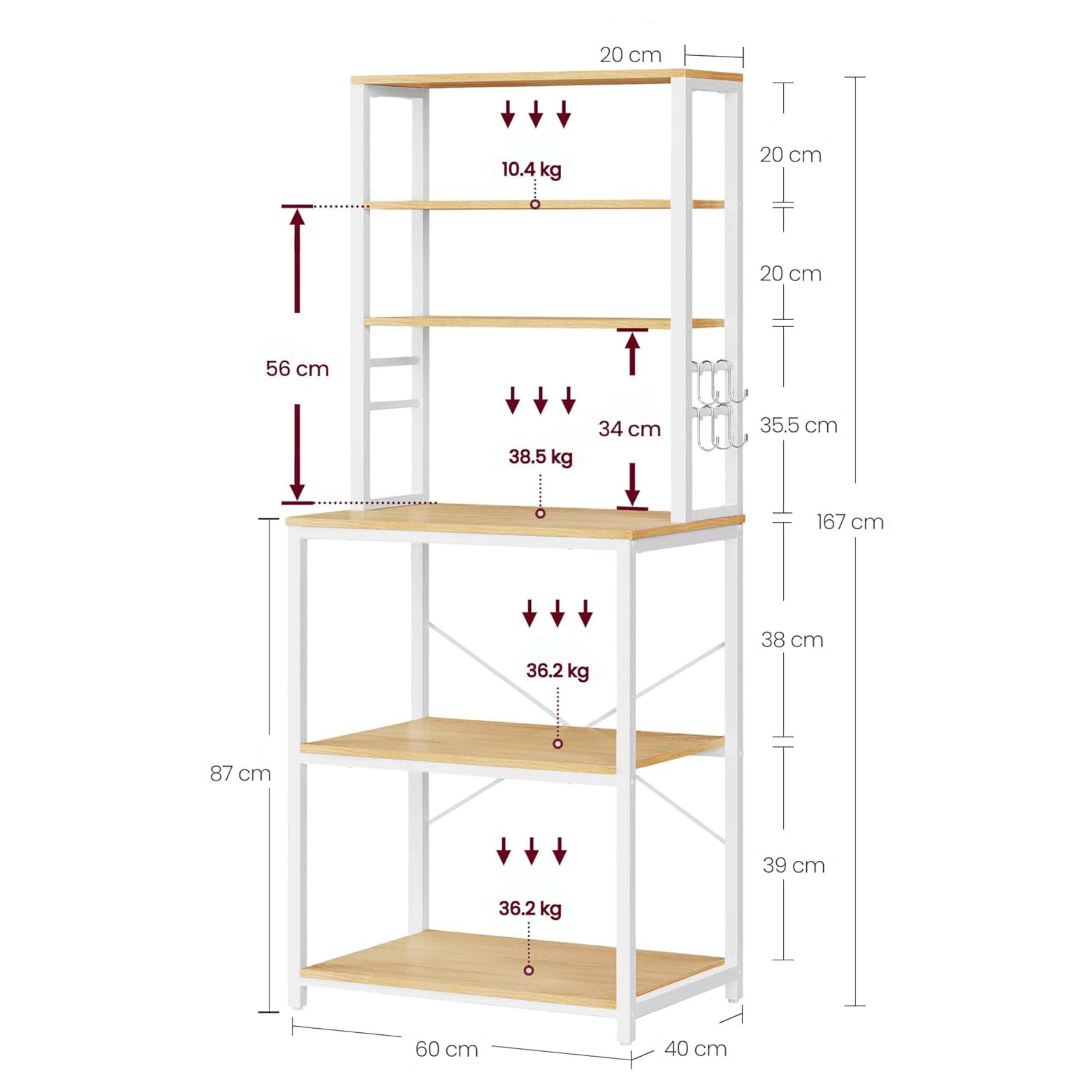 Disponuje 3 menšími policami ideálnymi na korenie, riad či dózy s potravinami. Má pracovnú plochu, ktorú možno využiť na umiestnenie kávovaru, hriankovača a iných spotrebičov. Ďalej sú k dispozícii 2 veľké police, ktoré sú ideálne na umiestnenie mikrovlnky či mini rúry. Súčasťou balenia je 6 závesných S háčikov na utierky, chňapky alebo kuchynské náčinie.