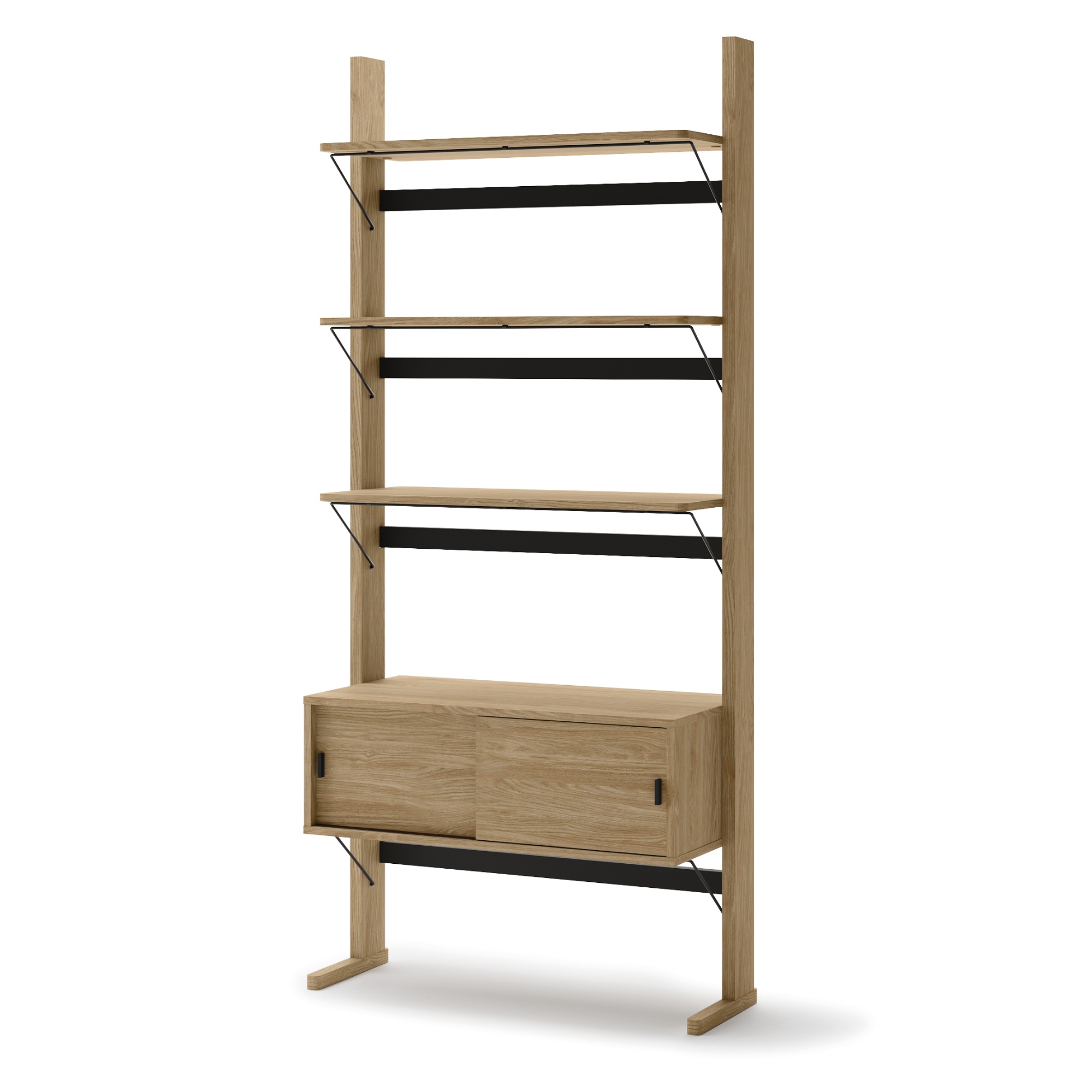 Regál vás nadchne nielen moderným vzhľadom, ale aj vďaka dostatku odkladacieho priestoru, ktorý ponúka. Okrem 3 políc disponuje aj uzatvárateľným priestorom, ktorý sa nachádza za 2 posuvnými dvierkami. Na ľahšiu manipuláciu sú dvierka vybavené praktickými rúčkami.