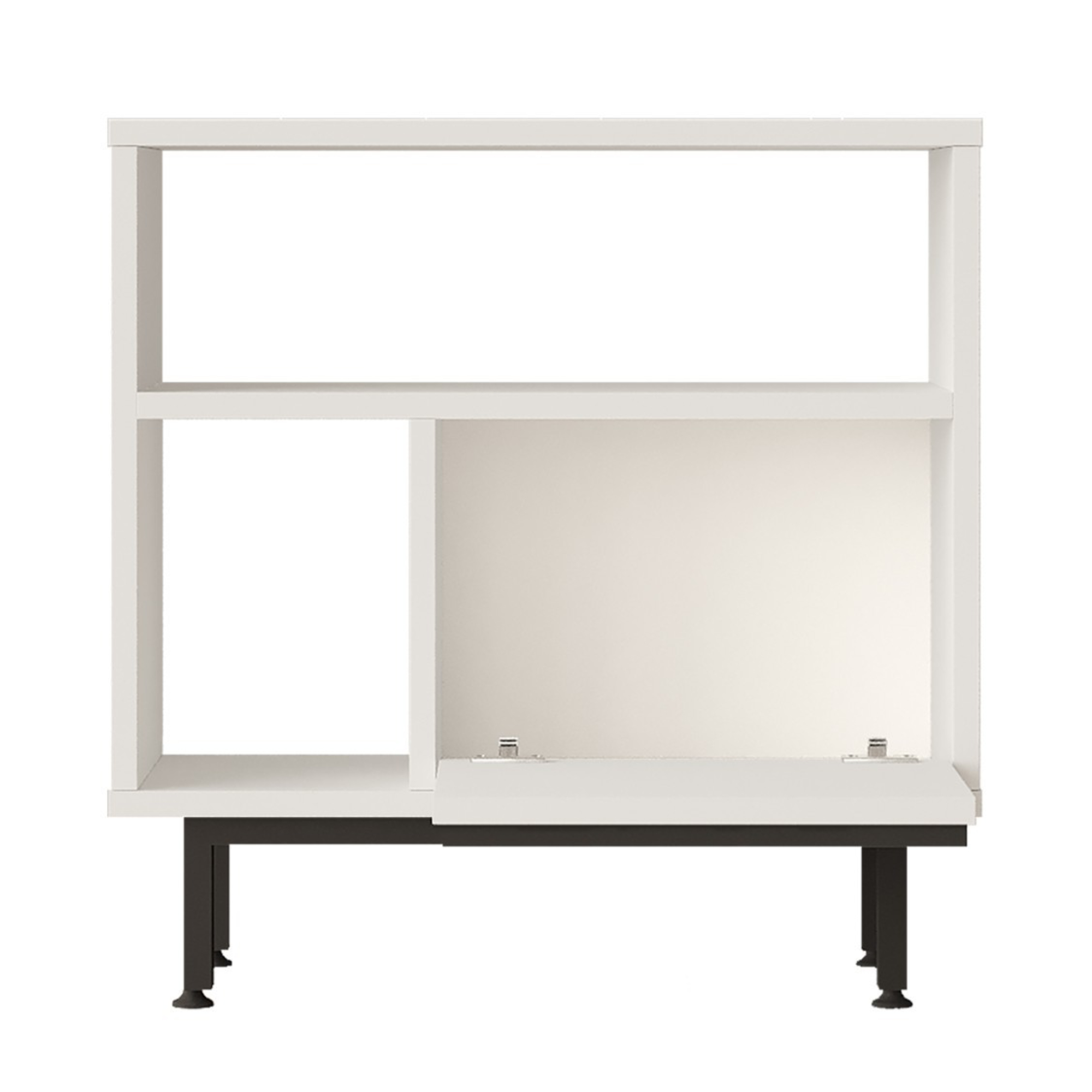 Regál ponúka dostatok odkladacieho priestoru. Jeho súčasťou sú aj výklopné dvierka, ktoré sú na ľahšiu manipuláciu vybavené praktickou rúčkou.