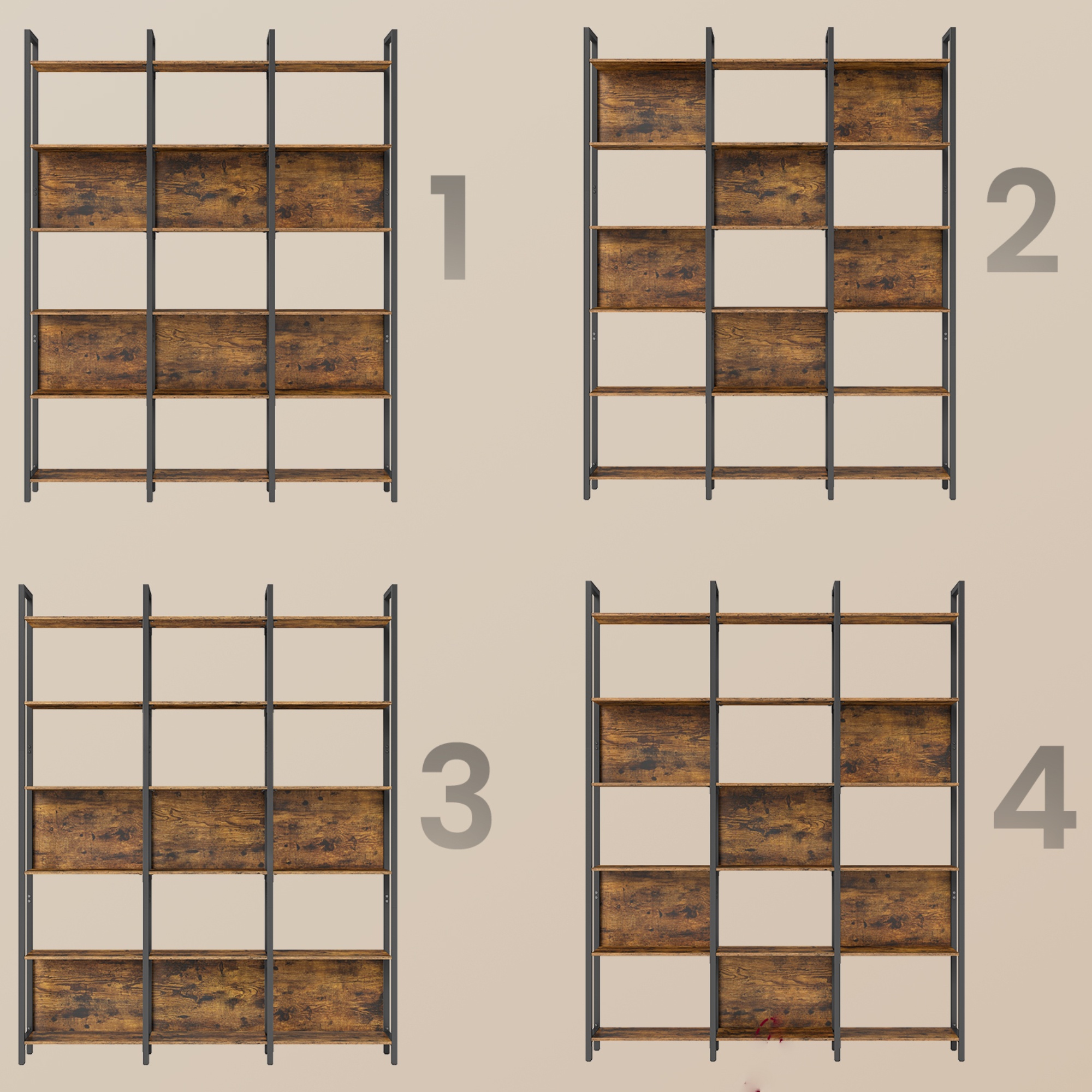 Súčasťou regálu je 18 políc a 6 zadných panelov, ktoré môžete umiestniť podľa vašich preferencií. Jeho konštrukcia je vyrobená z kovu a doplnená prvkami z ľahko udržiavateľnej laminovanej drevotrieskovej dosky. Regál má nastaviteľné nožičky, ktoré prispievajú k jeho stabilite.