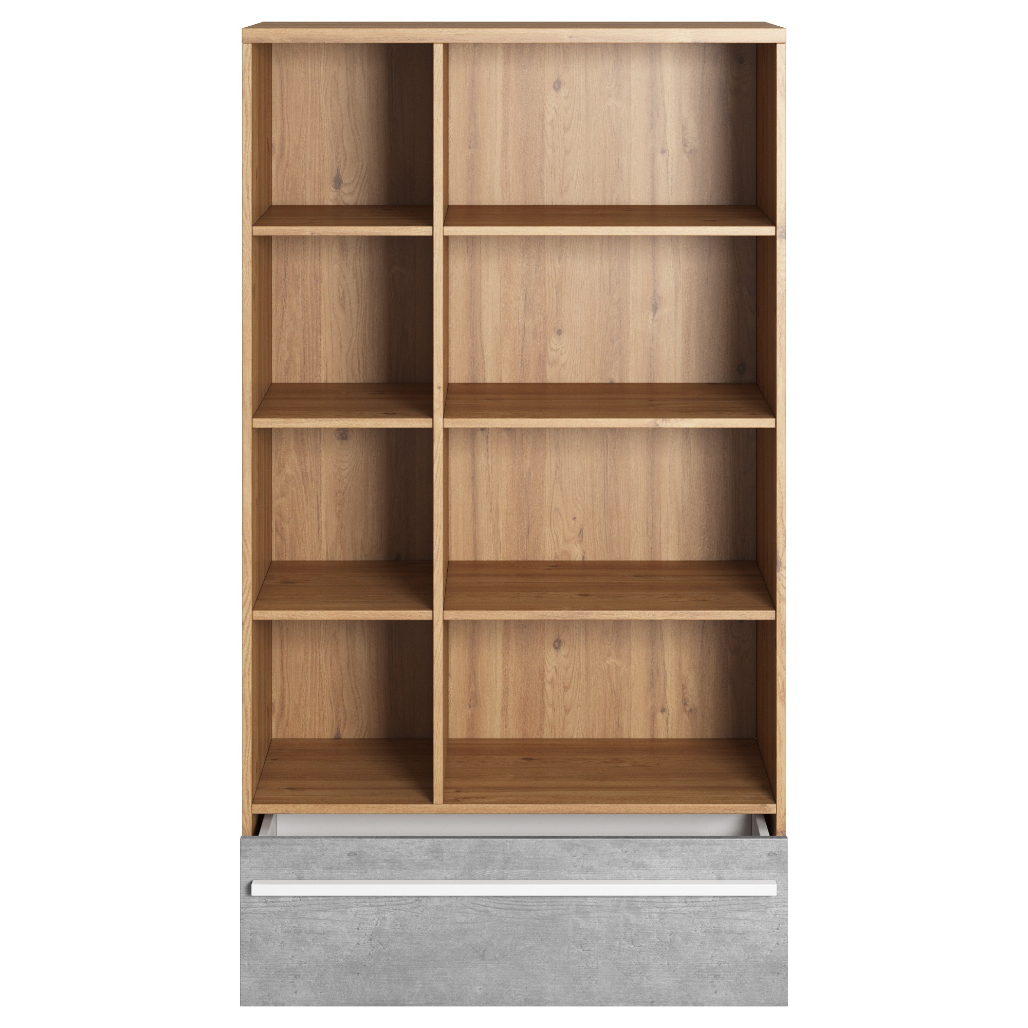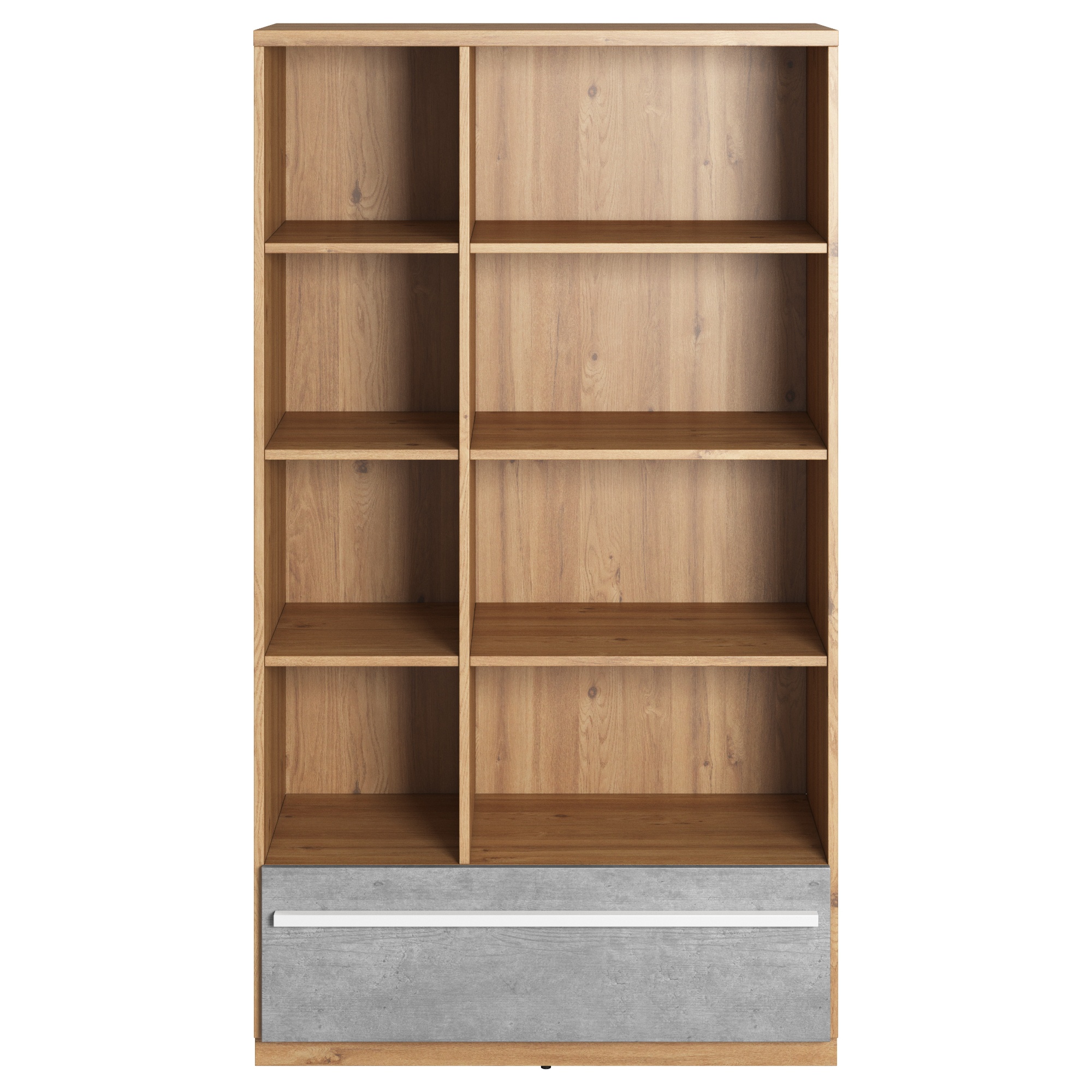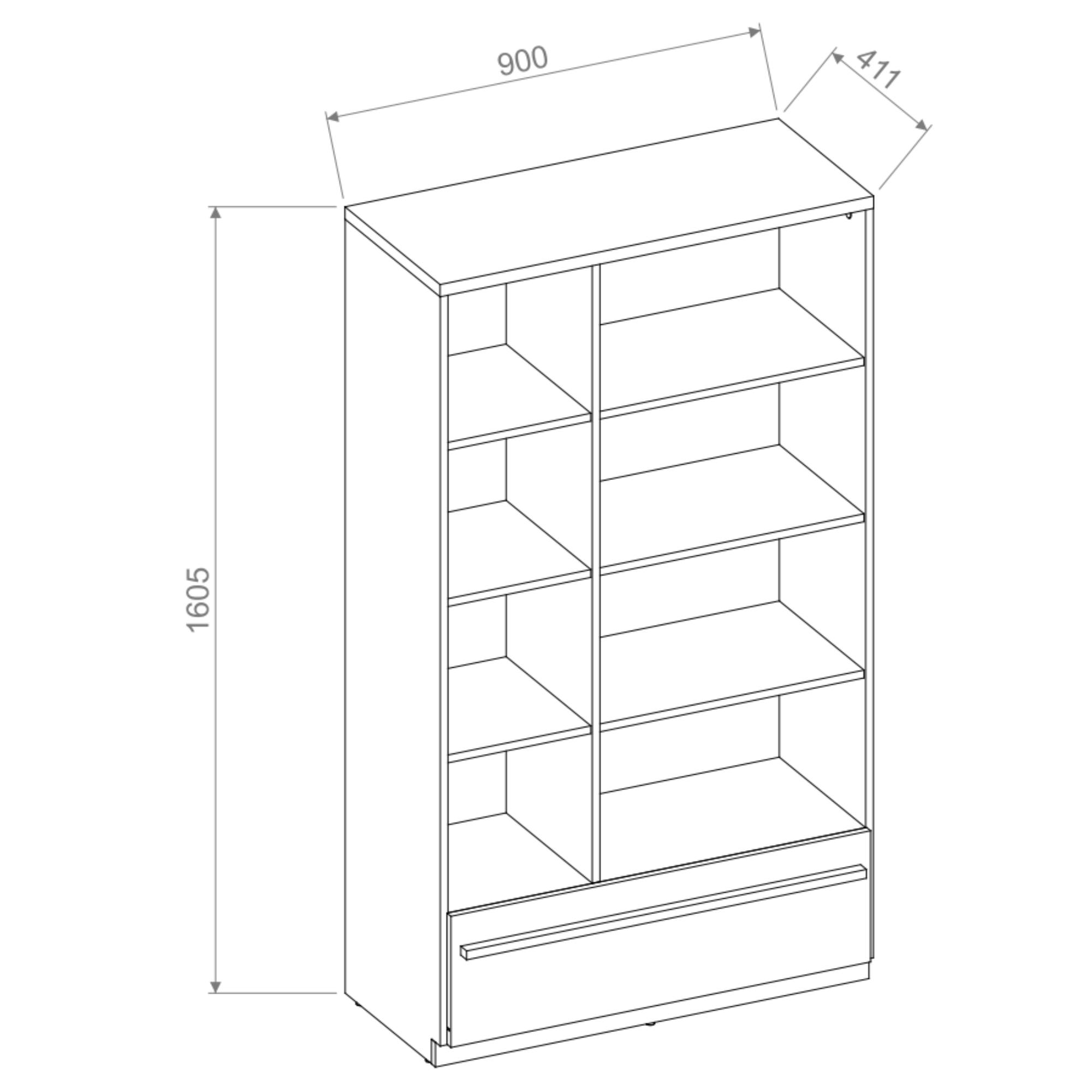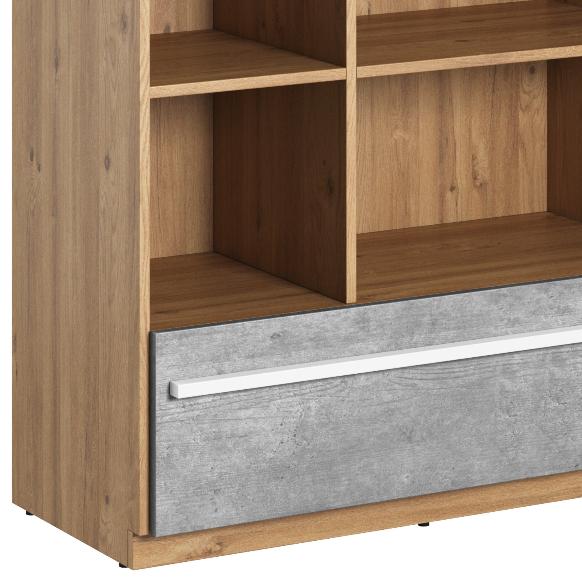 Moderný regál PLANO sa bude pekne vynímať nielen v detskej či študentskej izbe. Vďaka svojmu čistému dizajnu a praktickým rozmerom ho môžete umiestniť aj do vašej spálne. Tento dizajn definuje kombinácia dekorov duba nash, betónu a odtieňa bielej farby, čo v miestnosti pôsobí príjemným dojmom. Dostatok úložného priestoru nájdete v šiestich otvorených policiach. Tu môžete uložiť rôzne dekorácie, ale aj knihy. Dolná časť navyše disponuje zásuvkou, kam môžete umiestniť predmety, ktoré nechcete mať priamo na očiach. Laminovaný drevený materiál sa ľahko udržiava. Regál možno kombinovať s ostatnými druhmi nábytku z programu PLANO.