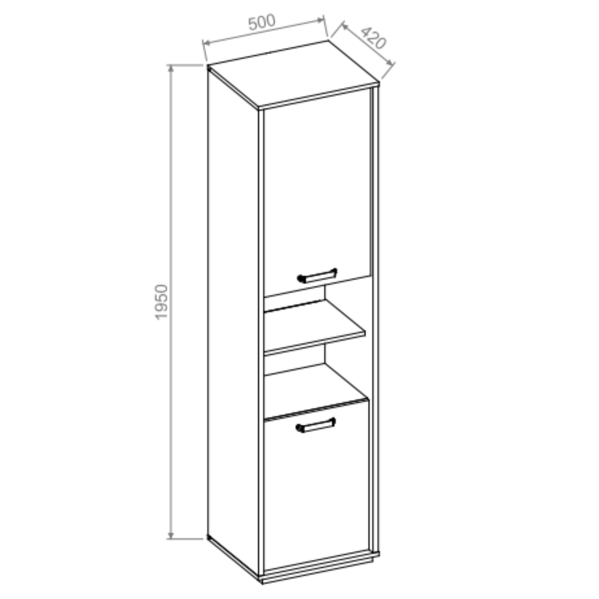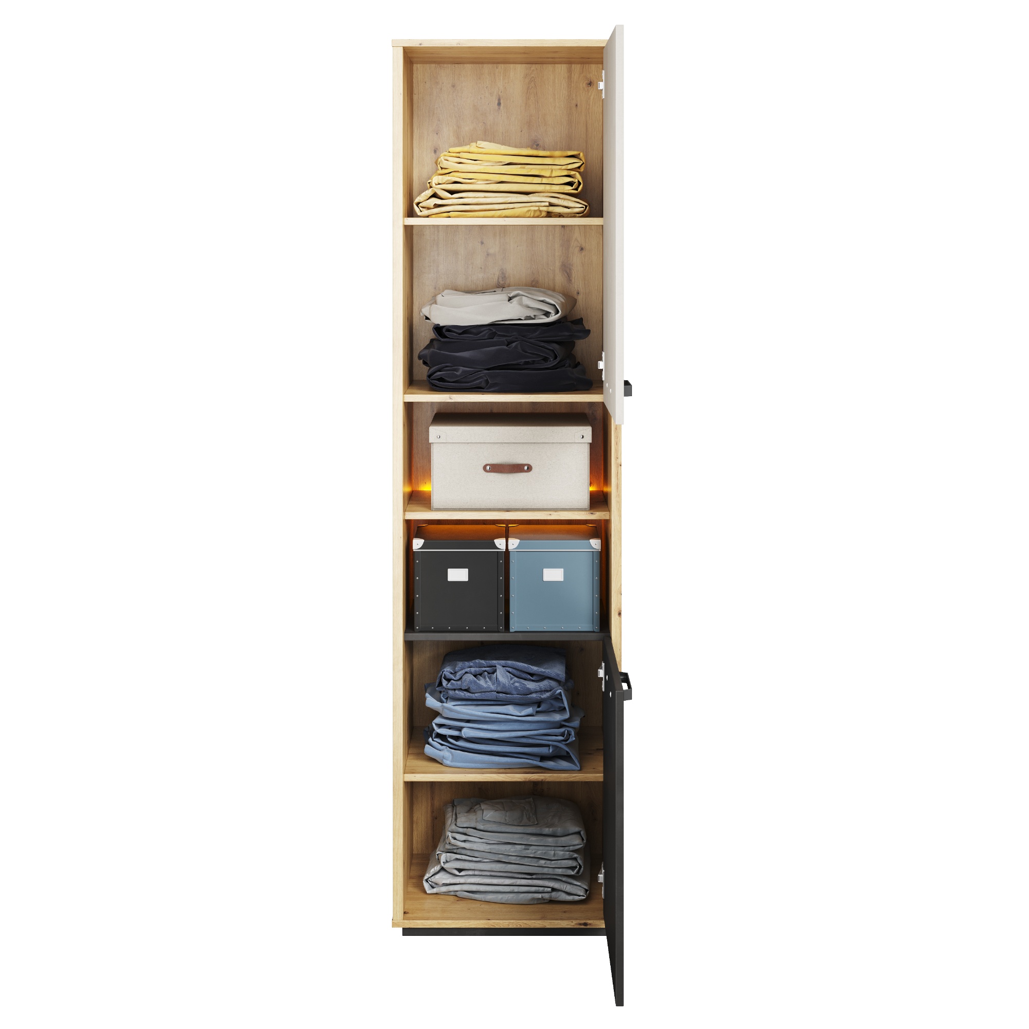 Za 2 otočnými dverami nájdete 4 užšie vložené police na oblečenie či lôžkoviny. Uprostred sa nachádza jedna otvorená polica s úsporným LED osvetlením, ktoré osvecuje policu a ponúka tak dokonalý priestor na vystavenie dekorácií.