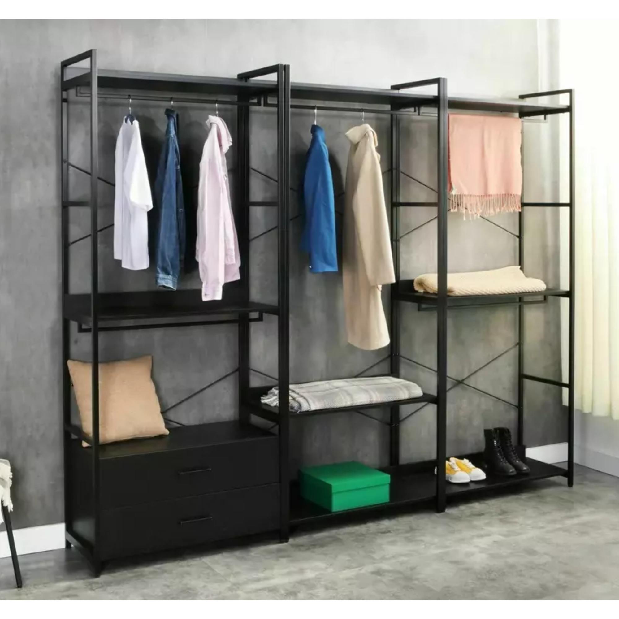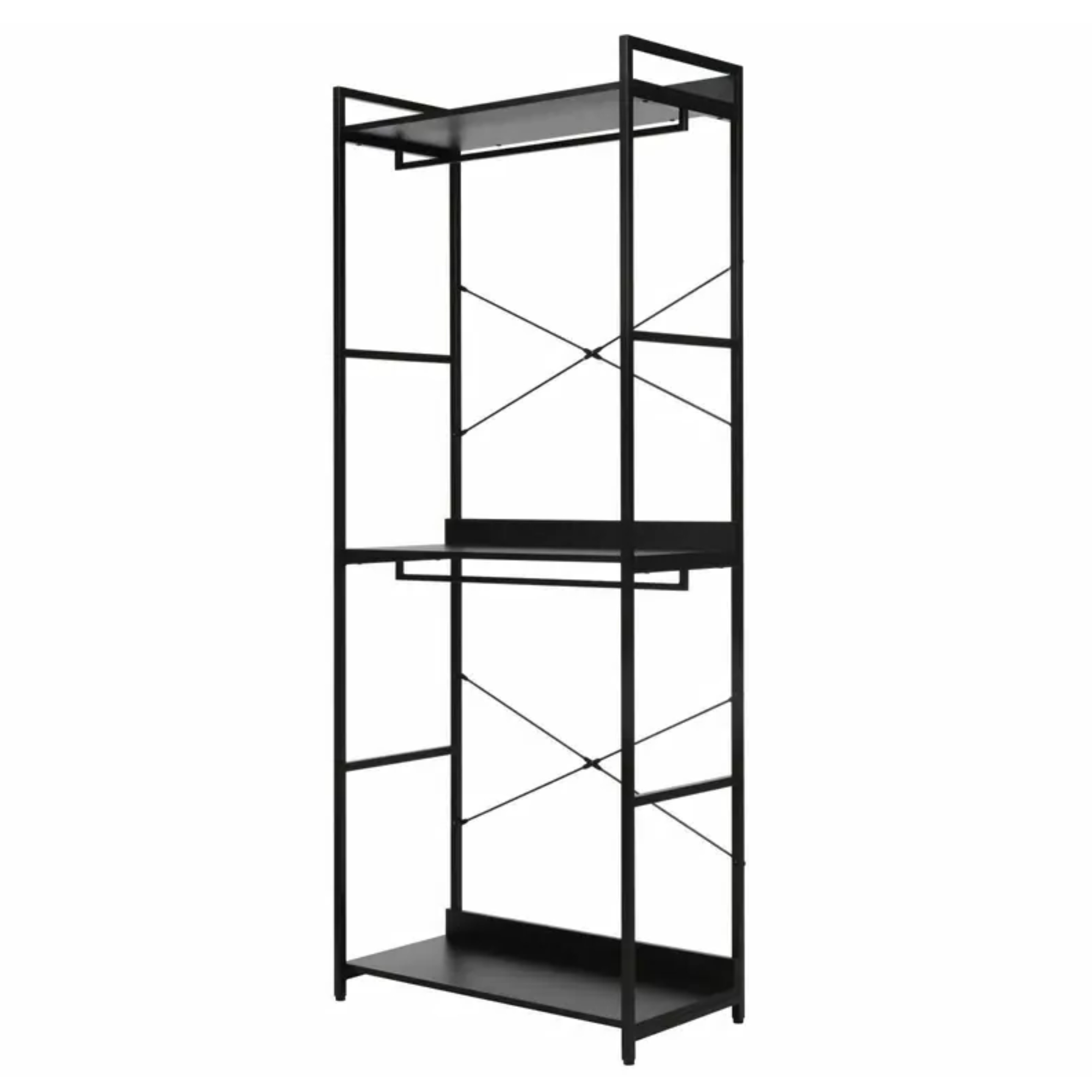 Za svoju stabilitu vďačí tento regál pevnej konštrukcii vyrobenej z kovu. Konštrukciu dopĺňajú tri police z laminovaného dreveného materiálu a dve praktické šatníkové tyče.