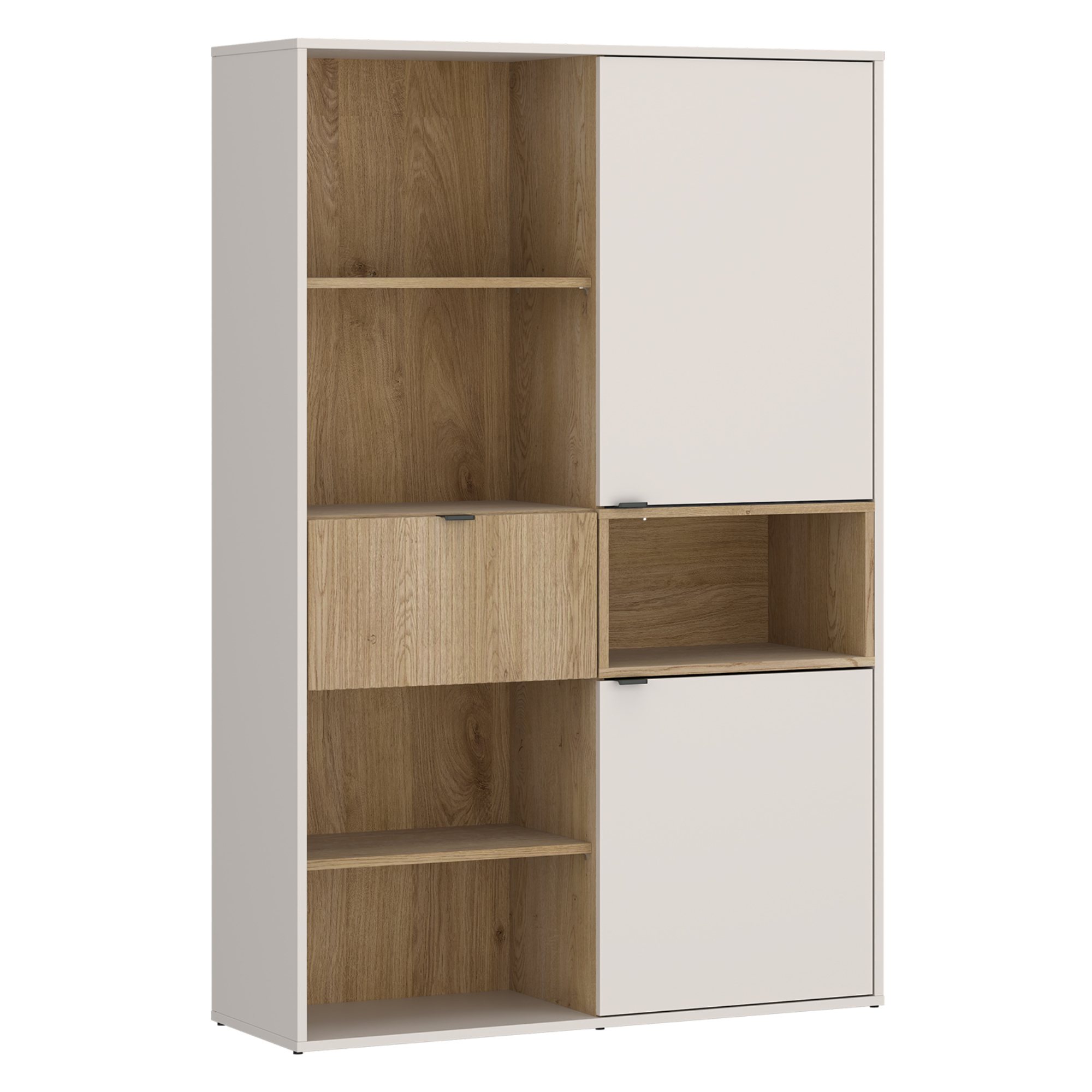 Regál kombinuje otvorený a uzavretý úložný priestor. Na ľavej strane nájdete 2 otvorené police a 1 zásuvku. Pravá strana disponuje dvierkami, za ktorými sa ukrývajú ďalšie police. Ďalej je doplnená otvorenou policou, ktorá môže slúžiť na vystavenie dekorácií, kníh, alebo pohárov. Nechýbajú kovové rúčky na pohodlné zaobchádzanie. Kombinácia kamennej béžovej a dekora duba cremona vytvára vyladené spojenie, ktoré prinesie štýl do každého interiéru. Dub cremona so svojou výraznou kresbou dreva navyše dodá nádych prírody.