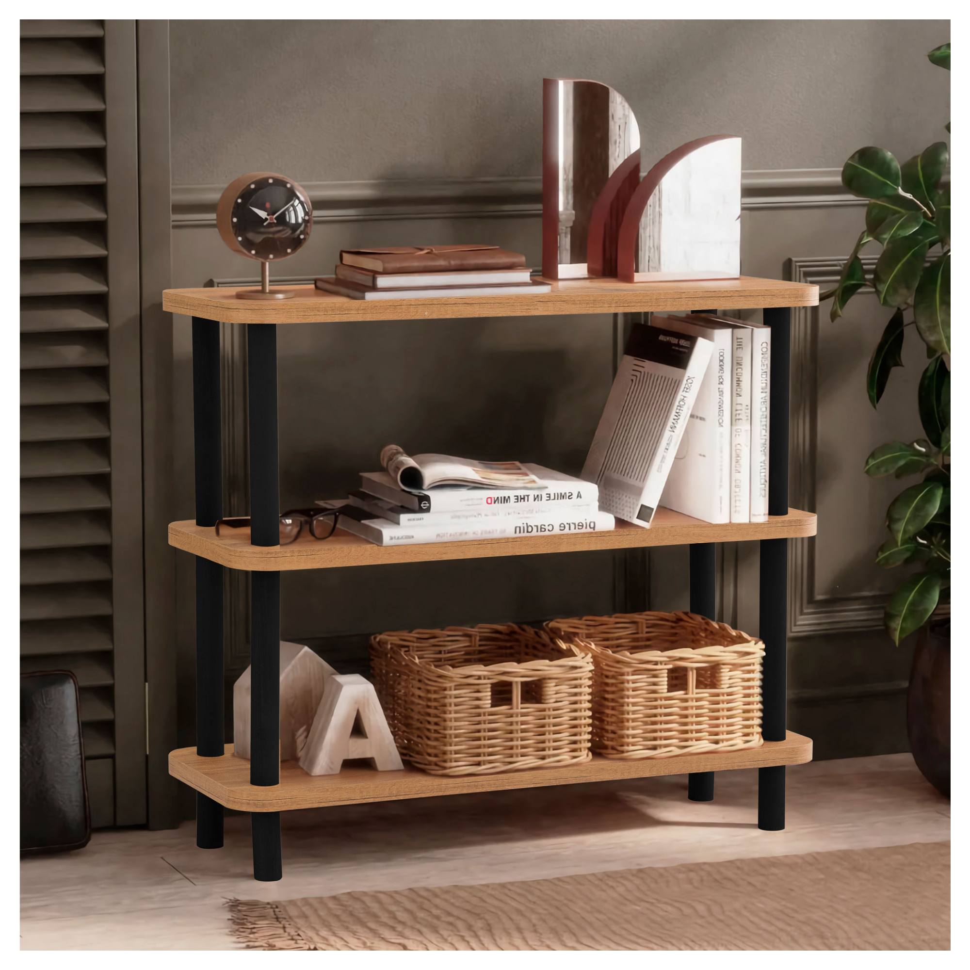 Konštrukcia ponúka celkom 3 priestranné, odkladacie plochy na prehľadné usporiadanie kníh, dokumentov alebo vystavenie najrôznejších dekorácií. Jednotlivé police sú vyrobené z na údržbu nenáročnej laminovanej drevotriesky v prírodnom dekore borovice atlantic. Nohy a stĺpiky sú pre väčšiu pevnosť a odolnosť vyhotovené z masívneho hrabového dreva.