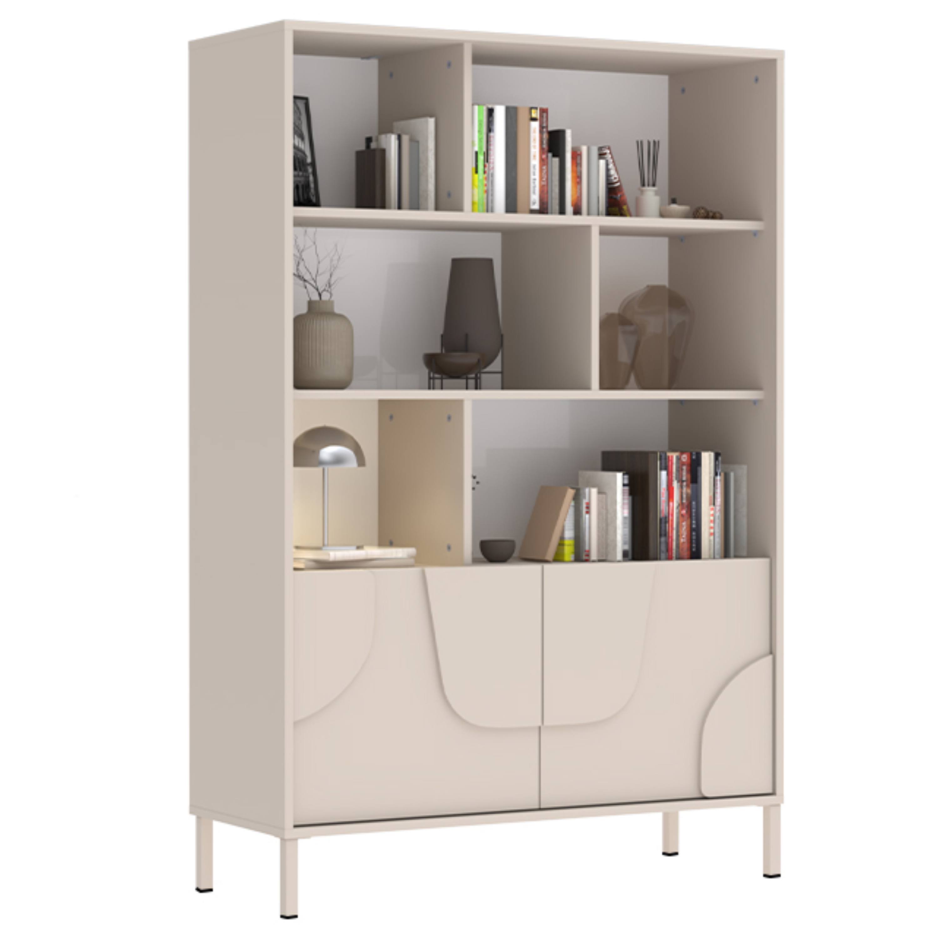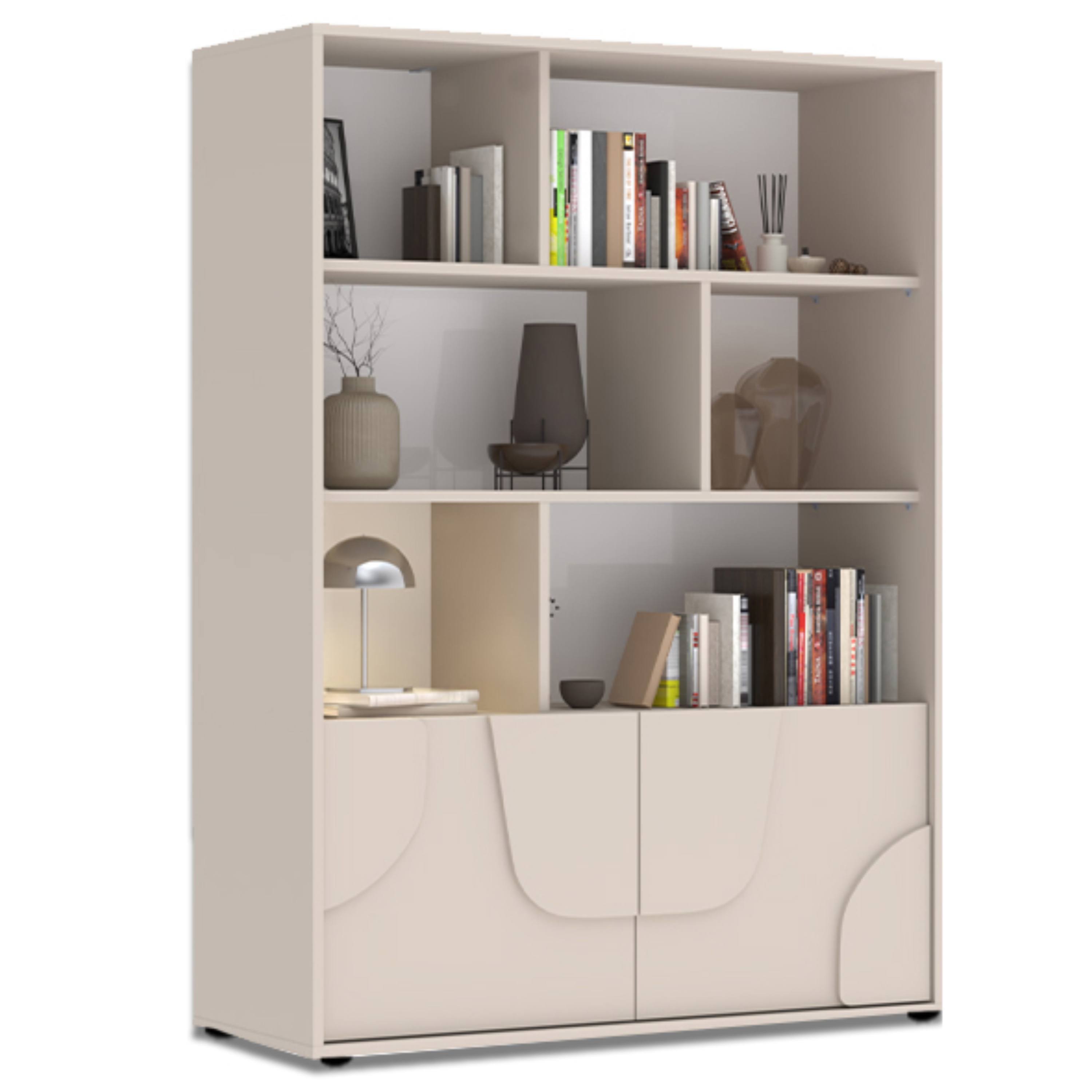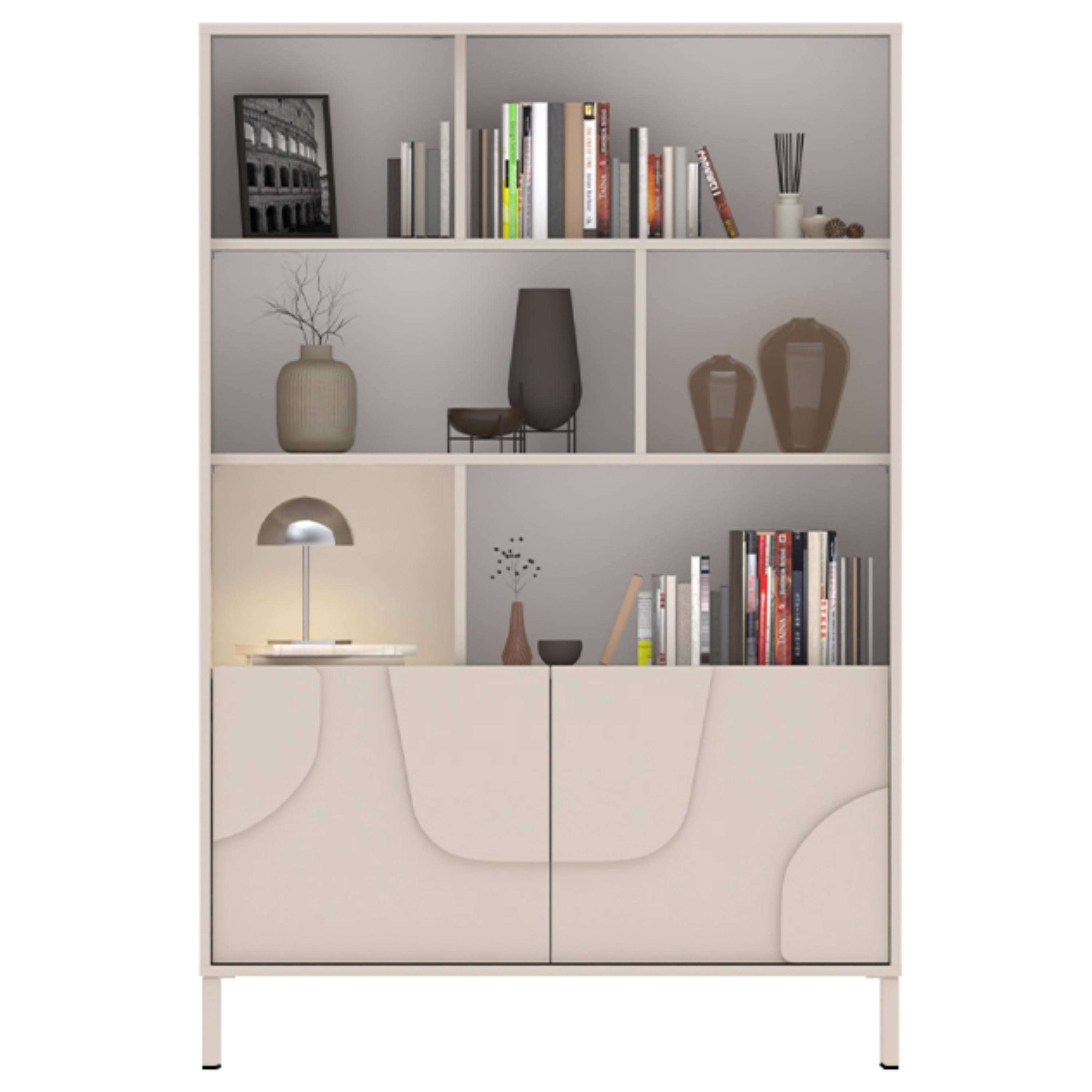 Vyrobený je z laminovaných drevotrieskových dosiek, ktoré sú ľahko udržiavateľné. Ladený je do odtieňa kašmírovej farby, ktorá interiér zútulní. Dostatok úložného priestoru potom nájdete v otvorených priehradkách a za dvierkami. Regál je možné doplniť o menšie plastové nožičky alebo o väčšie kovové nožičky, obe varianty sú súčasťou balenia.