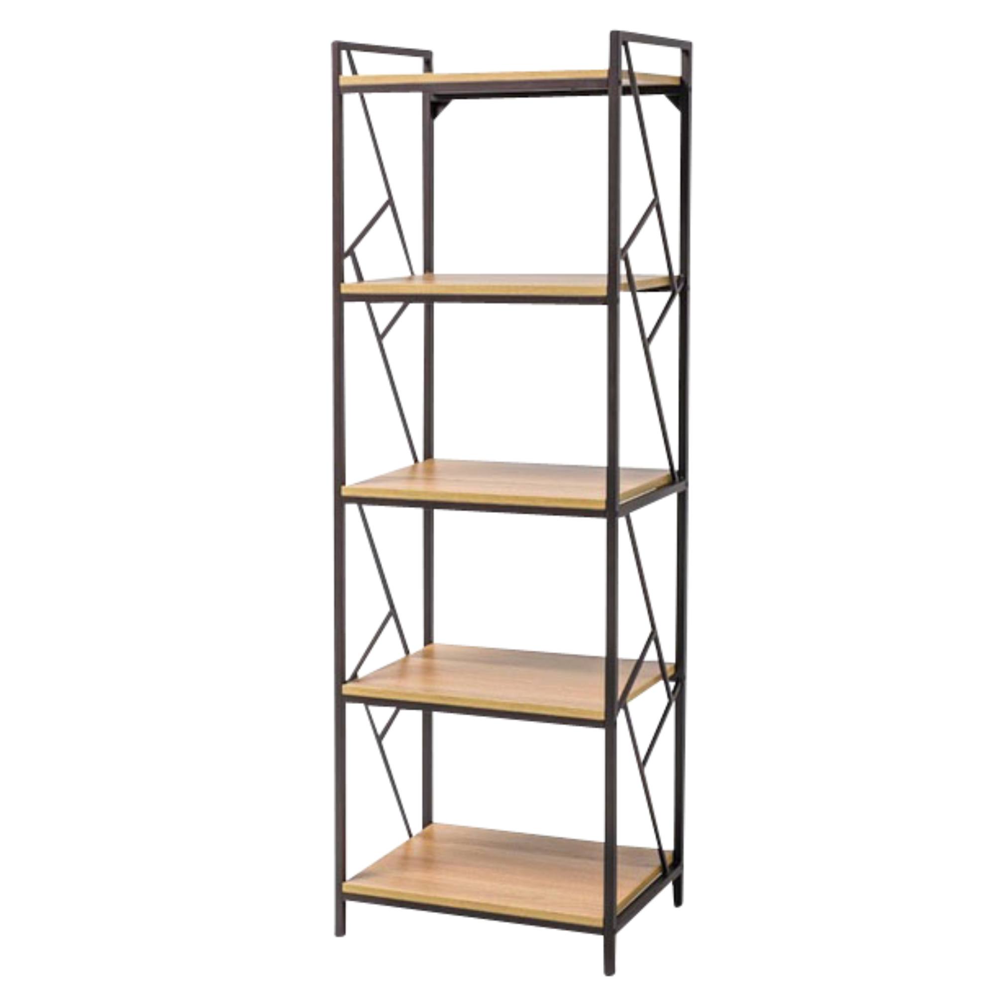 Kovová konštrukcia zaisťuje pevnosť, stabilitu a odolnosť celého regála. Do rámu je zasadených 5 otvorených políc z laminovaného dreveného materiálu v prírodnom dubovom dekore, ktoré ponúkajú dostatok úložného miesta s nosnosťou až 10 kg na jednu policu. Vďaka praktickému spracovaniu do výšky sa skvele hodí aj do malých miestností. Vzhľadom na použitie materiálov je regál nenáročný na údržbu.